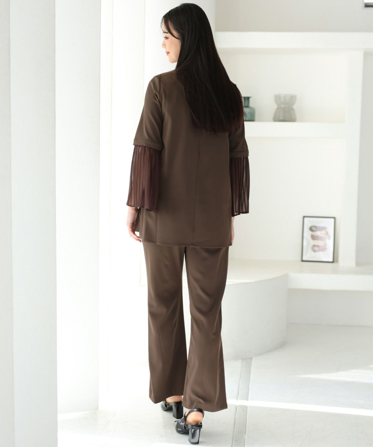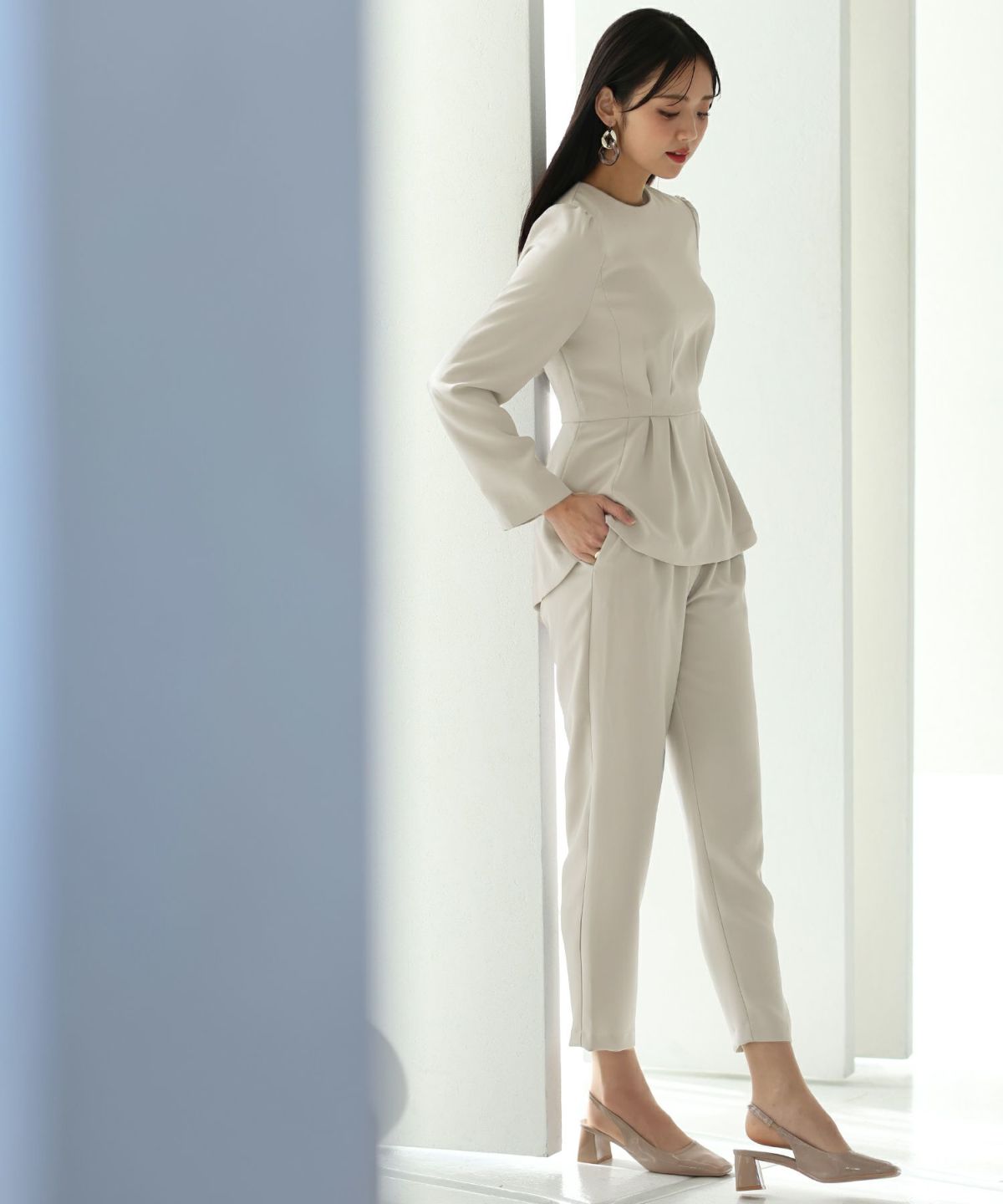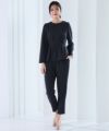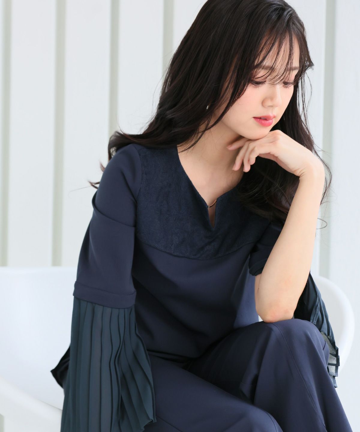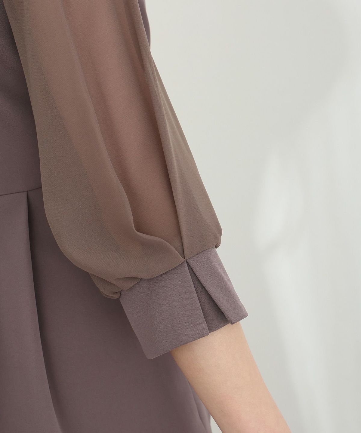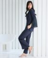 PourVous・atloの長袖パンツドレスは、気品ある袖付きデザインで、肌の露出を抑えつつも女性らしい美しさを引き立てる一着。