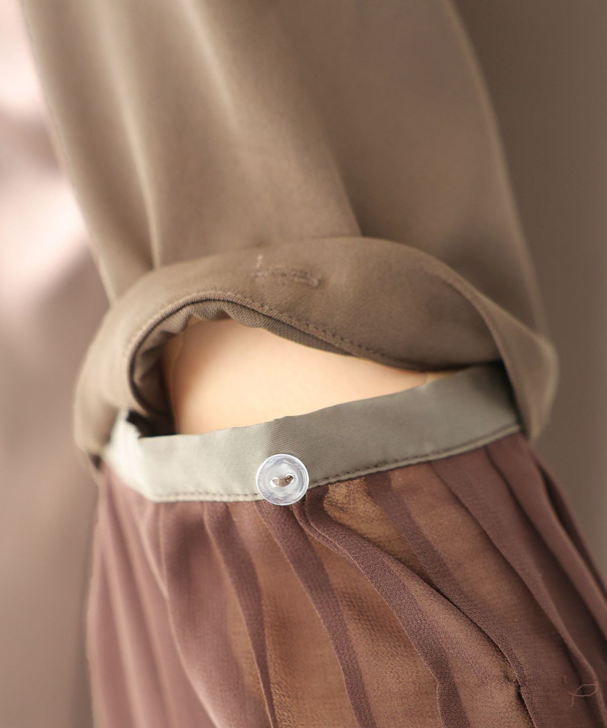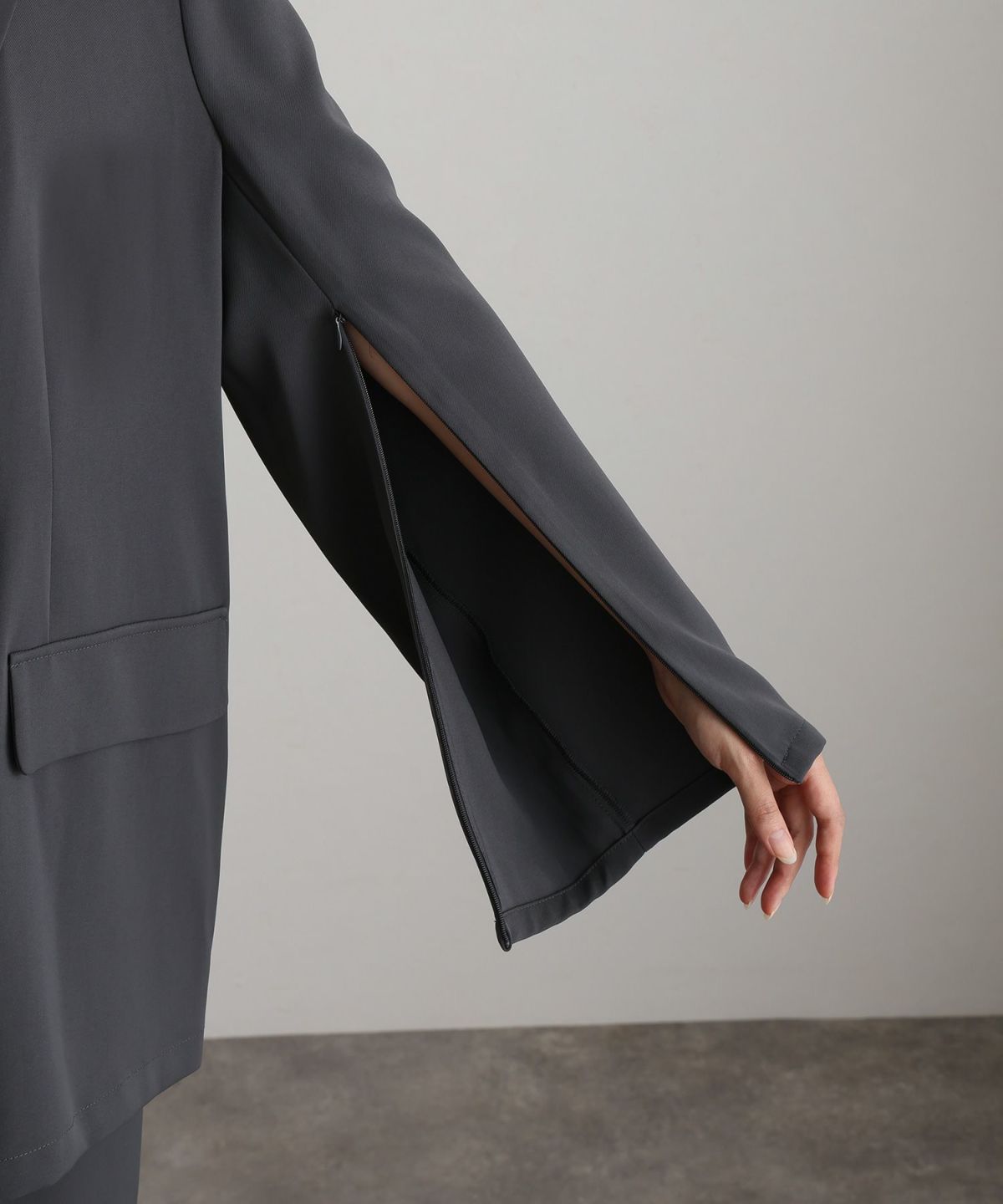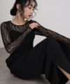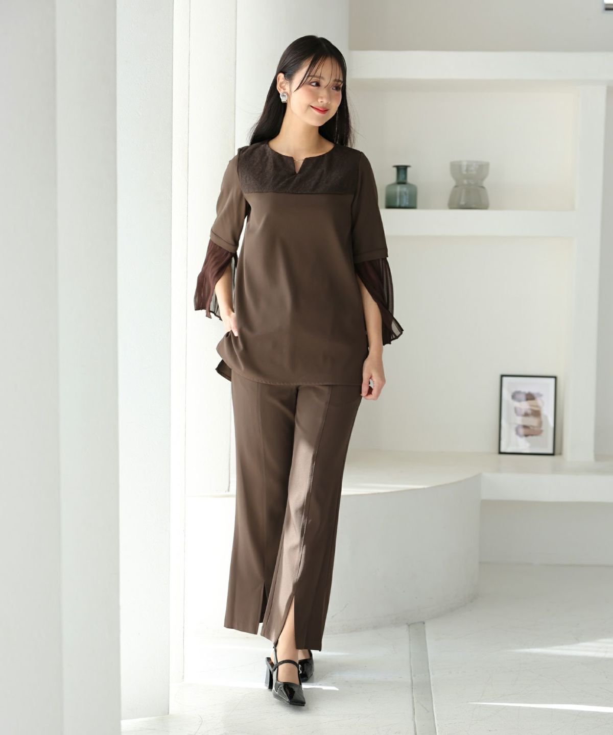 PourVous・atloの長袖パンツドレスは、気品ある袖付きデザインで、肌の露出を抑えつつも女性らしい美しさを引き立てる一着。