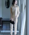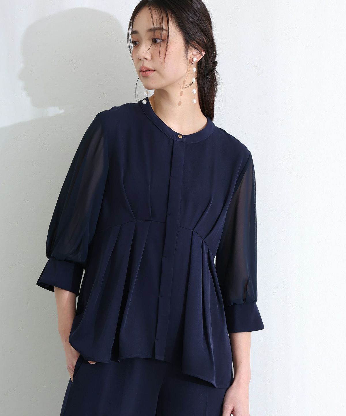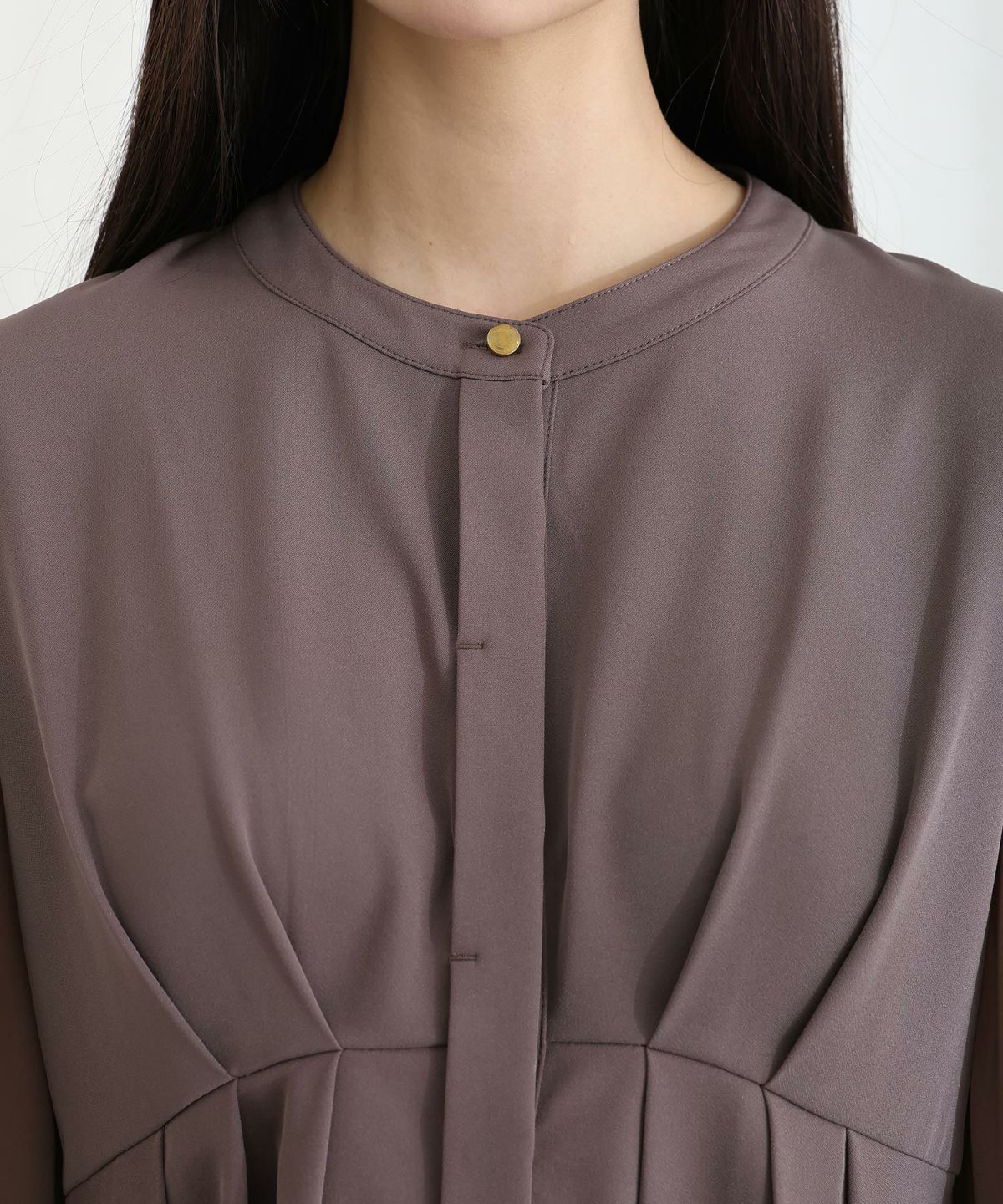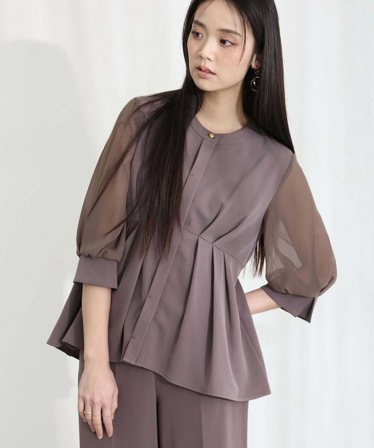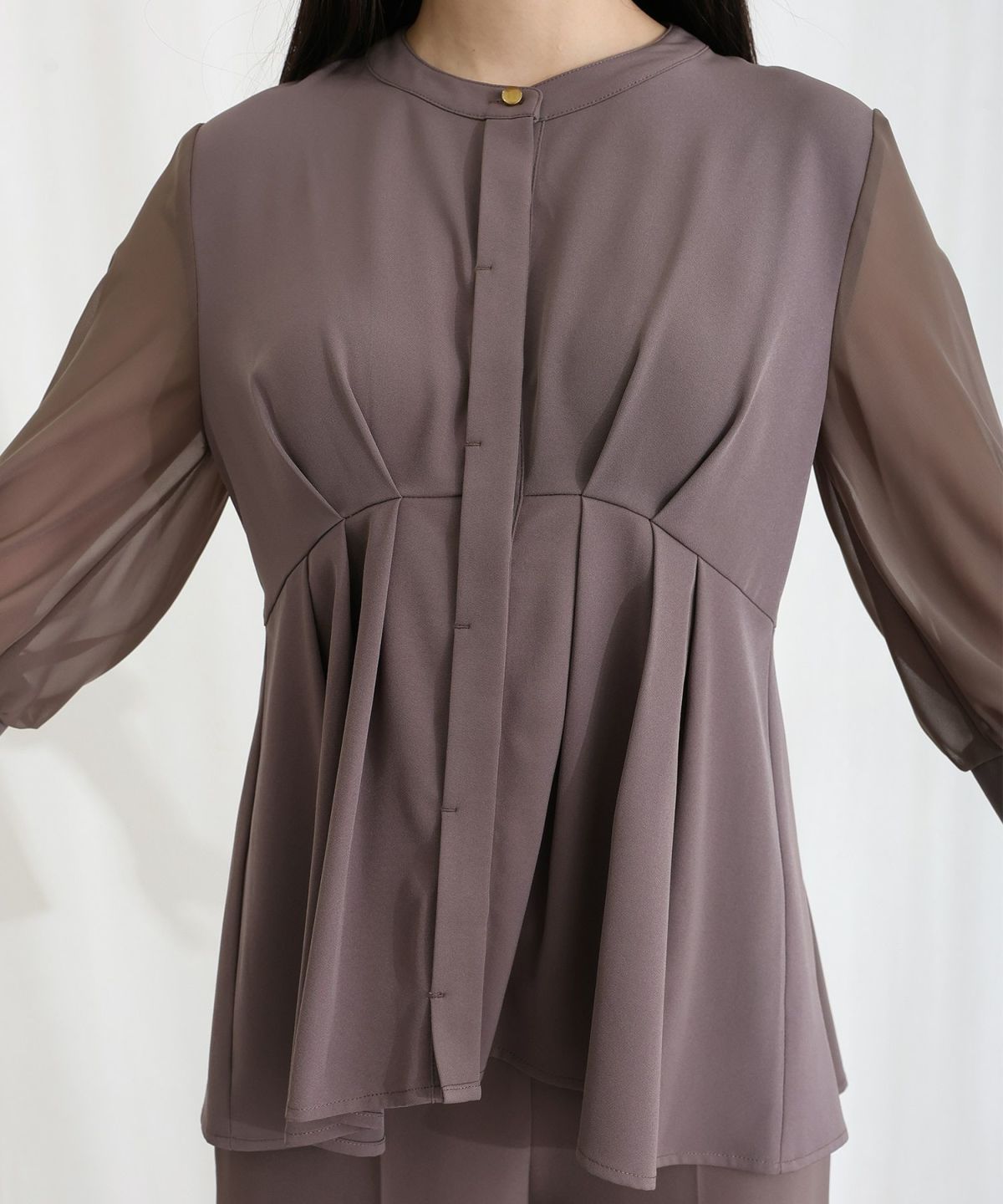 PourVous・atloの長袖パンツドレスは、気品ある袖付きデザインで、肌の露出を抑えつつも女性らしい美しさを引き立てる一着。