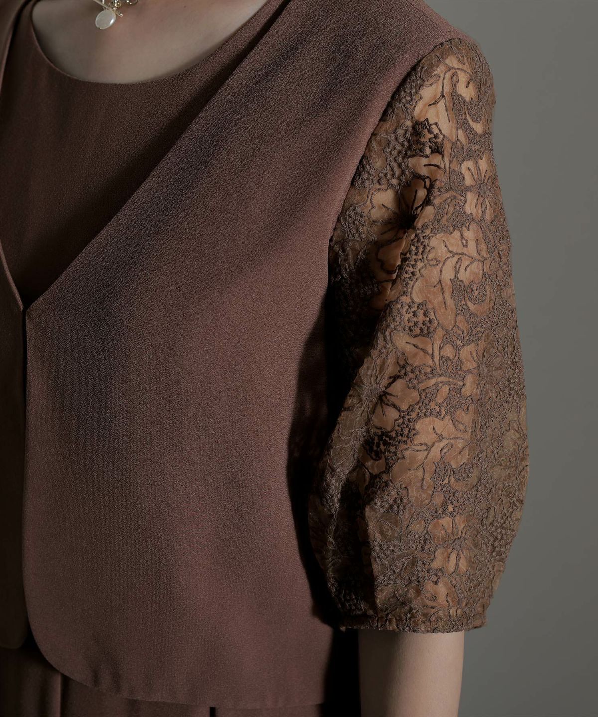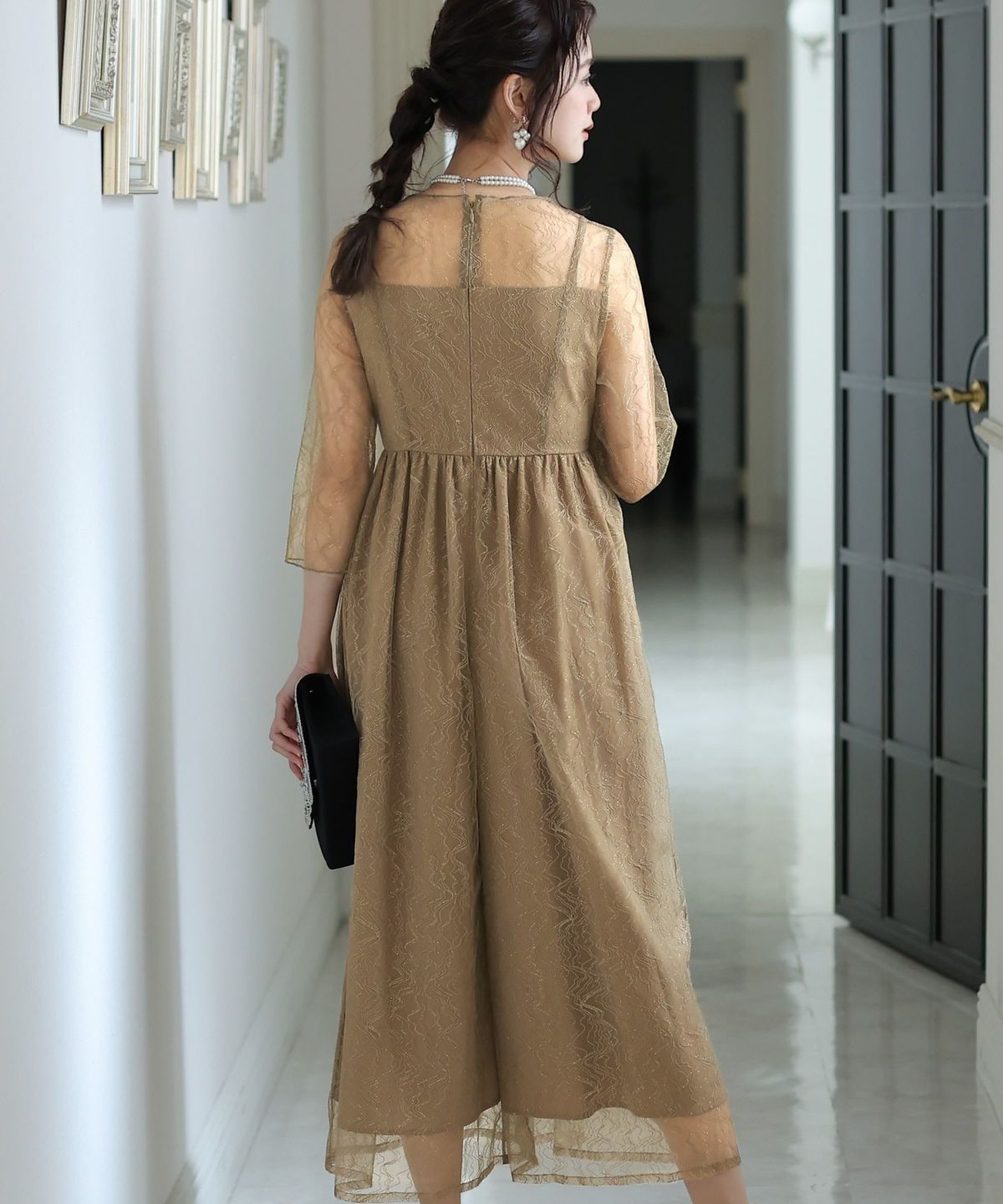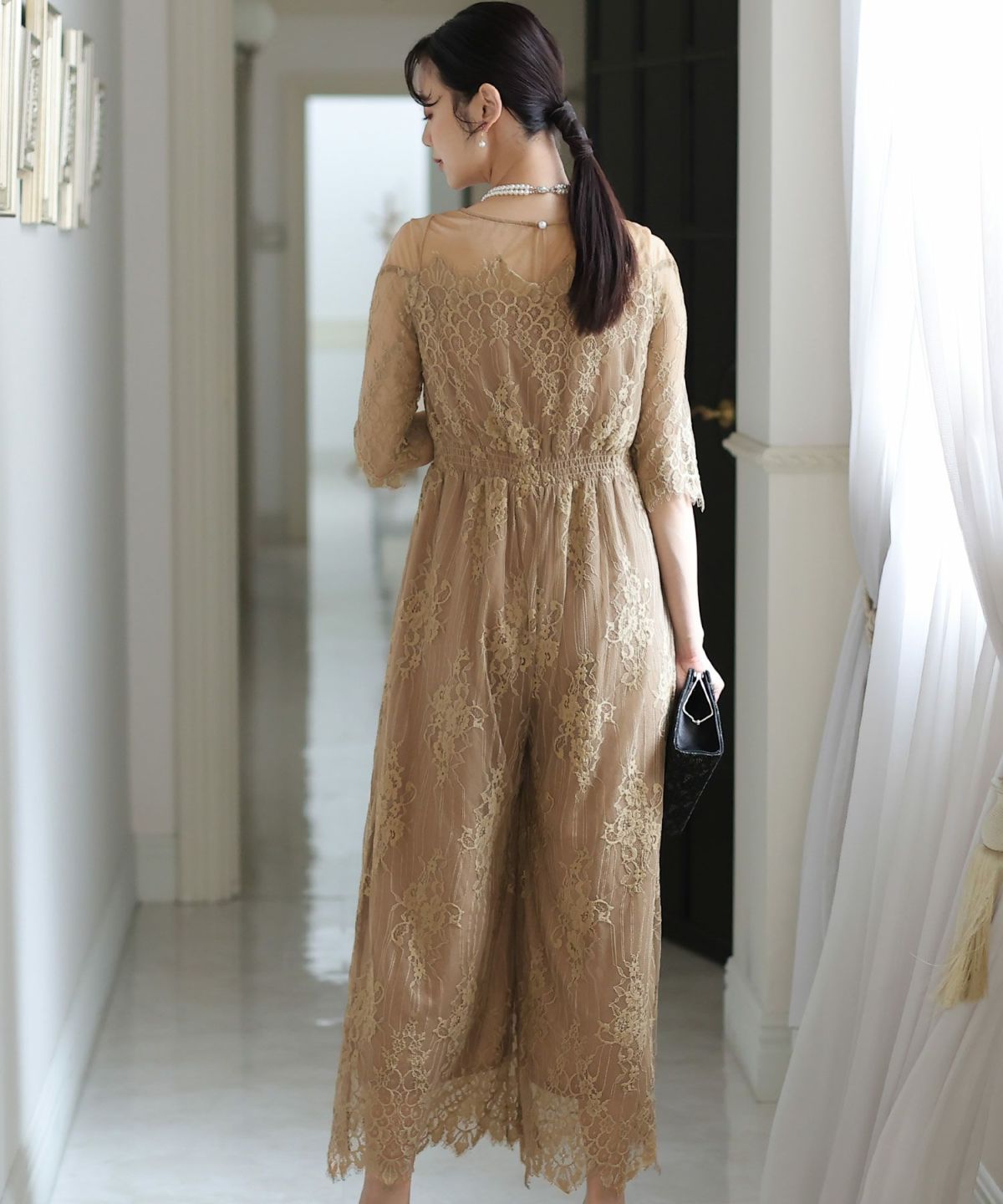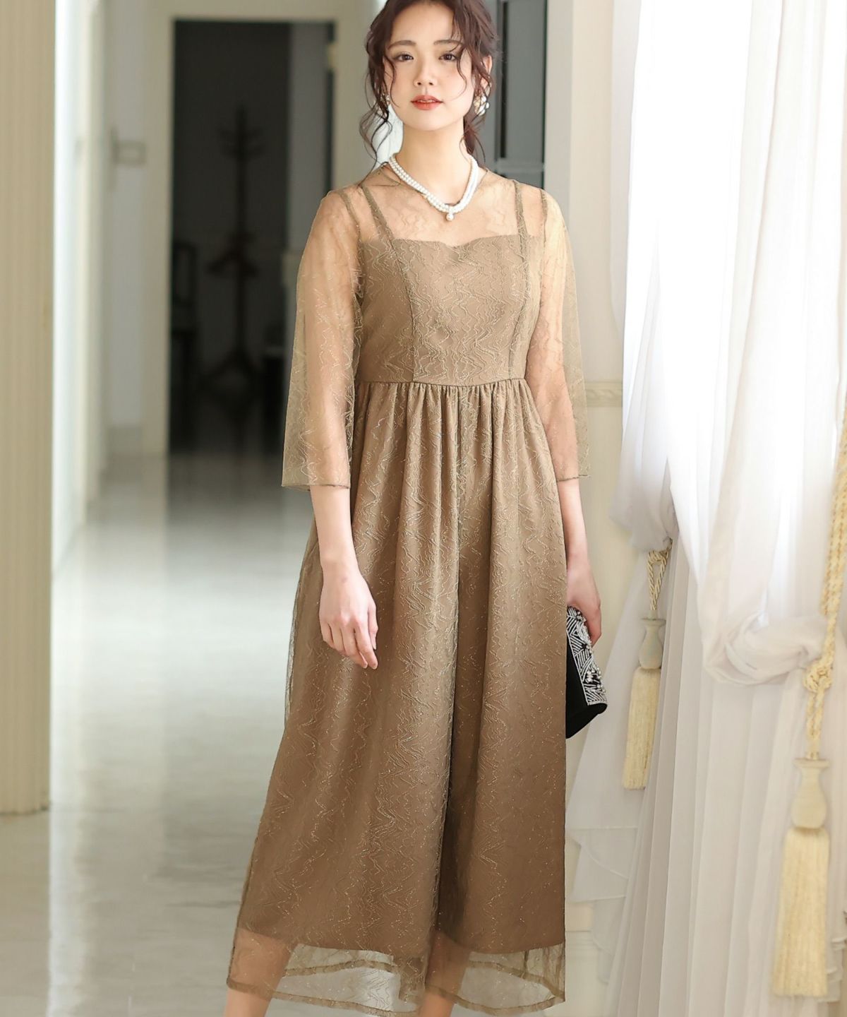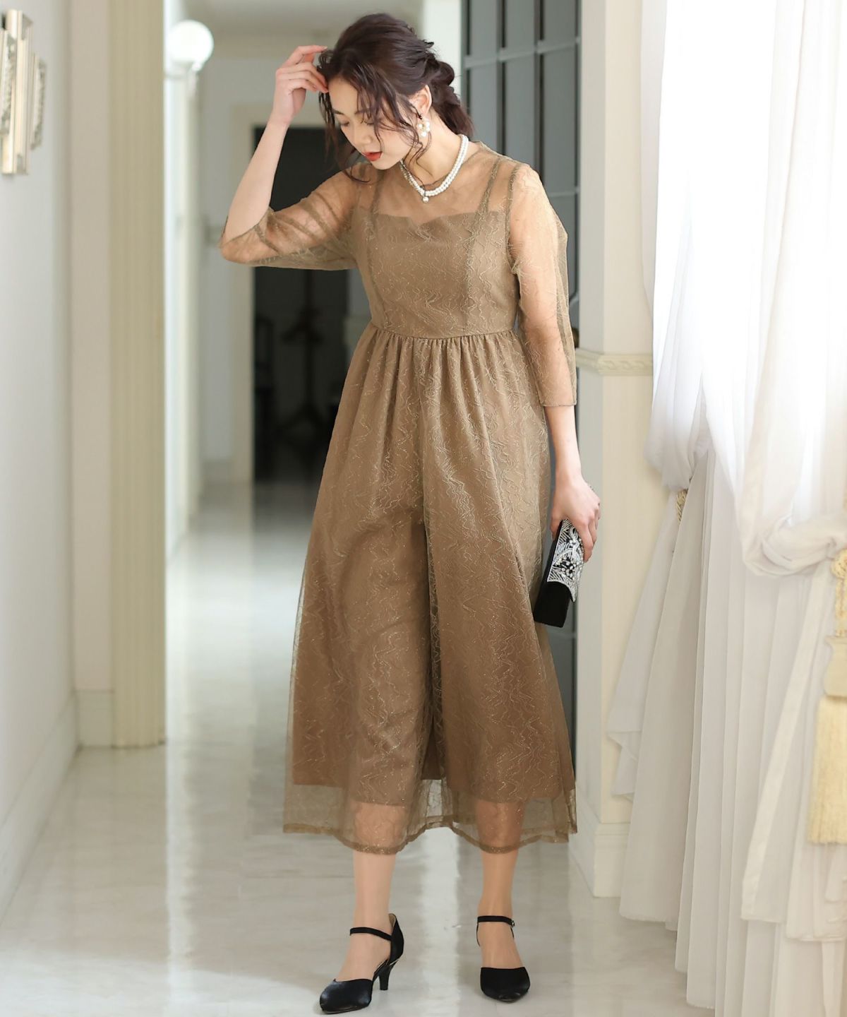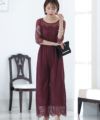 羽織いらずで一枚で華やかに決まる、大人のためのパンツドレスです。