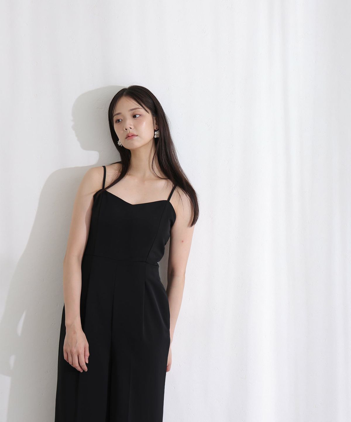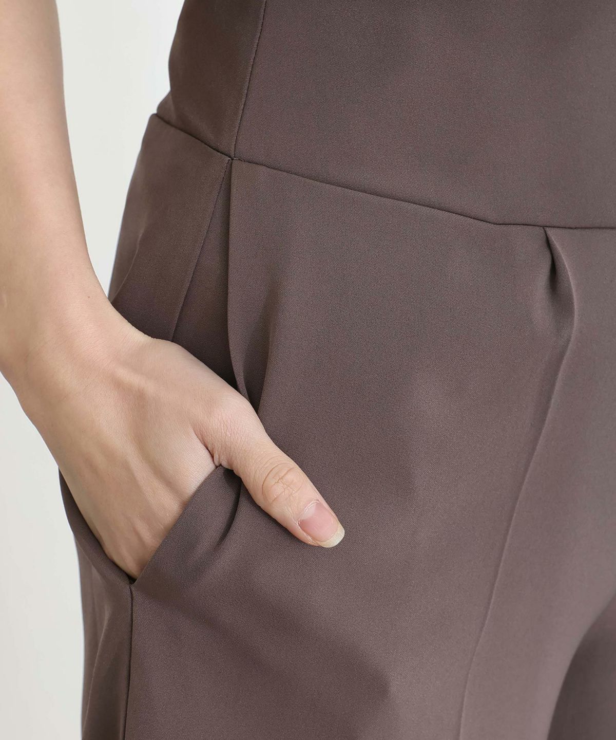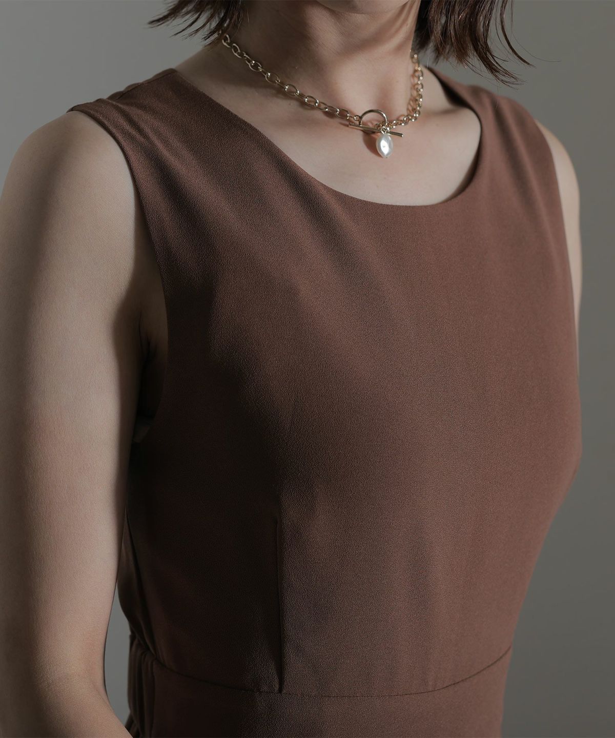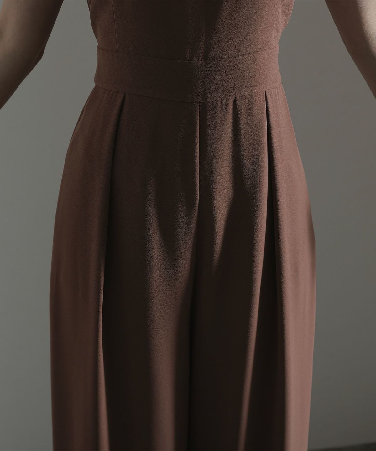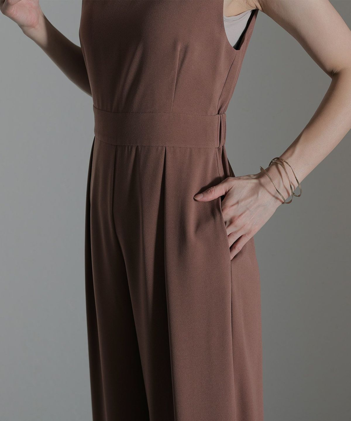 PourVous・atloのノースリーブパンツドレスは、パンツドレスならではの洗練されたシルエットに、肩まわりをすっきり魅せる美しさをプラス。