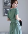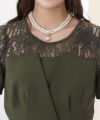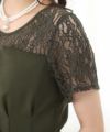 ■デコルテ部分がレースの透け感ですっきり。体型カバーポイント:【二の腕】【脚】【ウエスト】【ヒップ】レースの袖付きでさり気なく二の腕をカバー。付属のウエストリボンで細身効果。