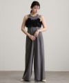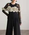 ボリュームフリルのビスチェを主役に、ワイドシルエットのオールインワンと