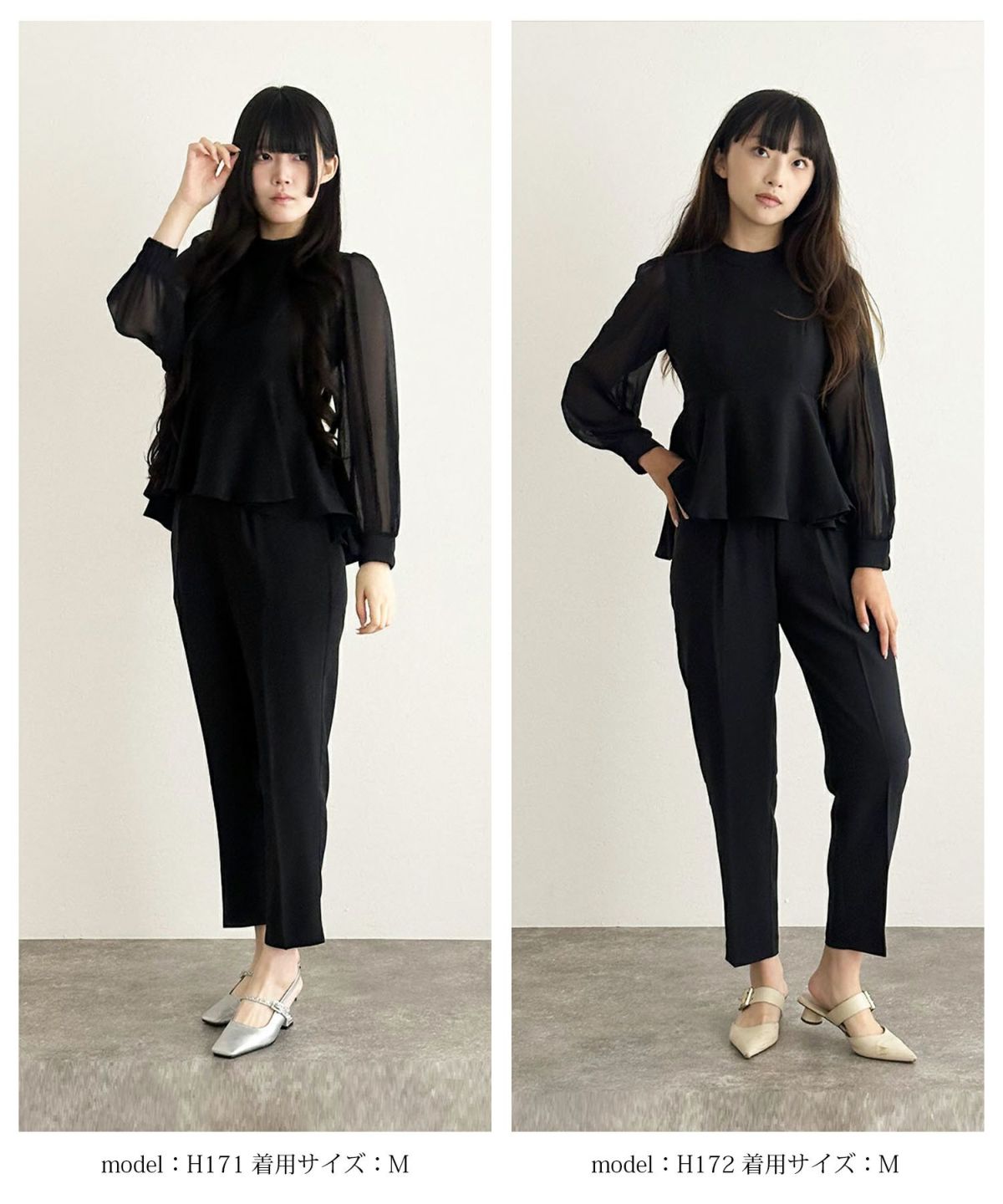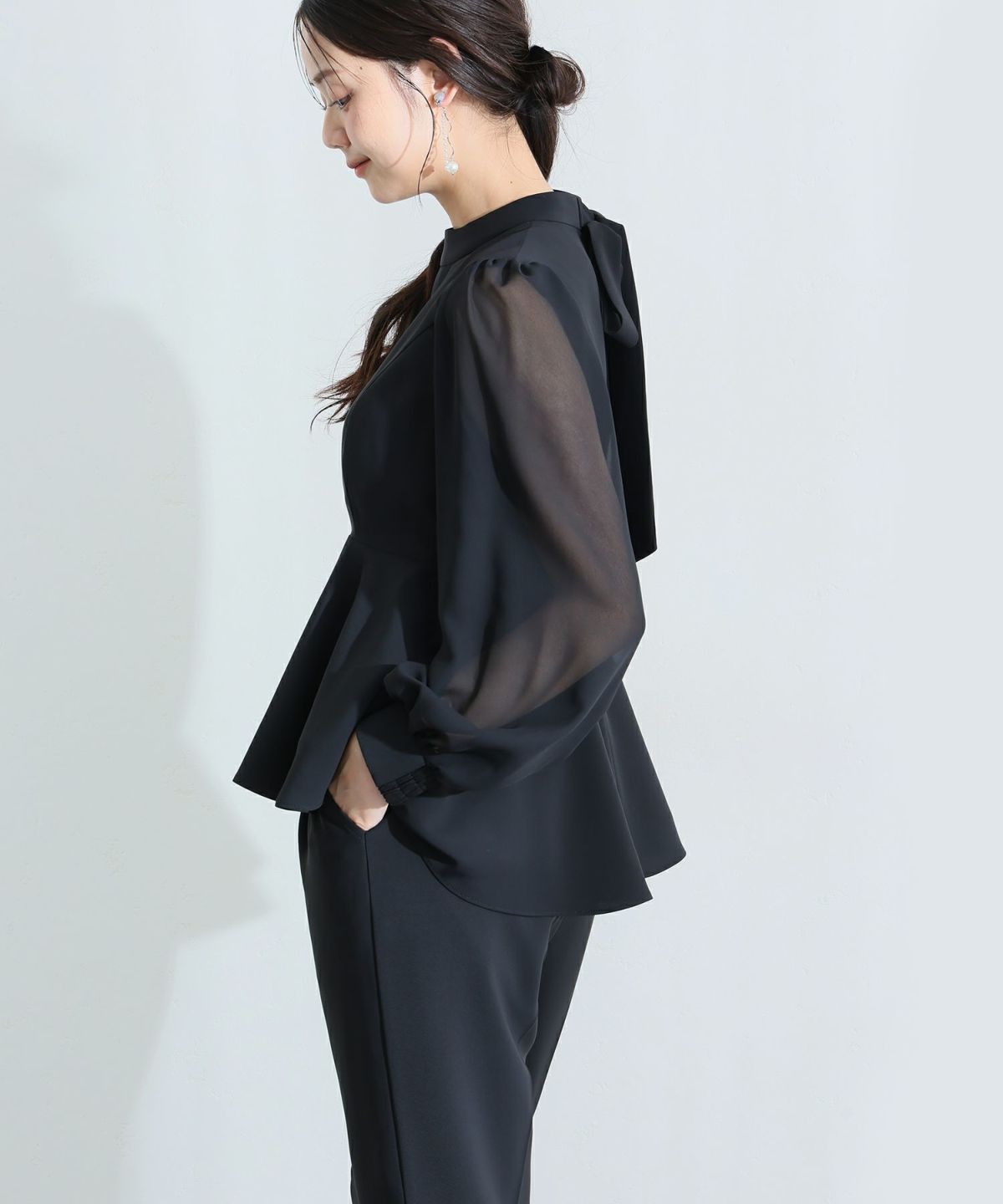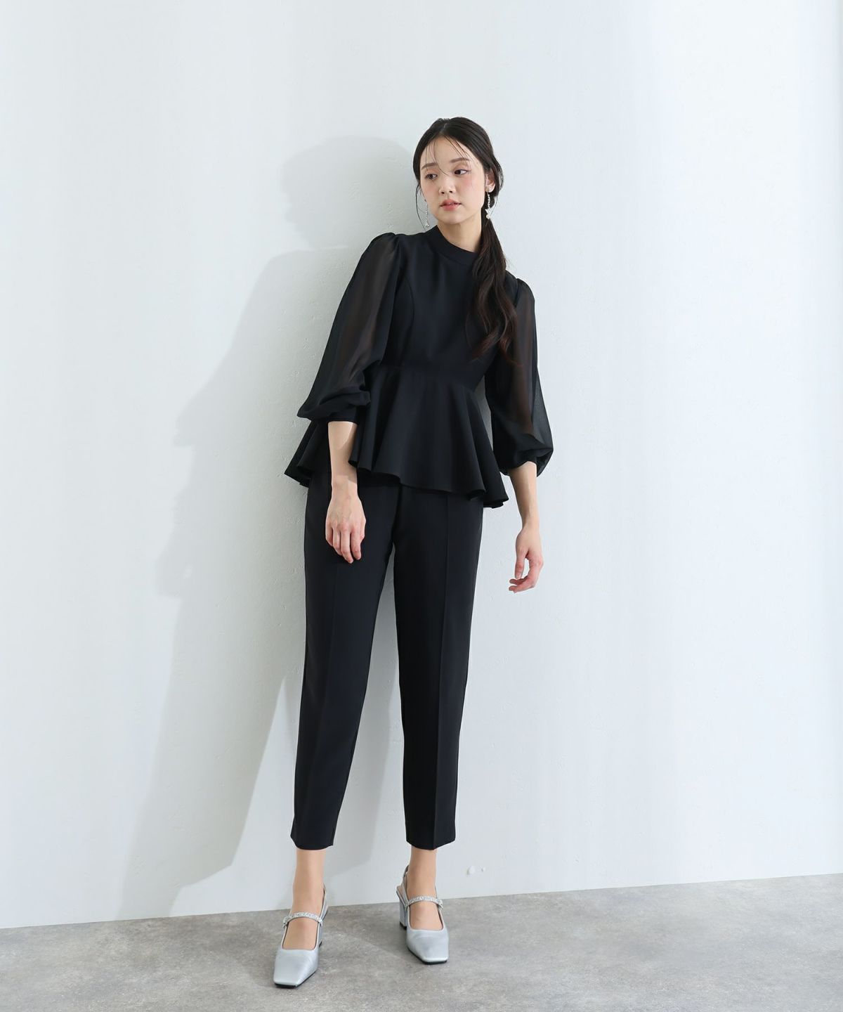 袖はシアー素材で抜け感があり、品よく肌見せができるため、華やかなシーンでも好印象です。