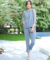 セットアップのパンツドレスにレースの切り替えで上品な装いに。