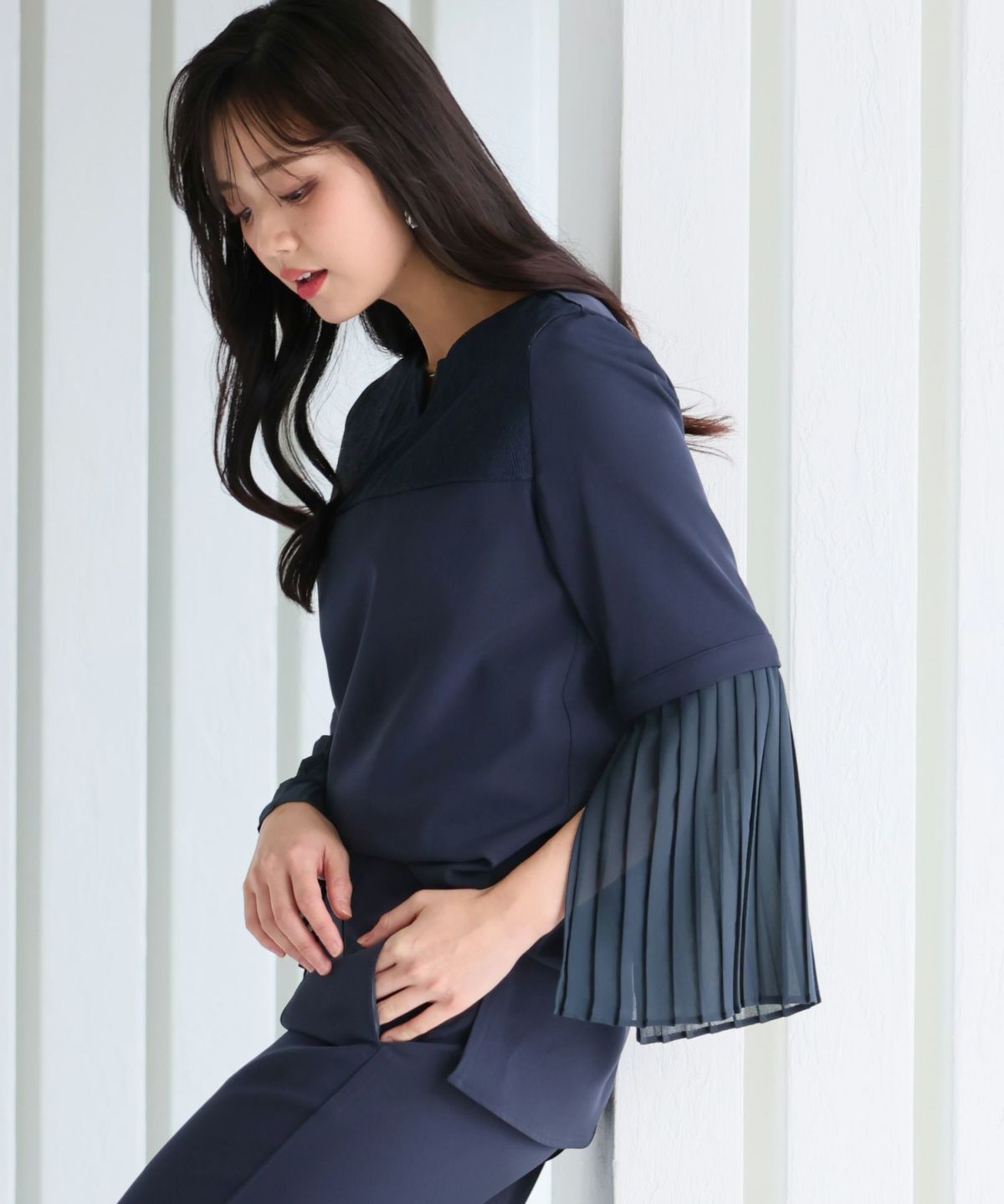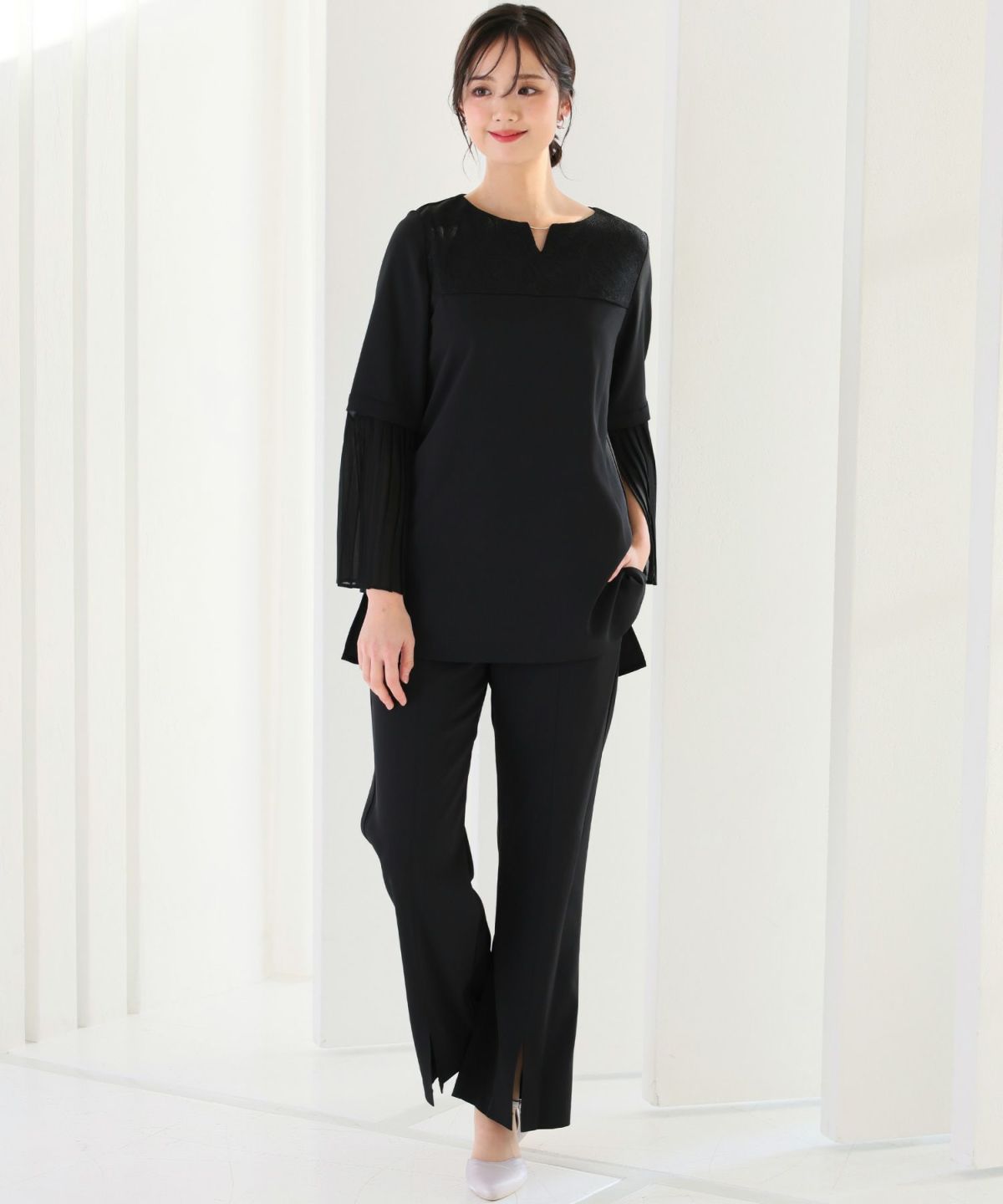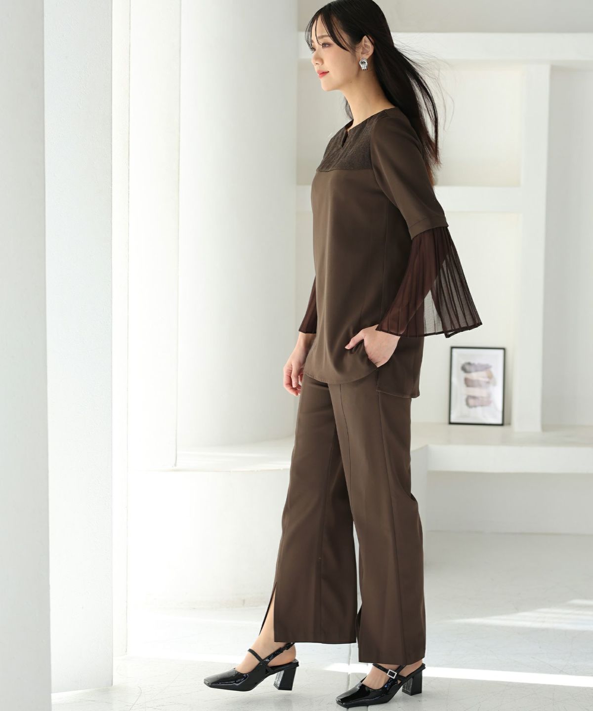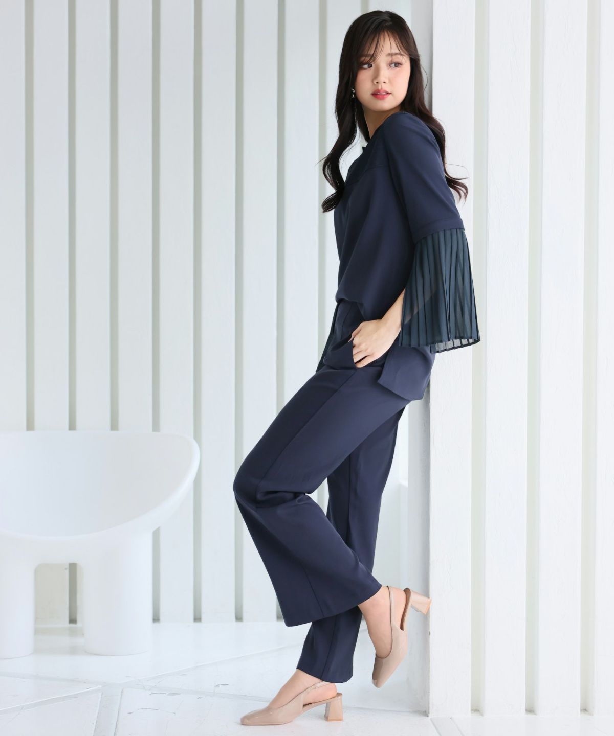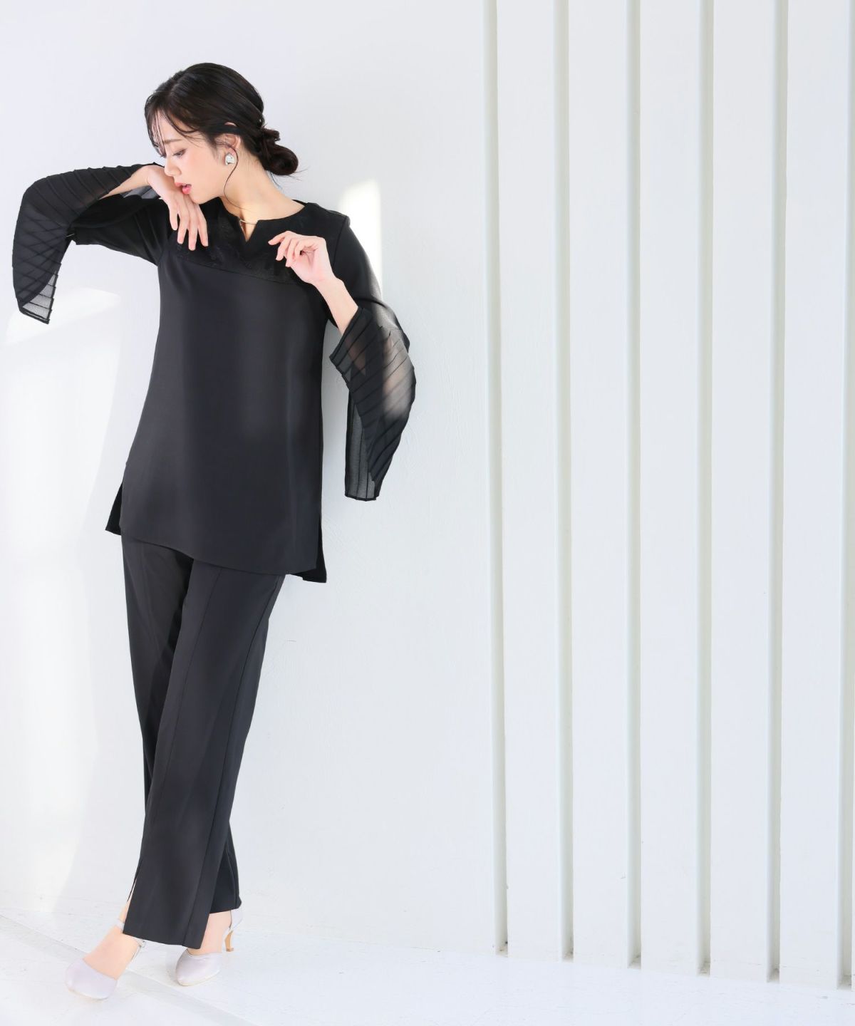 袖プリーツが特徴的なセットパンツドレス広がる袖で手首を美しくみせ、華奢見え効果も期待できますキーネックには金具がついており、首元を華やかにしてくれますシンプルなデザインなのでお食事会など様々なシーンで着用いただけます