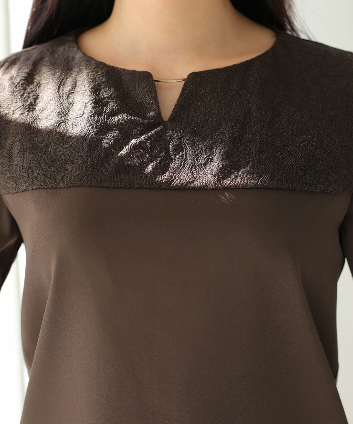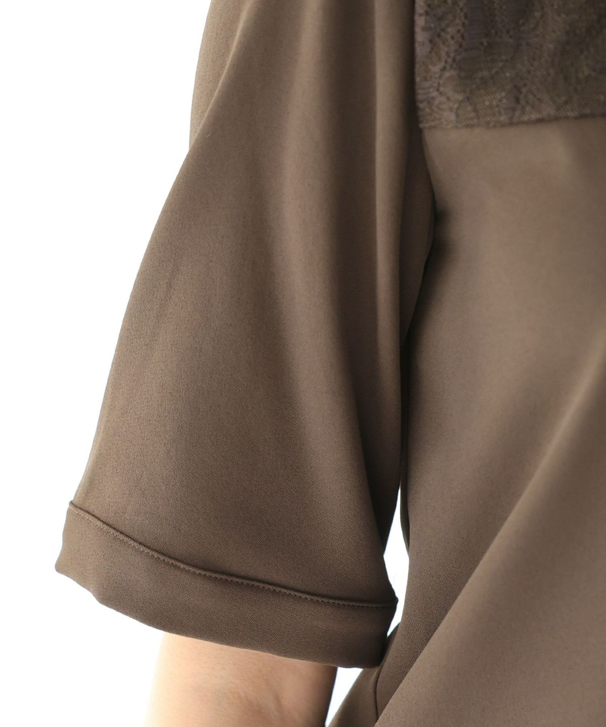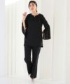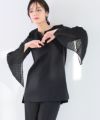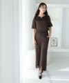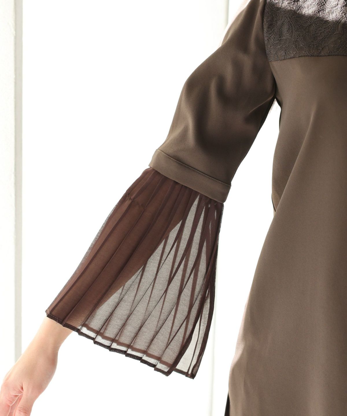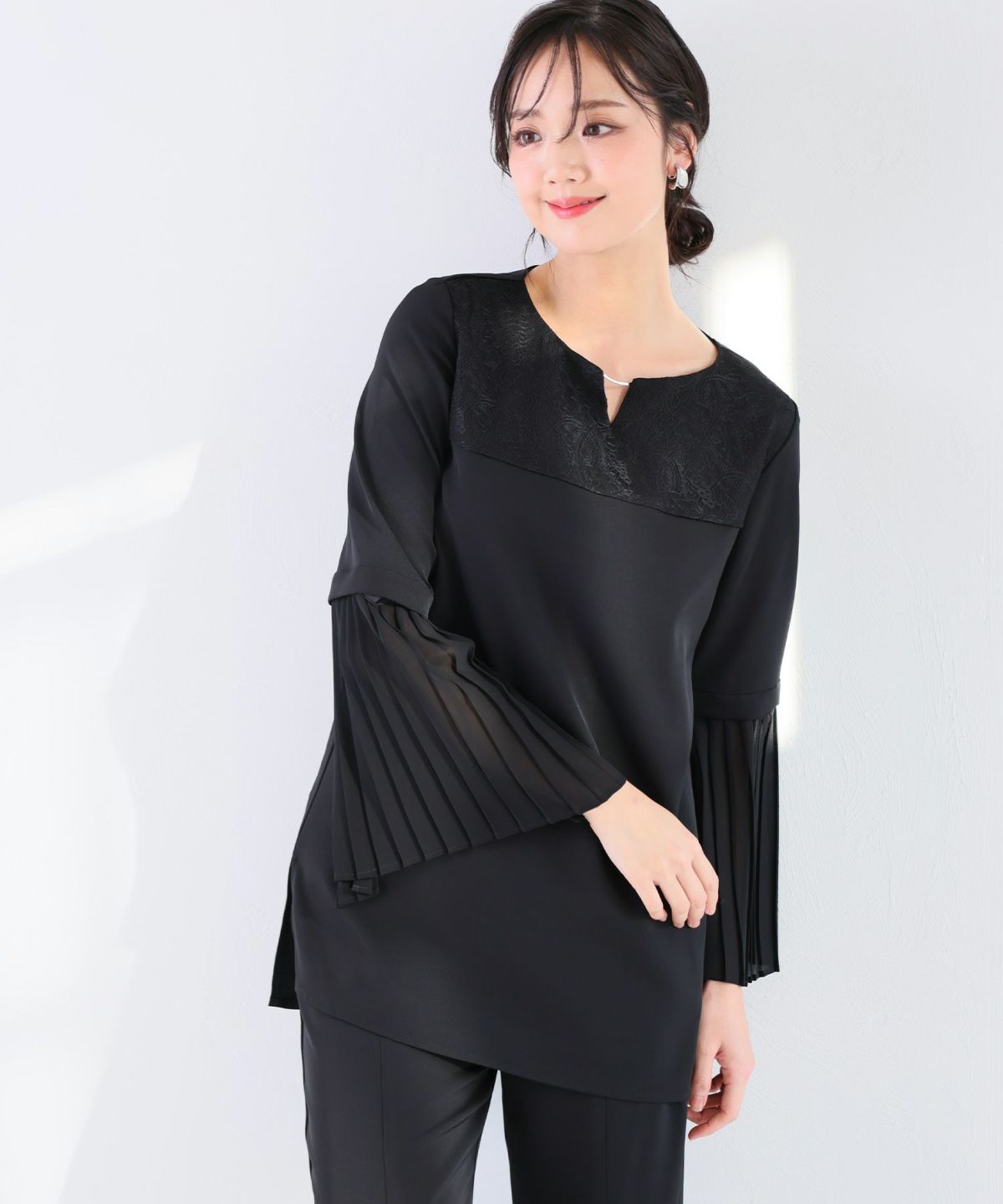 袖プリーツが特徴的なセットパンツドレス広がる袖で手首を美しくみせ、華奢見え効果も期待できますキーネックには金具がついており、首元を華やかにしてくれますシンプルなデザインなのでお食事会など様々なシーンで着用いただけます