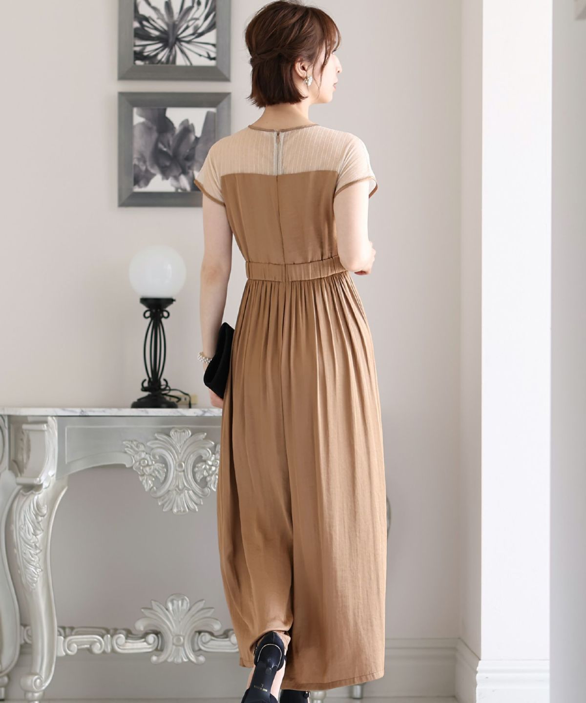 PourVous・atloの半袖パンツドレスは、気になる二の腕を程よくカバーしつつ、パンツドレス特有のスタイリッシュさと上品さを両立した一着。