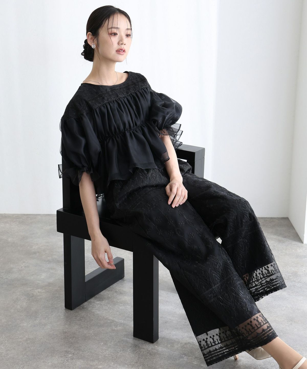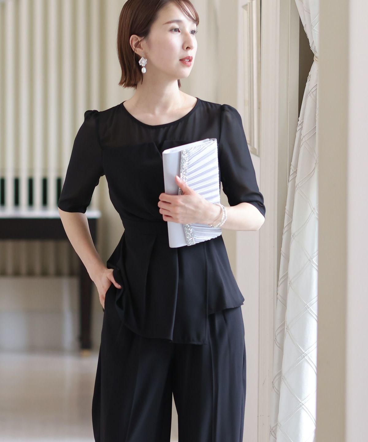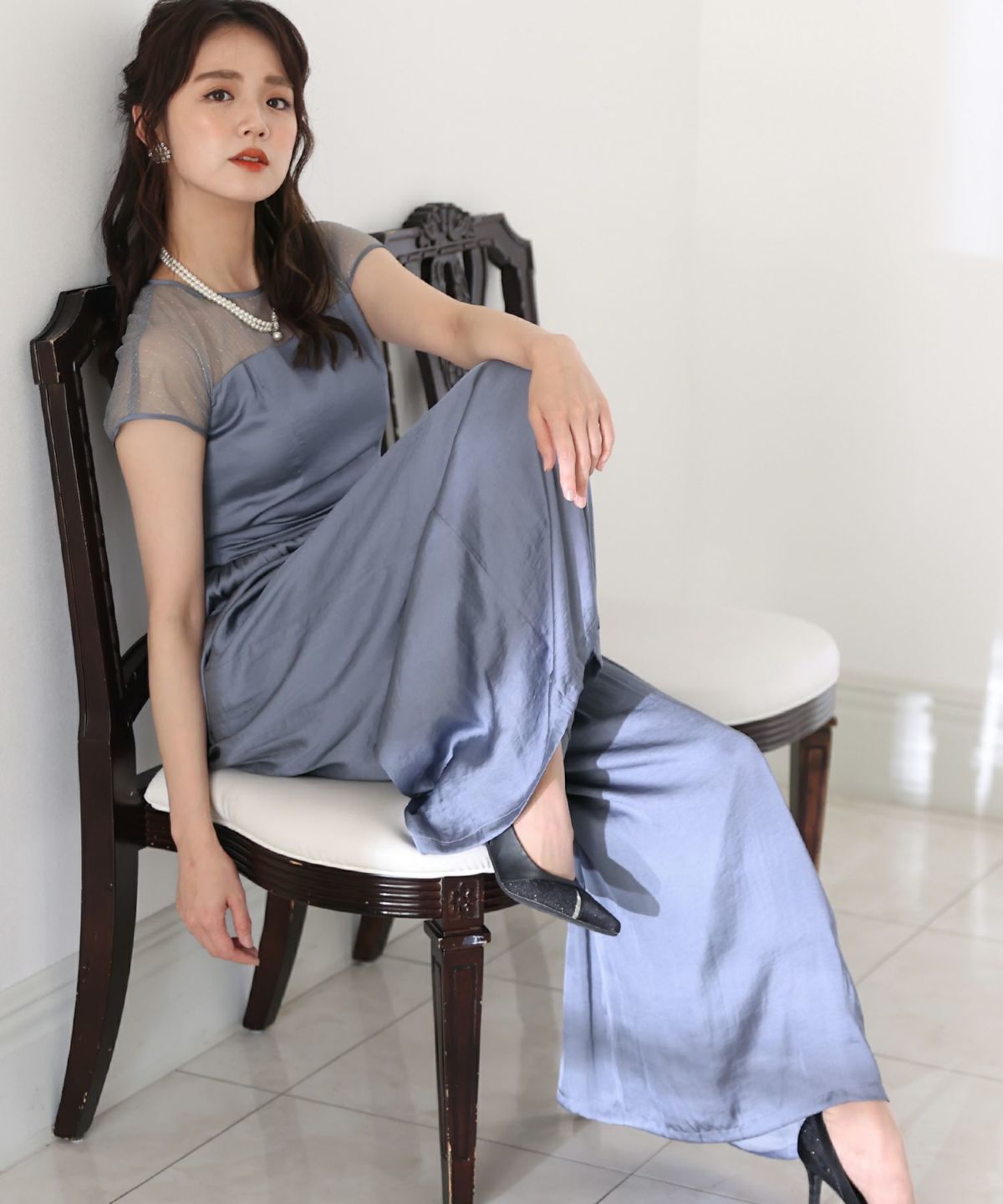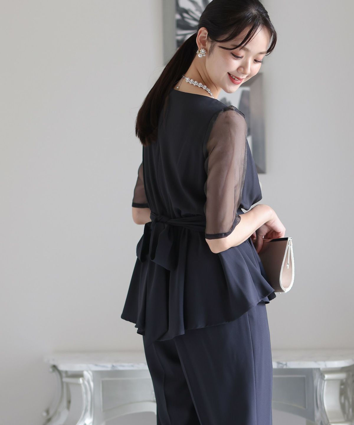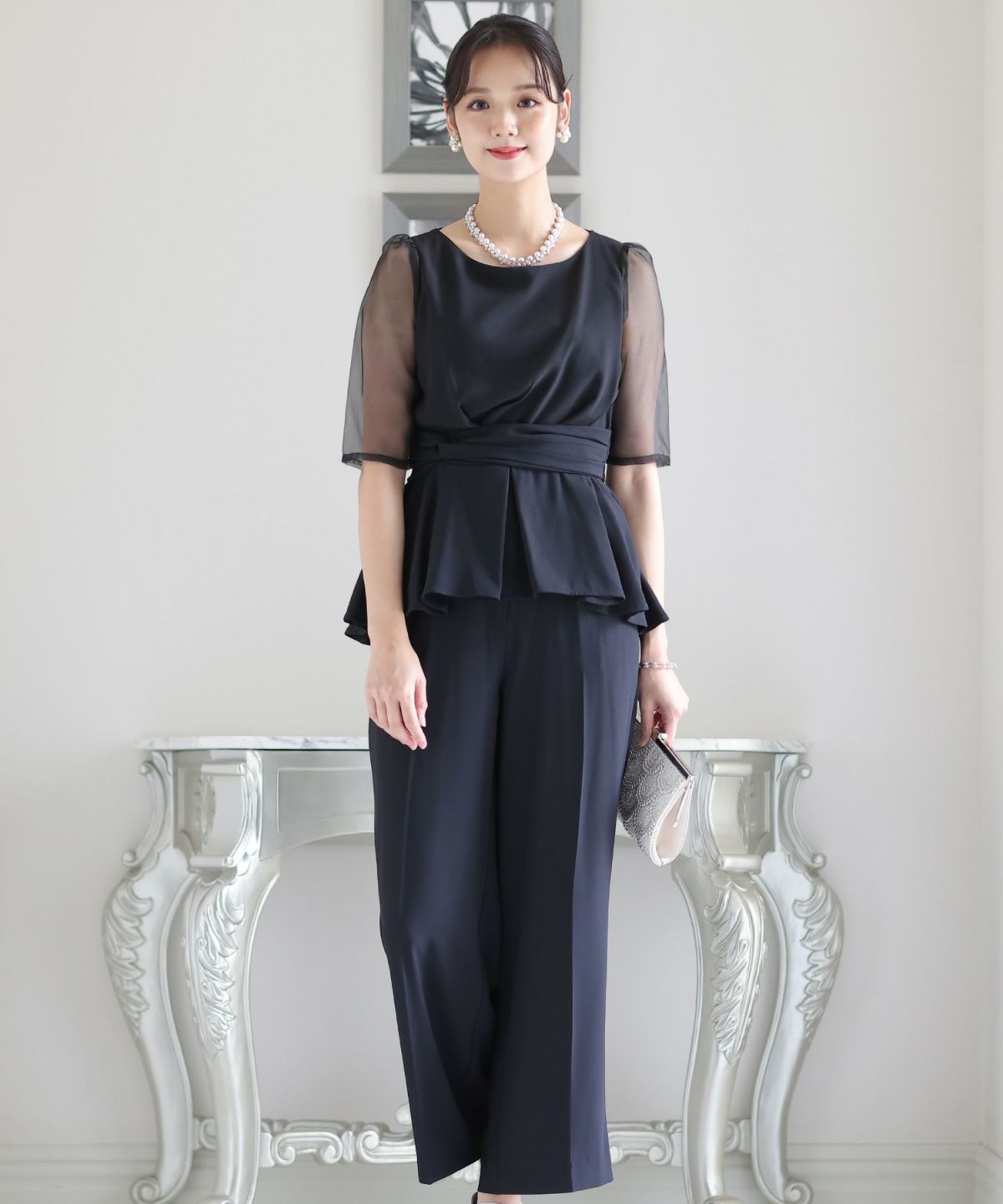 PourVous・atloのパンツドレスは、パーティードレスとしての華やかさと、上品なきちんと感を兼ね備えた一着。