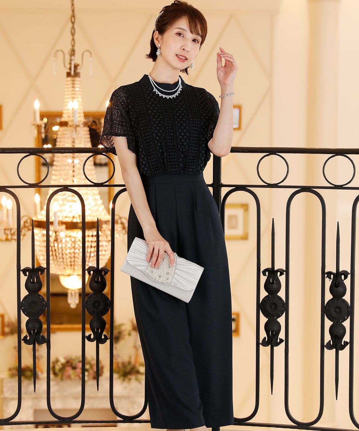 スタイリッシュに決まる上品パンツドレス ハイネック&レース ワイドパンツドレス