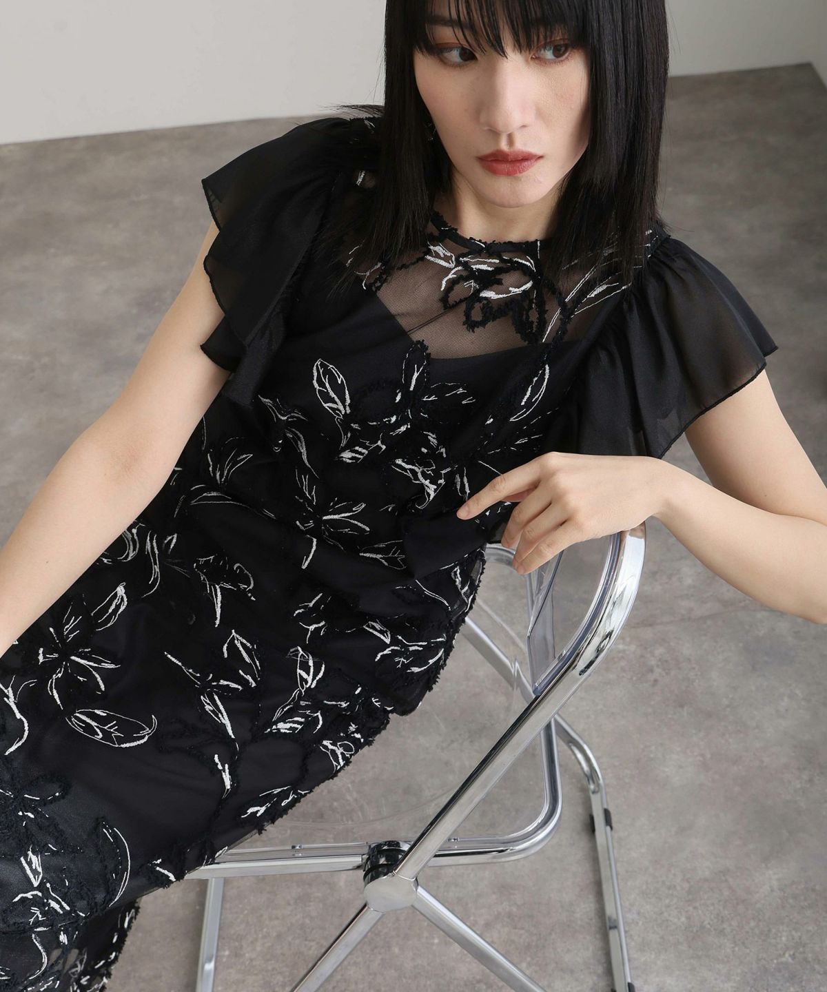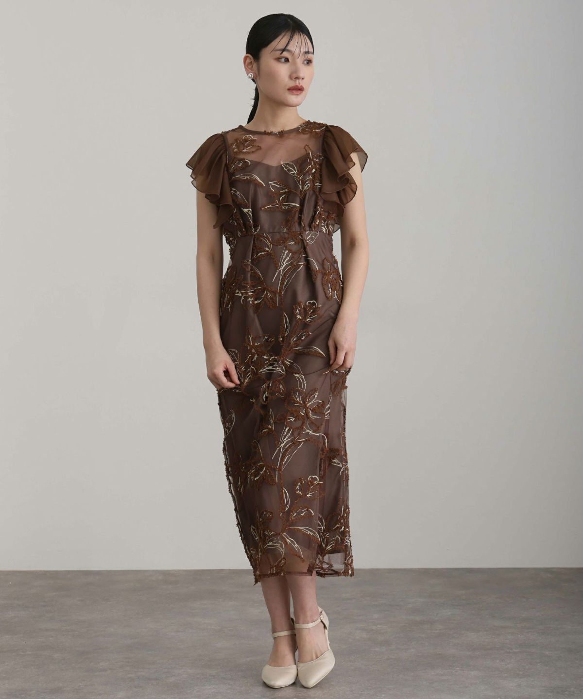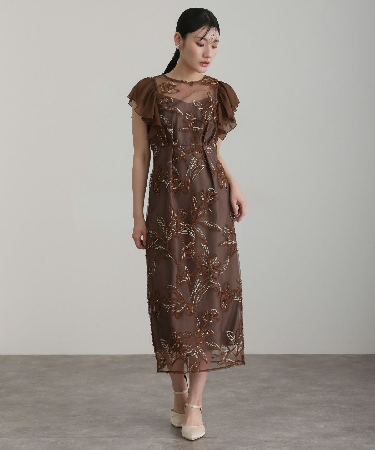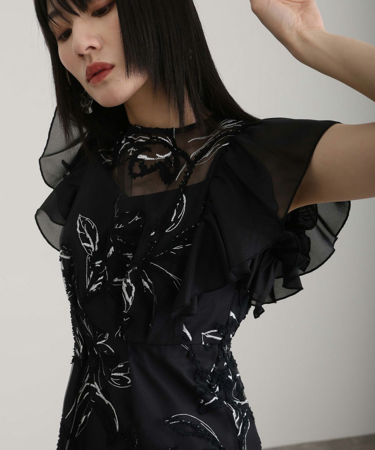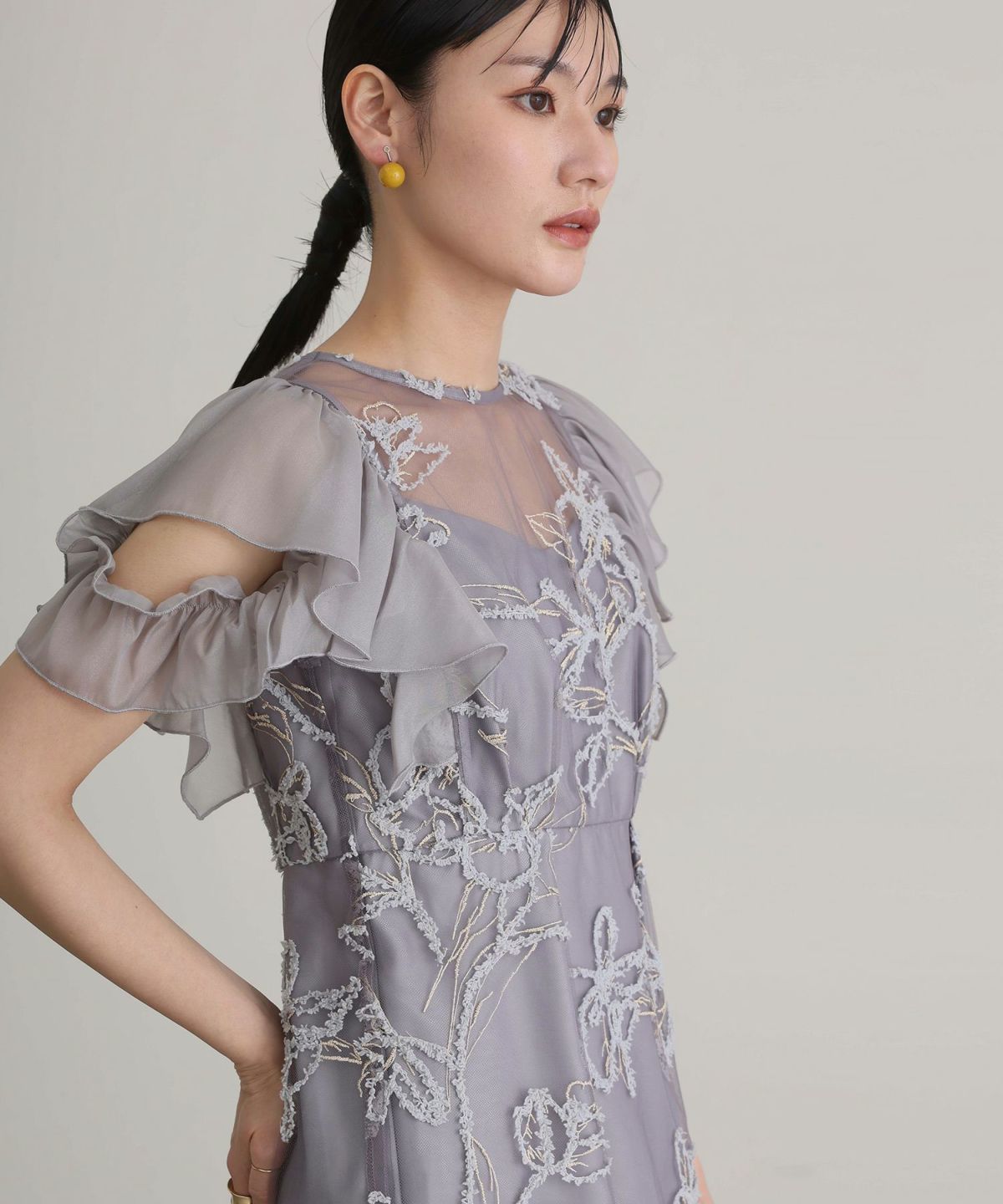 立体感のあるラメ糸を使用した刺繍が華やかな存在感を放つ一着。