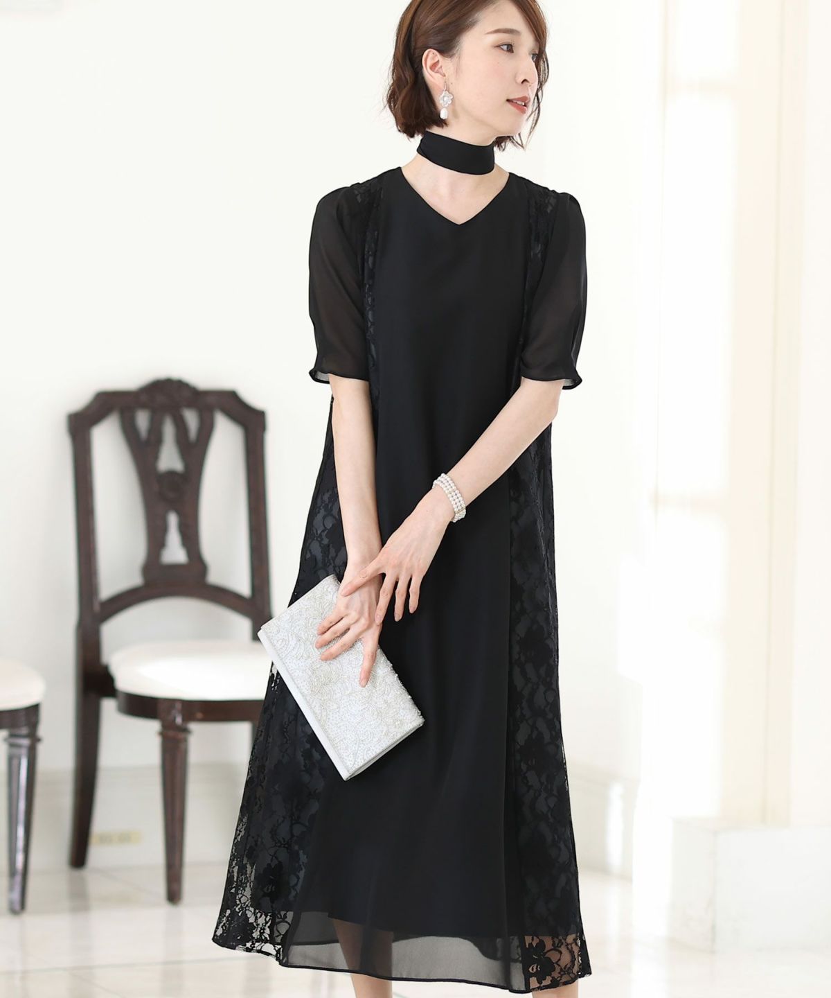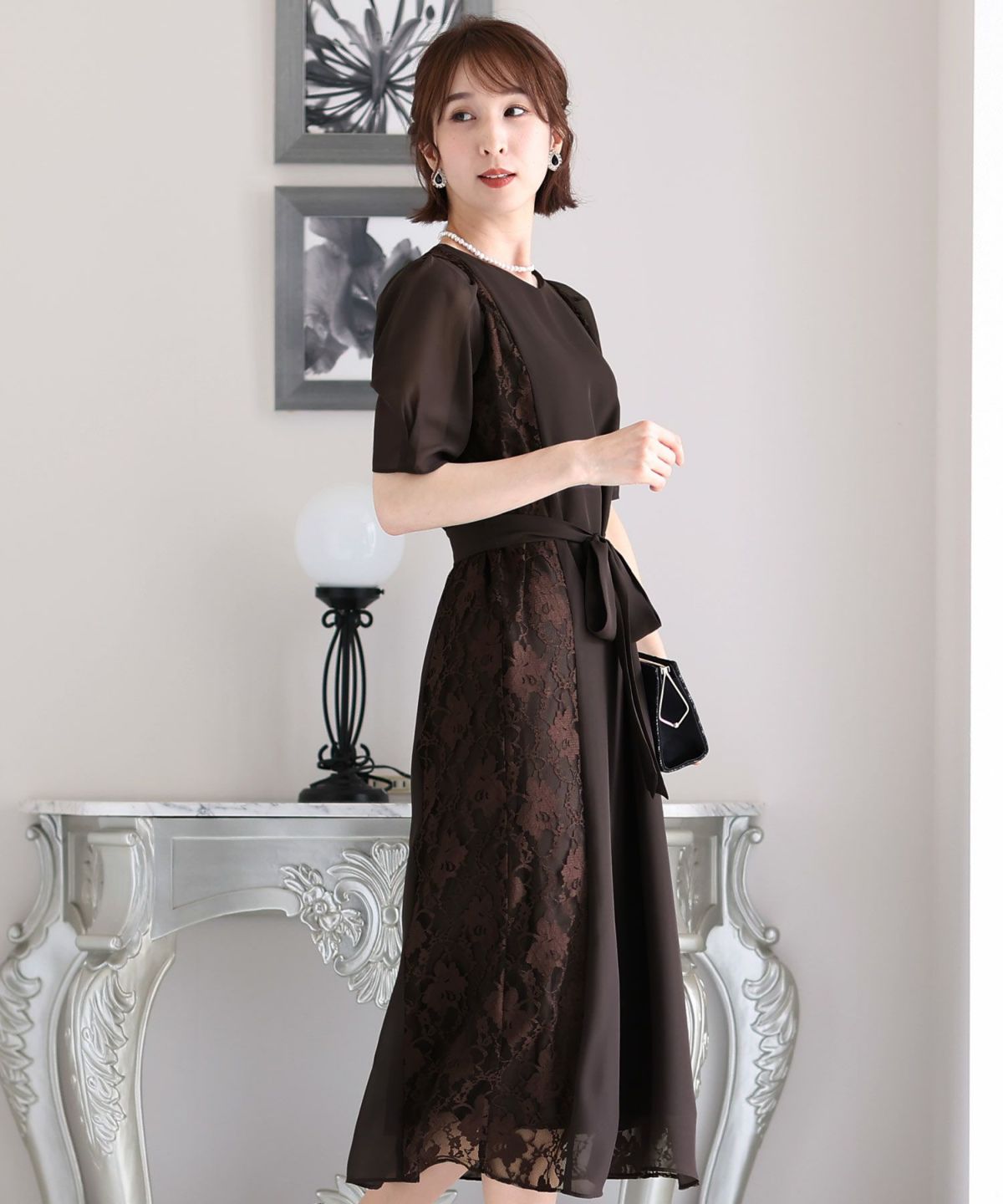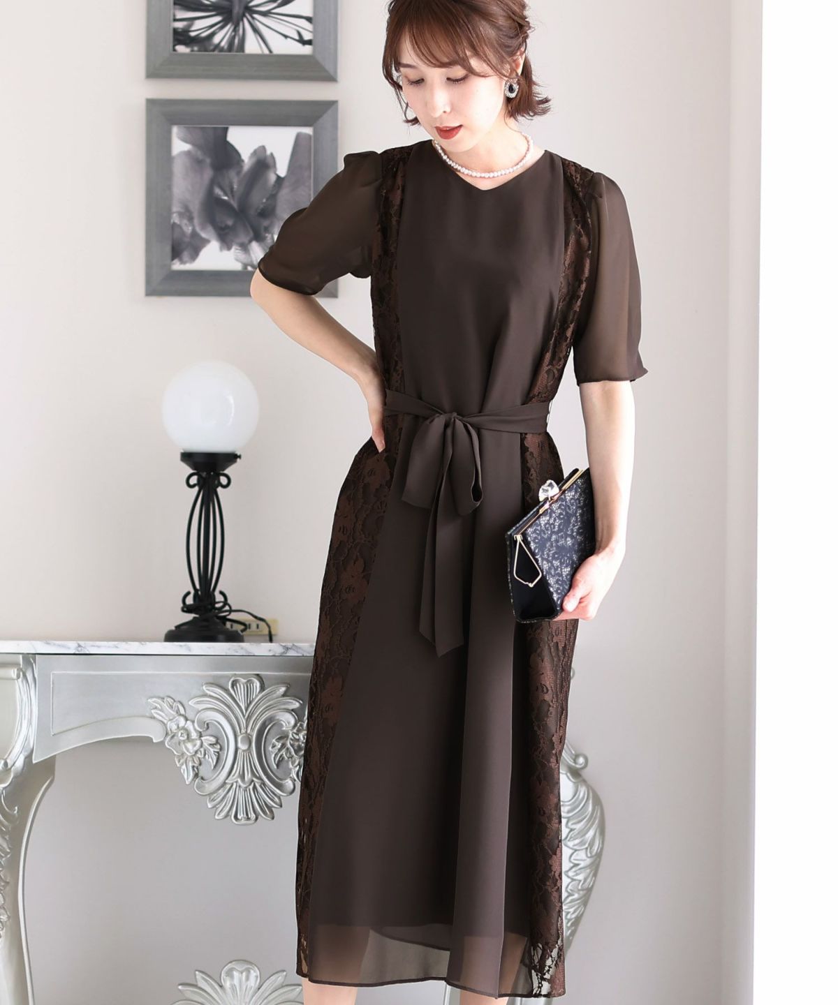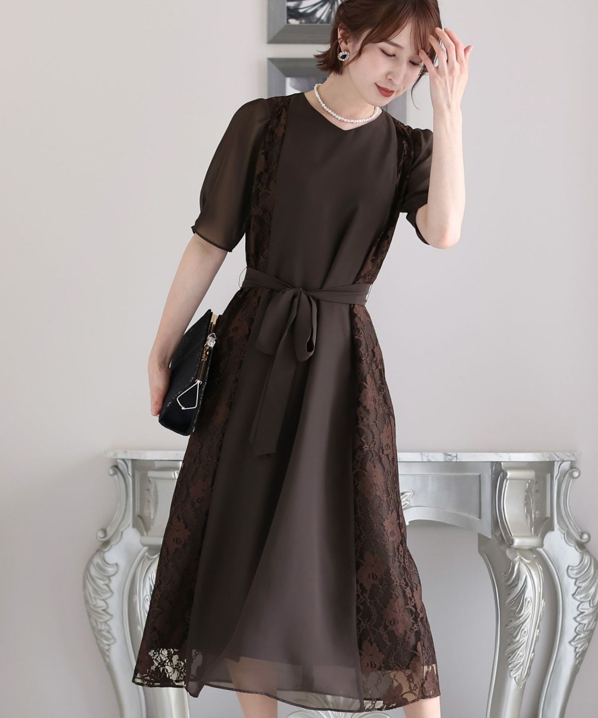 ■エレガント×女性らしいシフォンワンピースシフォンとレースが切り替えられたデザイン性のあるドレスです。エレガントなドレスなので、ジャケットなどと合わせて様々なオケージョンシーンにおすすめです。付属のリボンは取外し可能で2WAY仕様のワンピースです。切替レースで華やかですが、落ち着いたカラーバリエーションで甘すぎないワンピースに仕上がっています。