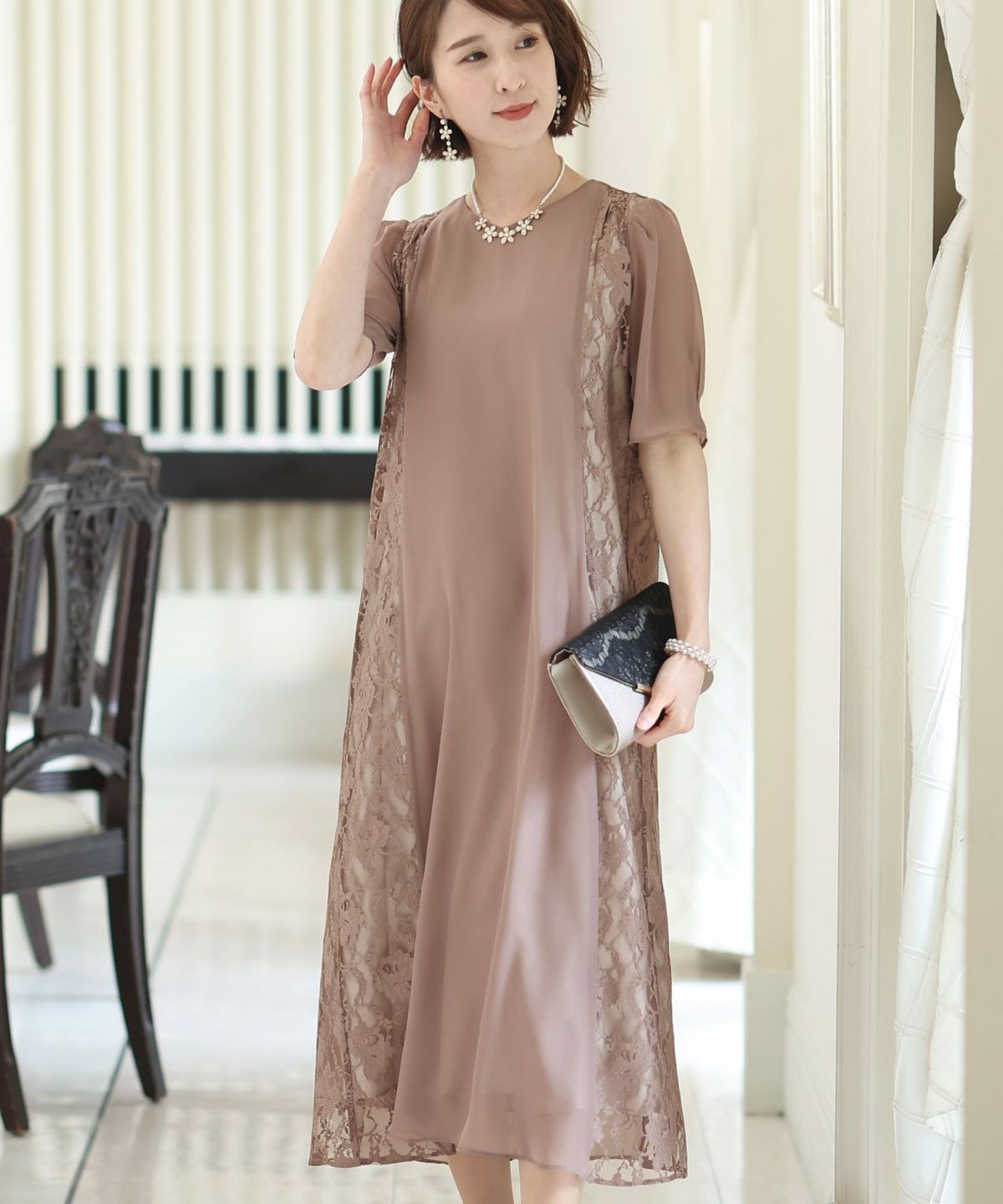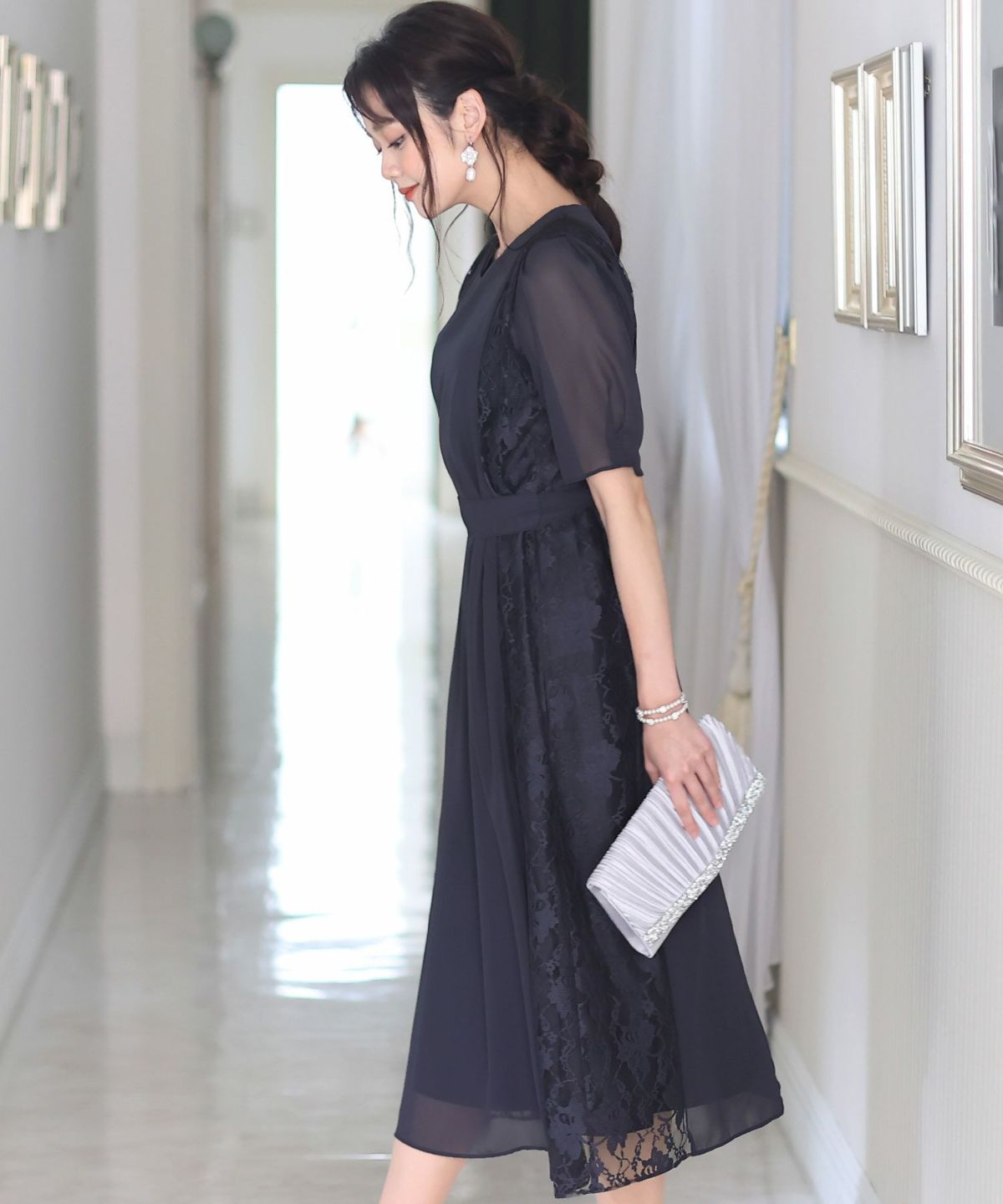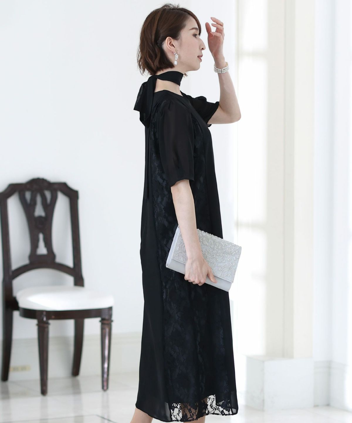 ■エレガント×女性らしいシフォンワンピースシフォンとレースが切り替えられたデザイン性のあるドレスです。エレガントなドレスなので、ジャケットなどと合わせて様々なオケージョンシーンにおすすめです。付属のリボンは取外し可能で2WAY仕様のワンピースです。切替レースで華やかですが、落ち着いたカラーバリエーションで甘すぎないワンピースに仕上がっています。