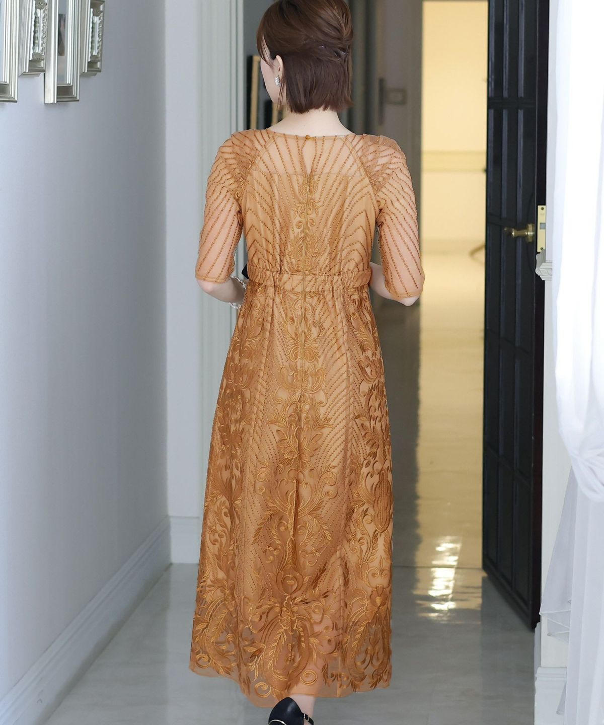 ■デコルテからスリーブにかけた透け感が上品高めのウエストラインで自然なスタイルアップが期待できます。