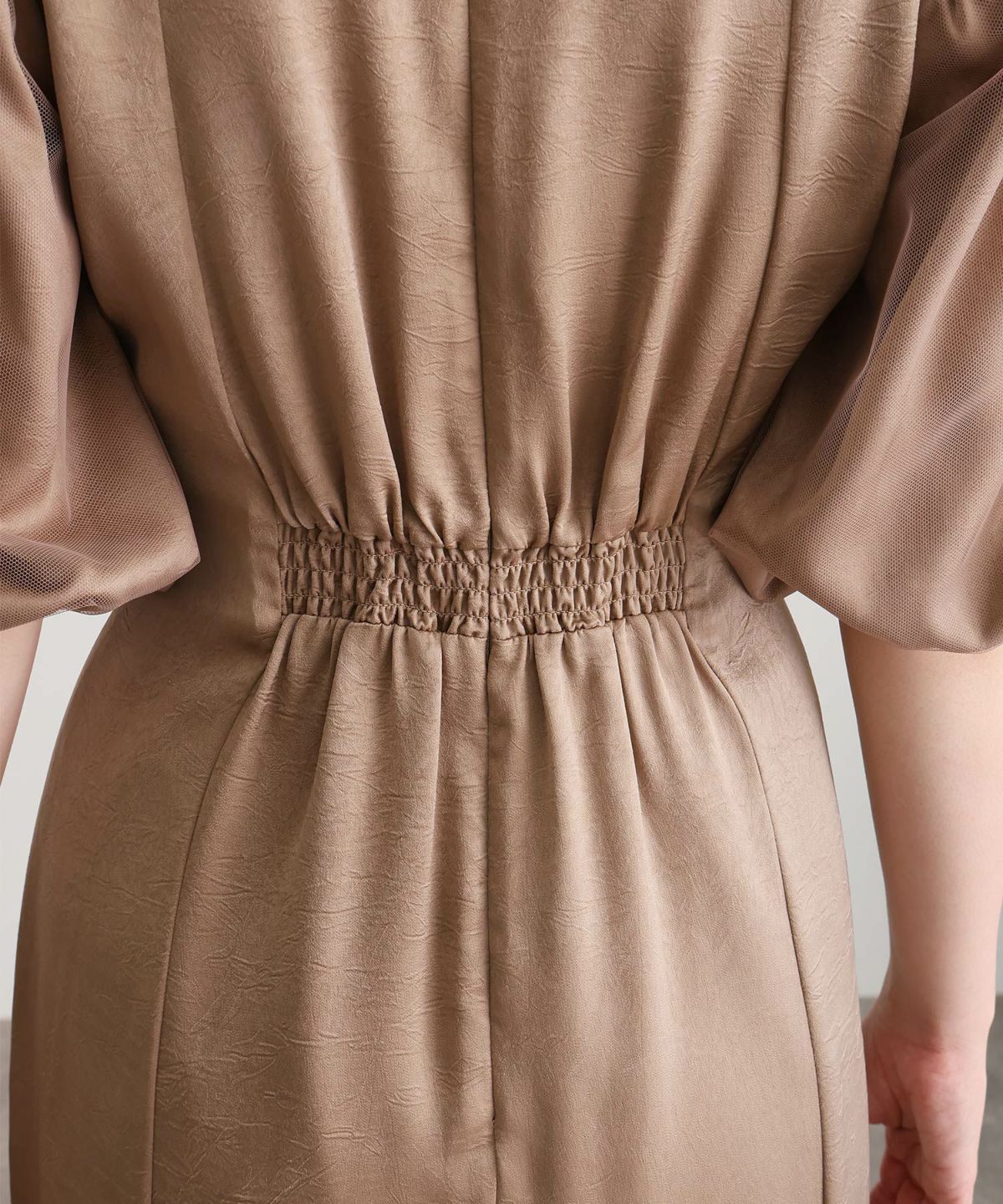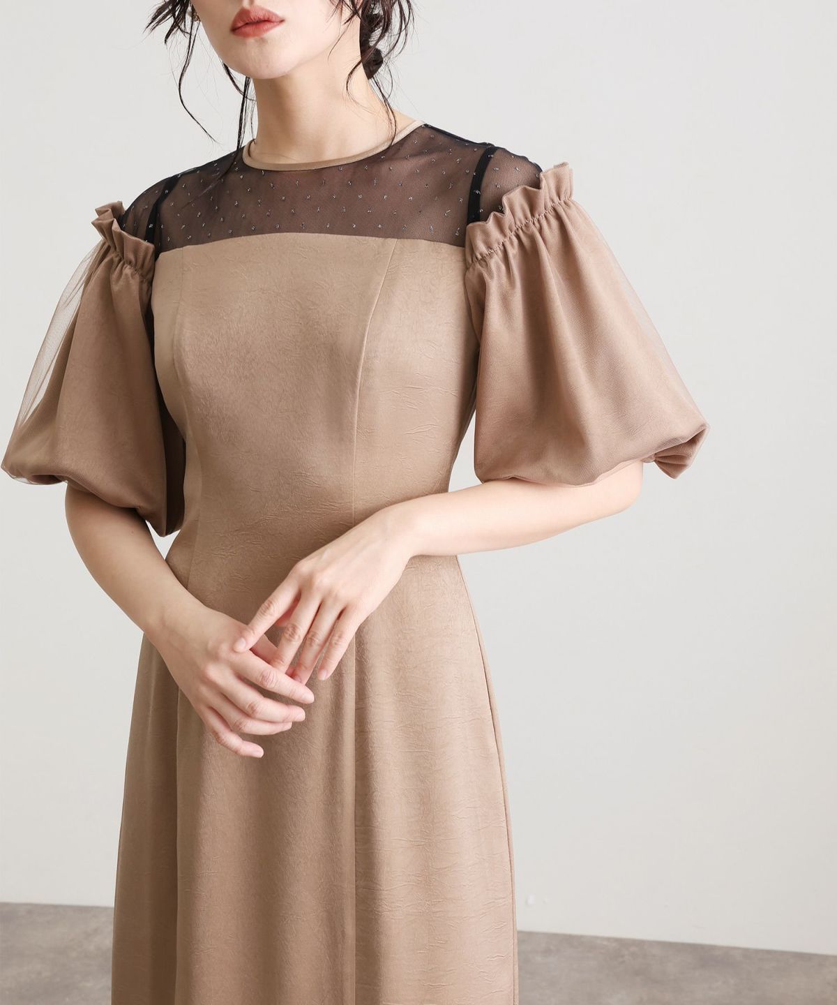 パフスリーブとの異素材ミックスが、洗練された印象をプラス。