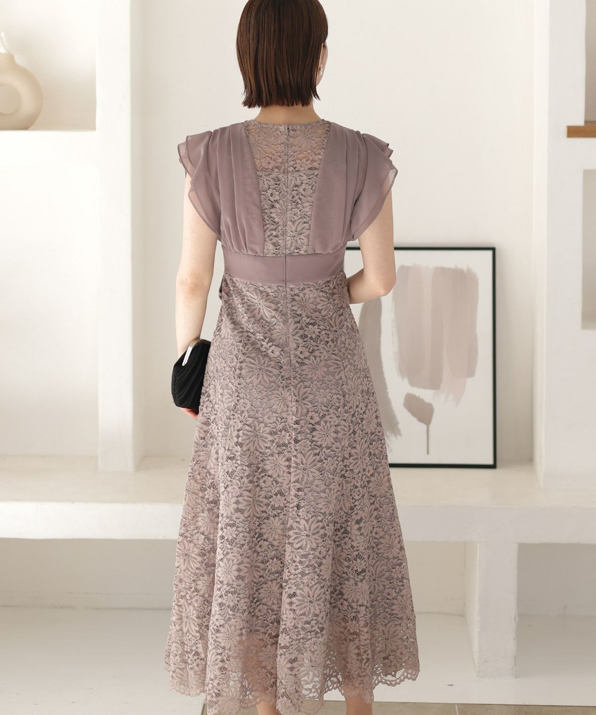 ■花柄レースが華やかで女性らしい体型カバーポイント:【脚】【ウエスト】【ヒップ】フレンチスリーブ丈ですがシフォンのふわっと感が気になる肩周りをカバー。太目のウエストマークでスタイルアップ効果も。