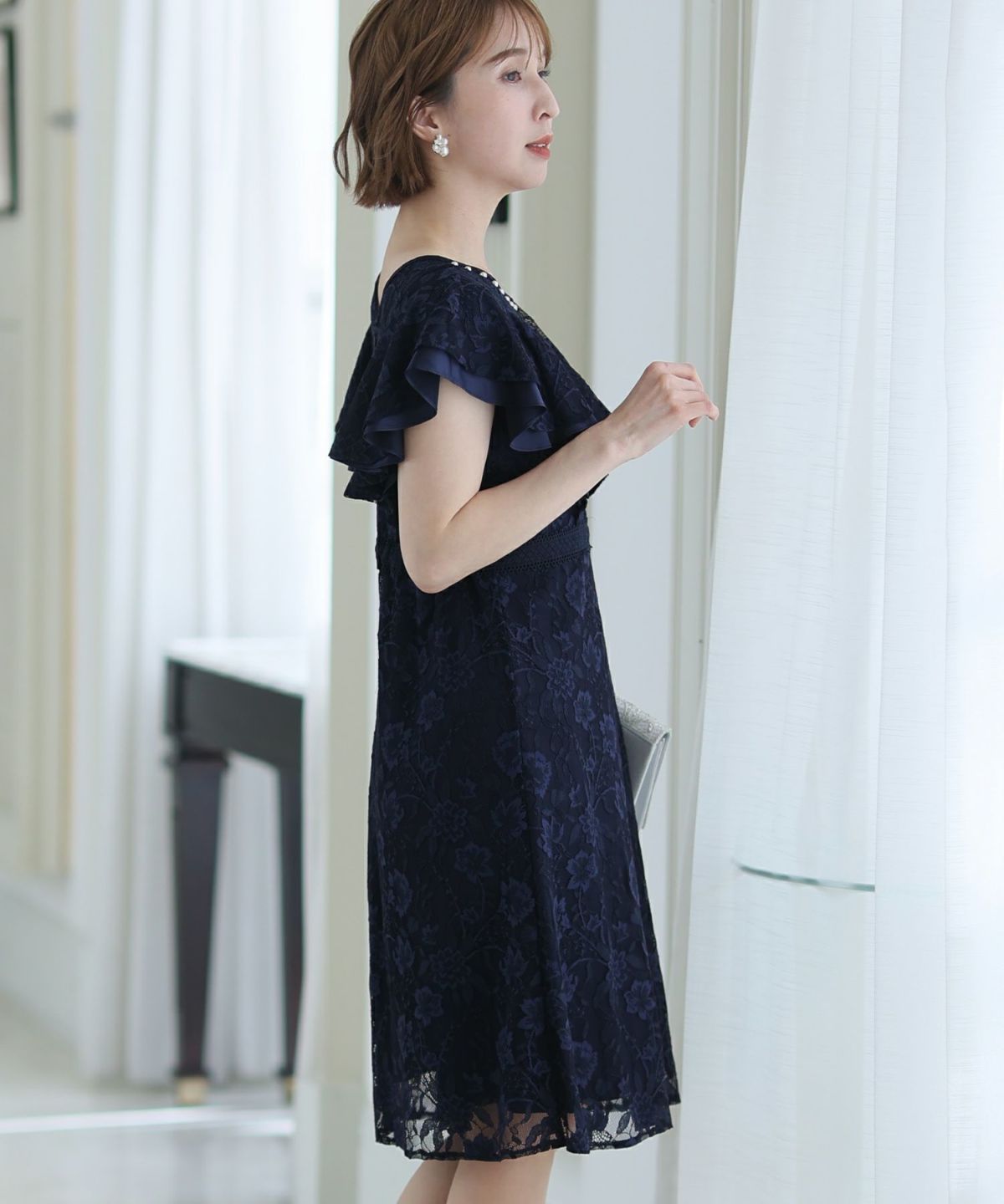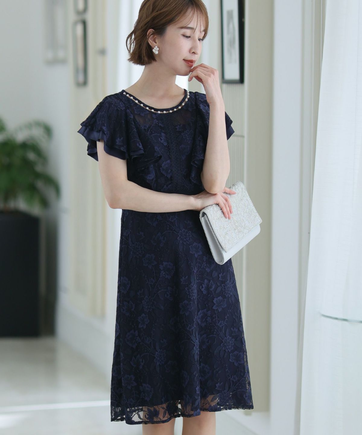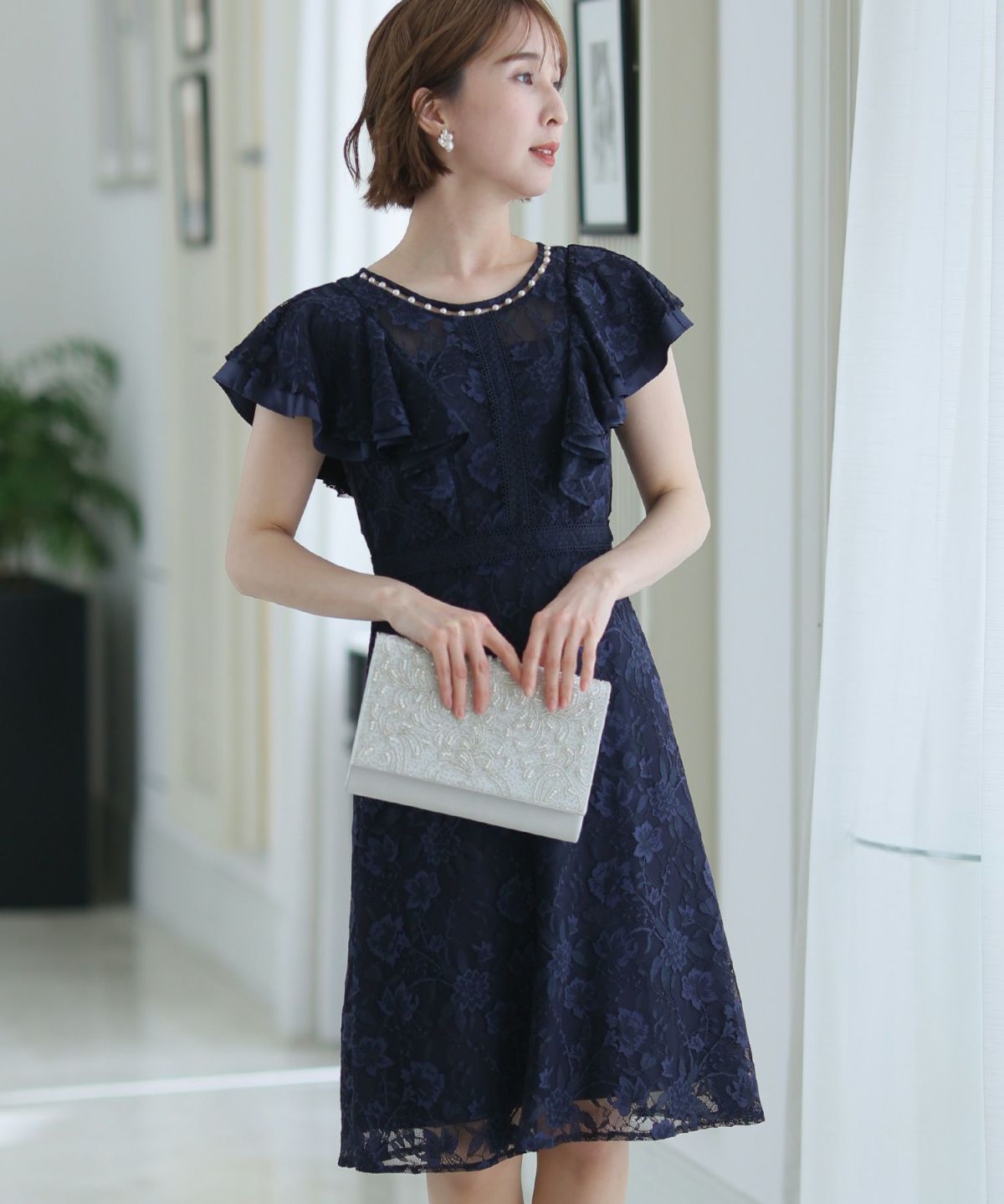 ■フリル×パールラッフルスリーブとネックラインのパールが可愛いワンピースです。配色レースとレーステープの組み合わせがおしゃれ。袖のフリルデザインが甘めでフェミニンな印象に。オケージョンはもちろん、特別な日のお出かけにもおすすめです。