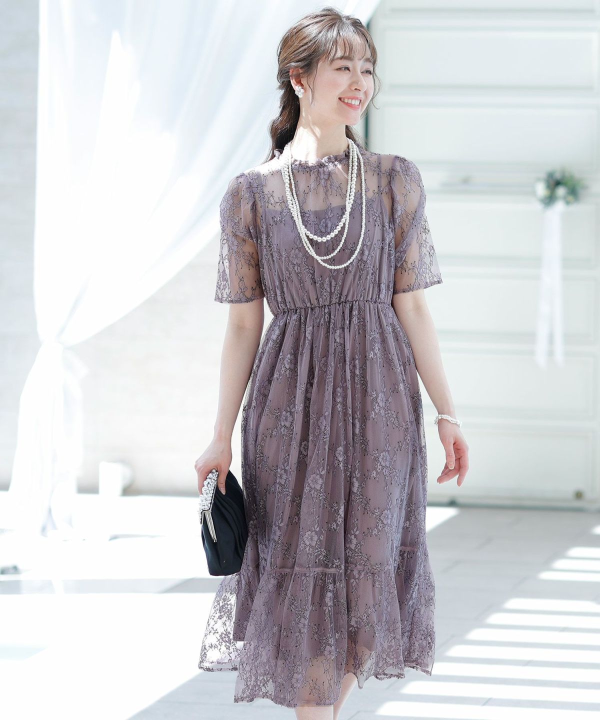黒縁取りレースとロング丈のデザインが大人可愛いを叶えます。シアーな透け感が軽やか。1枚で着れてアウター要らず。