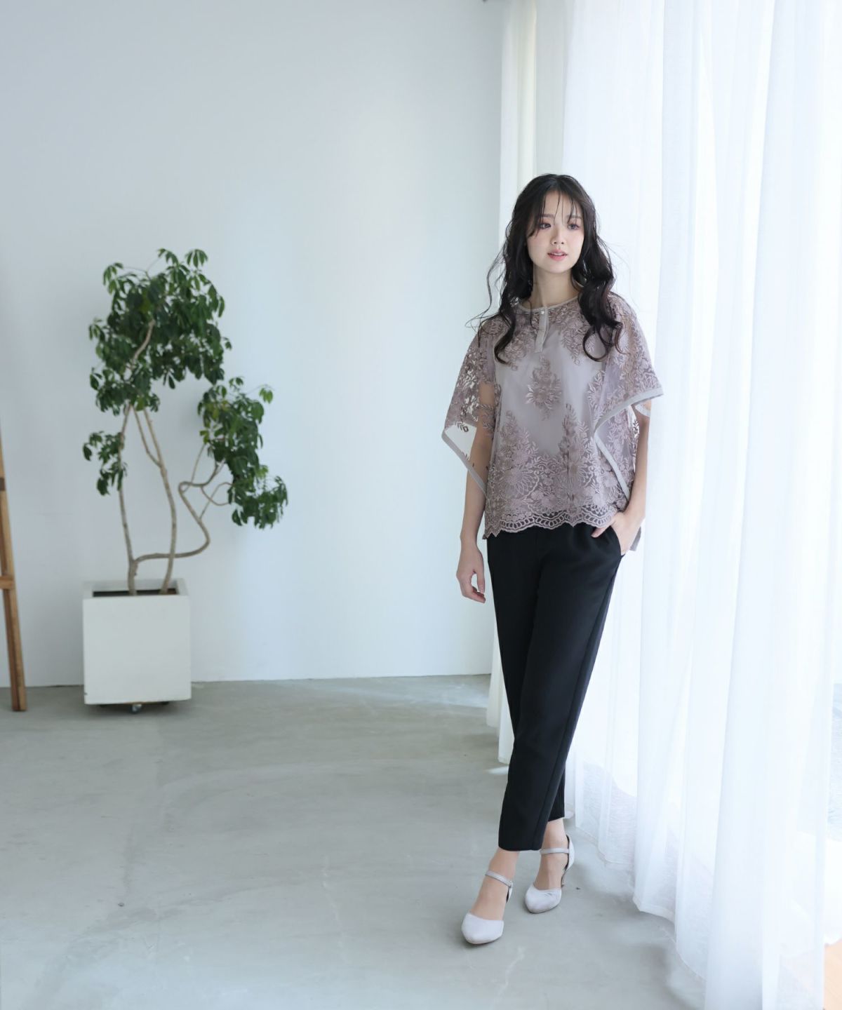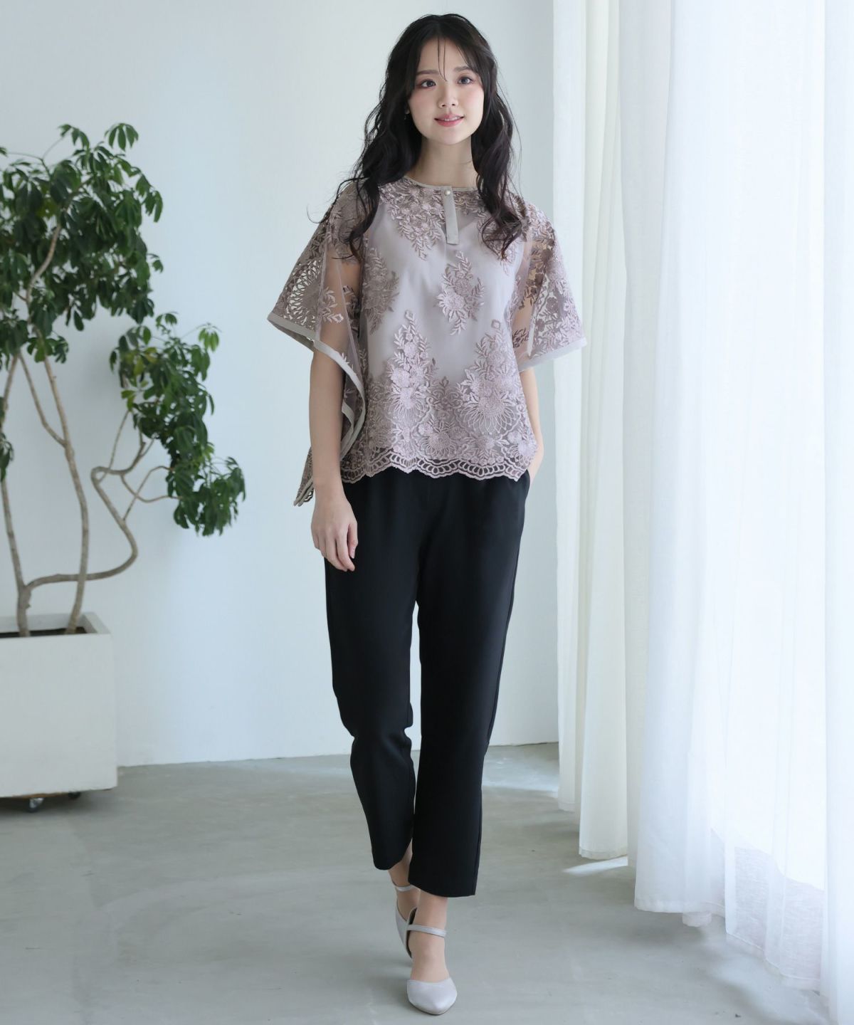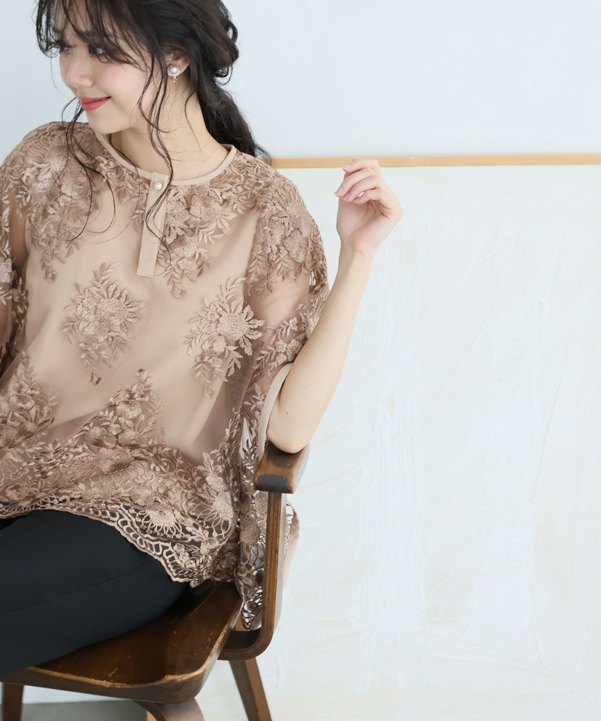 袖はオーガンジーのシルクタッチでチクチクせず、着心地も抜群。甘すぎない繊細なレースで大人可愛い雰囲気となります。
