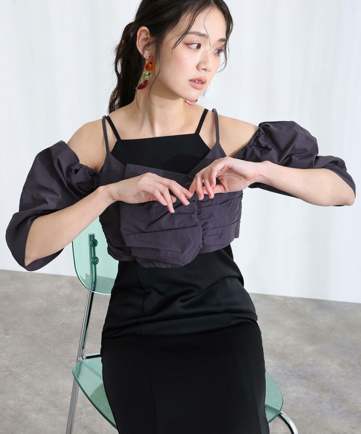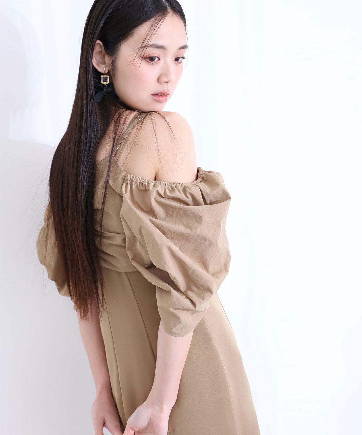 ウエスト下から重ねたチュールで柔らかく女性らしい印象に チュール切替パフスリーブワンピース
