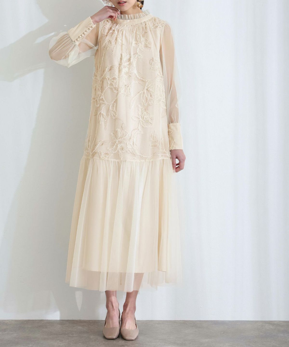 立体的な刺繍レースが魅力的な一着 刺繍レースタイトラインワンピース