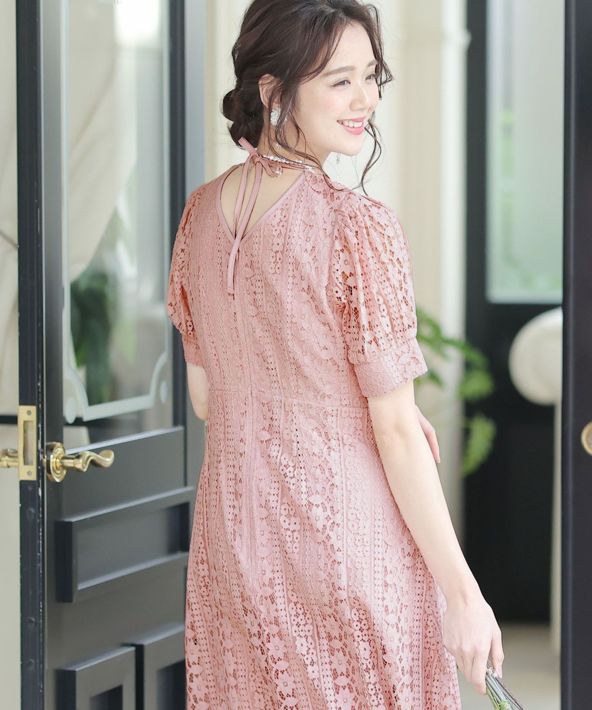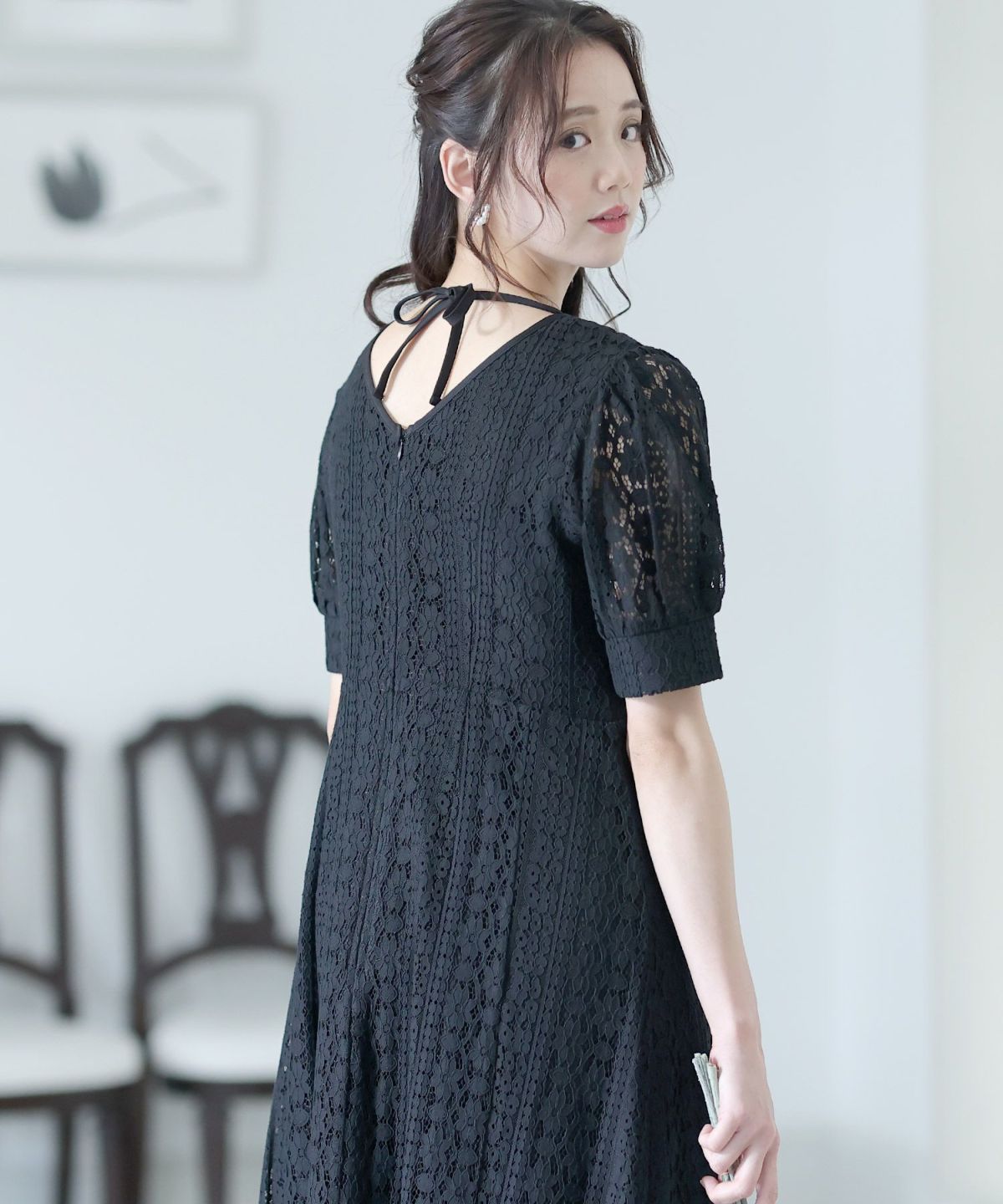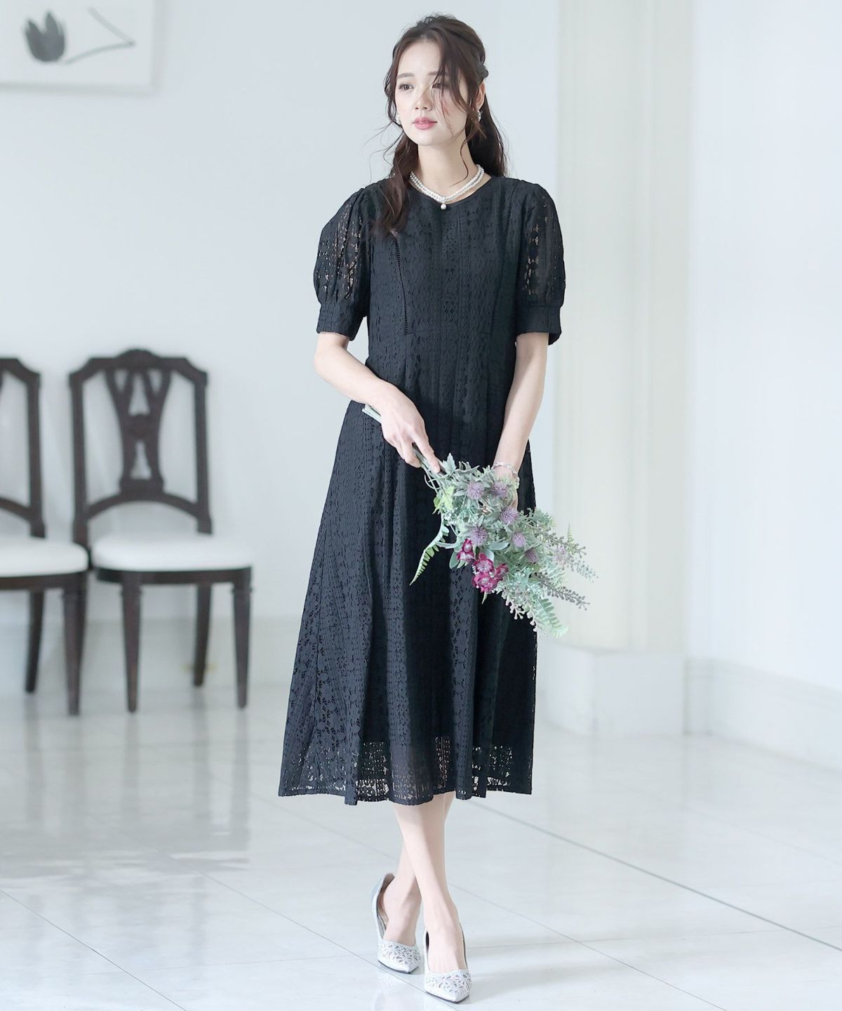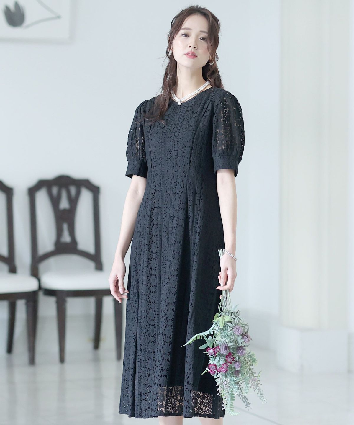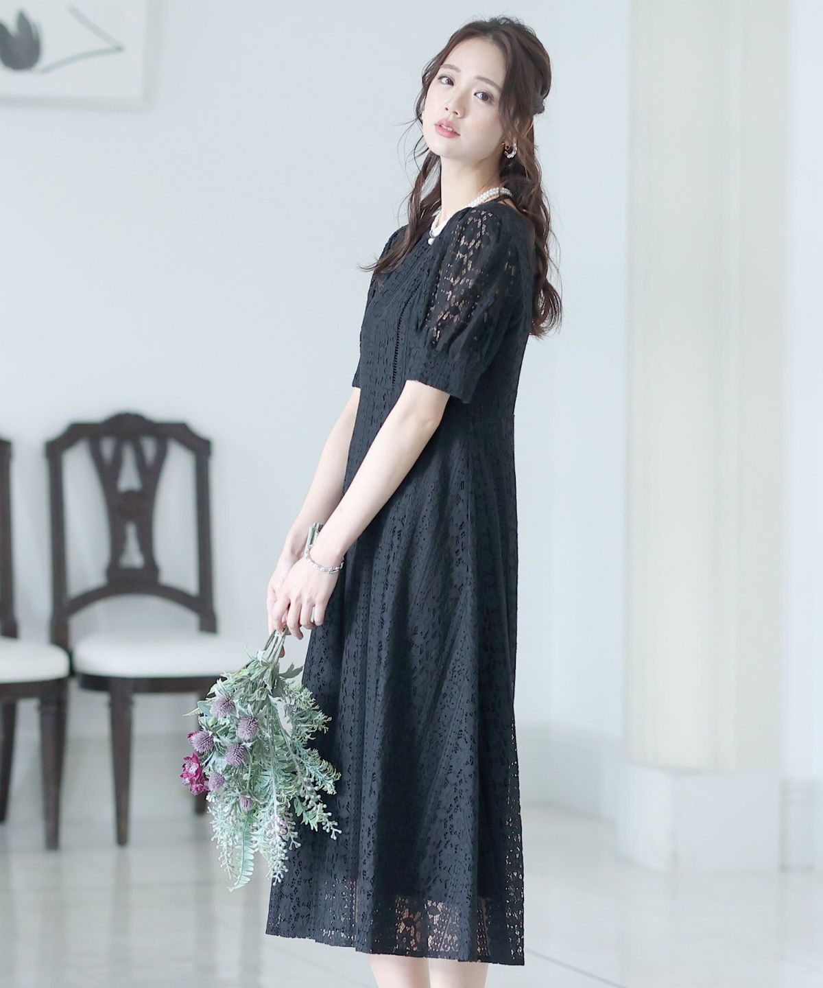 一見シンプルなドレスに見えますが、計算されたレース使いは女性らしさを際立て、大人っぽい雰囲気を演出します。
