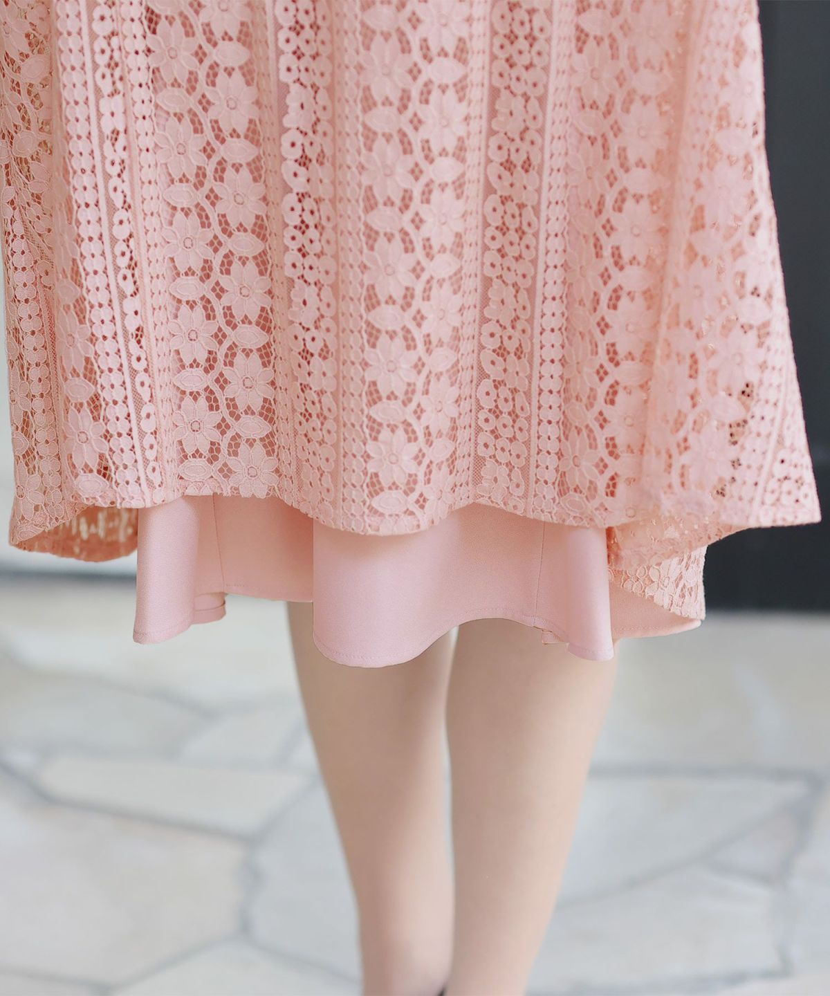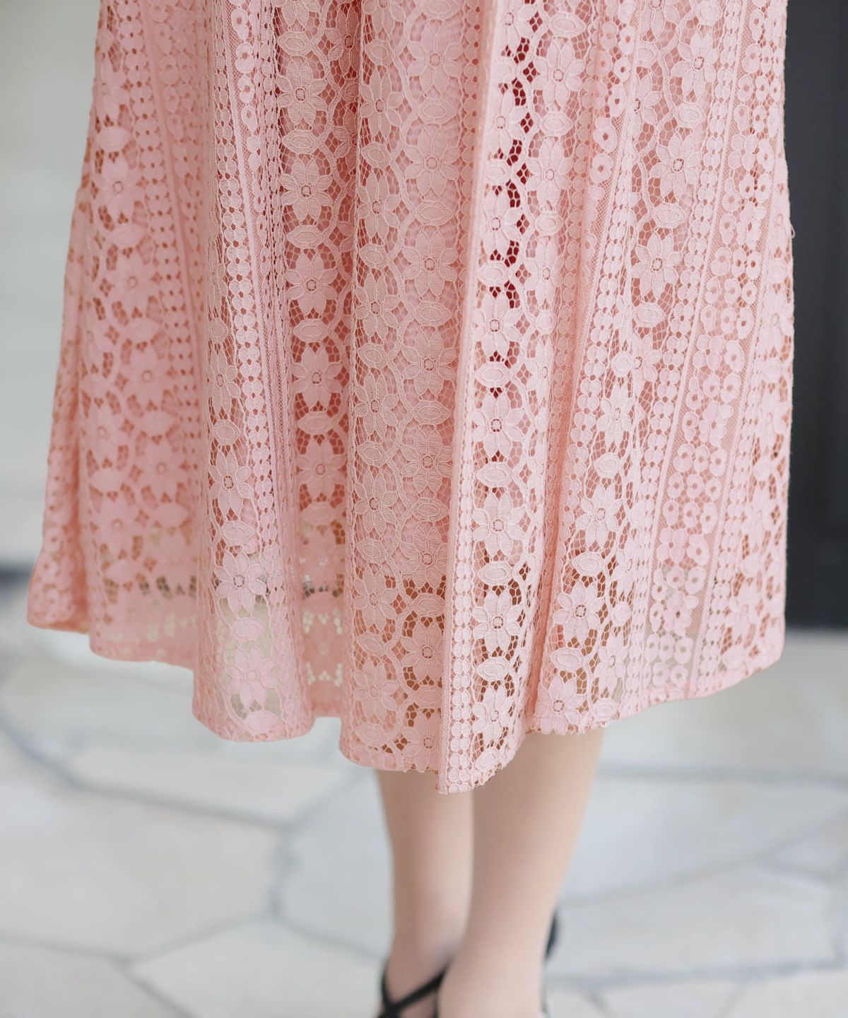 スカートは細かいプリーツと繊細な花柄レースが交互にデザインされ、裾はやや短めの裏地にすることでレースが透け、遠目からも華やかに魅力が際立ちます。