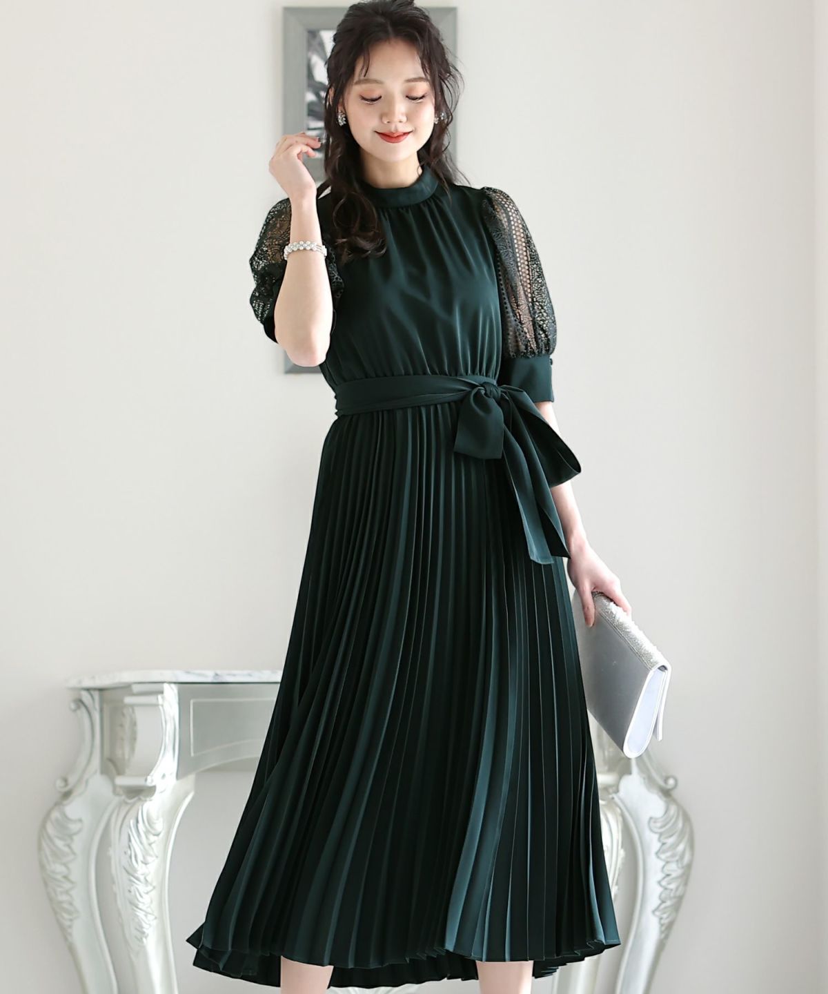 レース&プリーツロングドレス