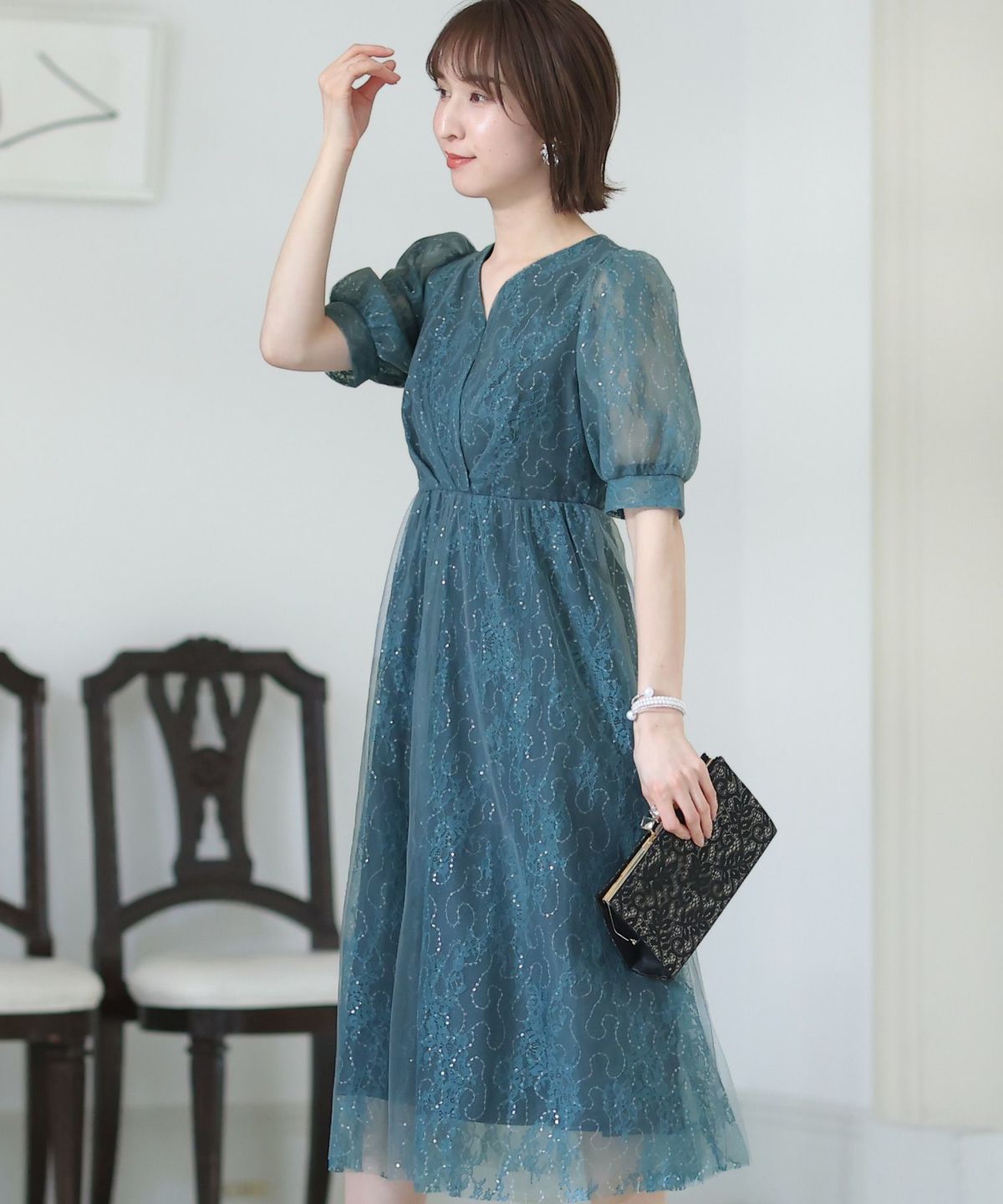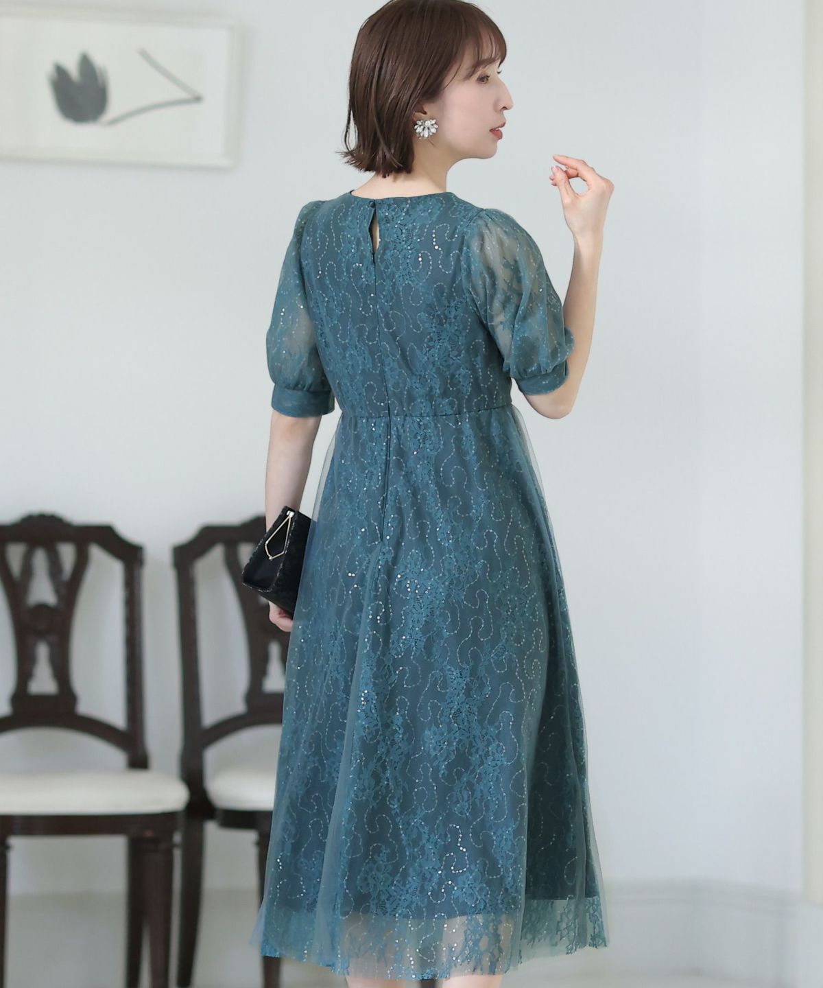一見シンプルなドレスに見えますが、計算されたレース使いは女性らしさを際立て、大人っぽい雰囲気を演出します。