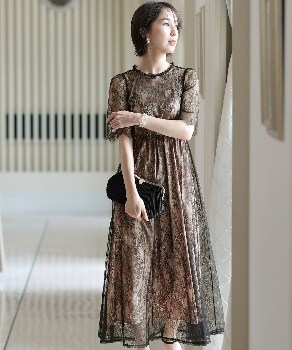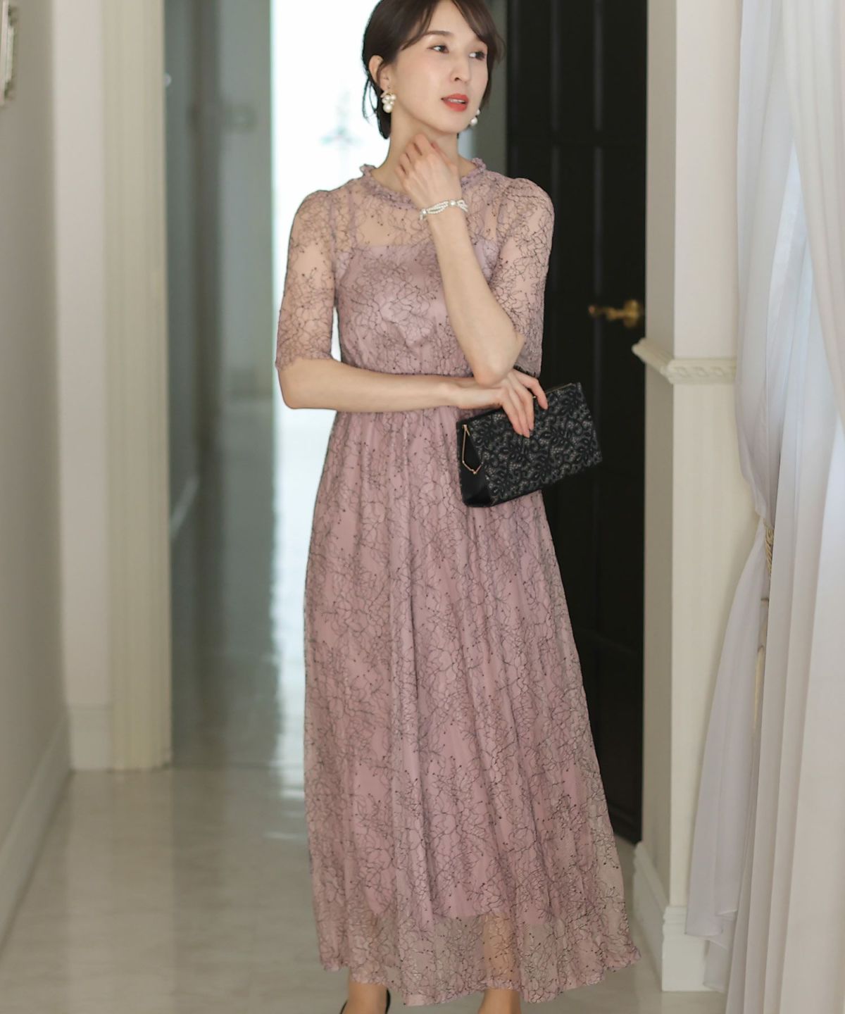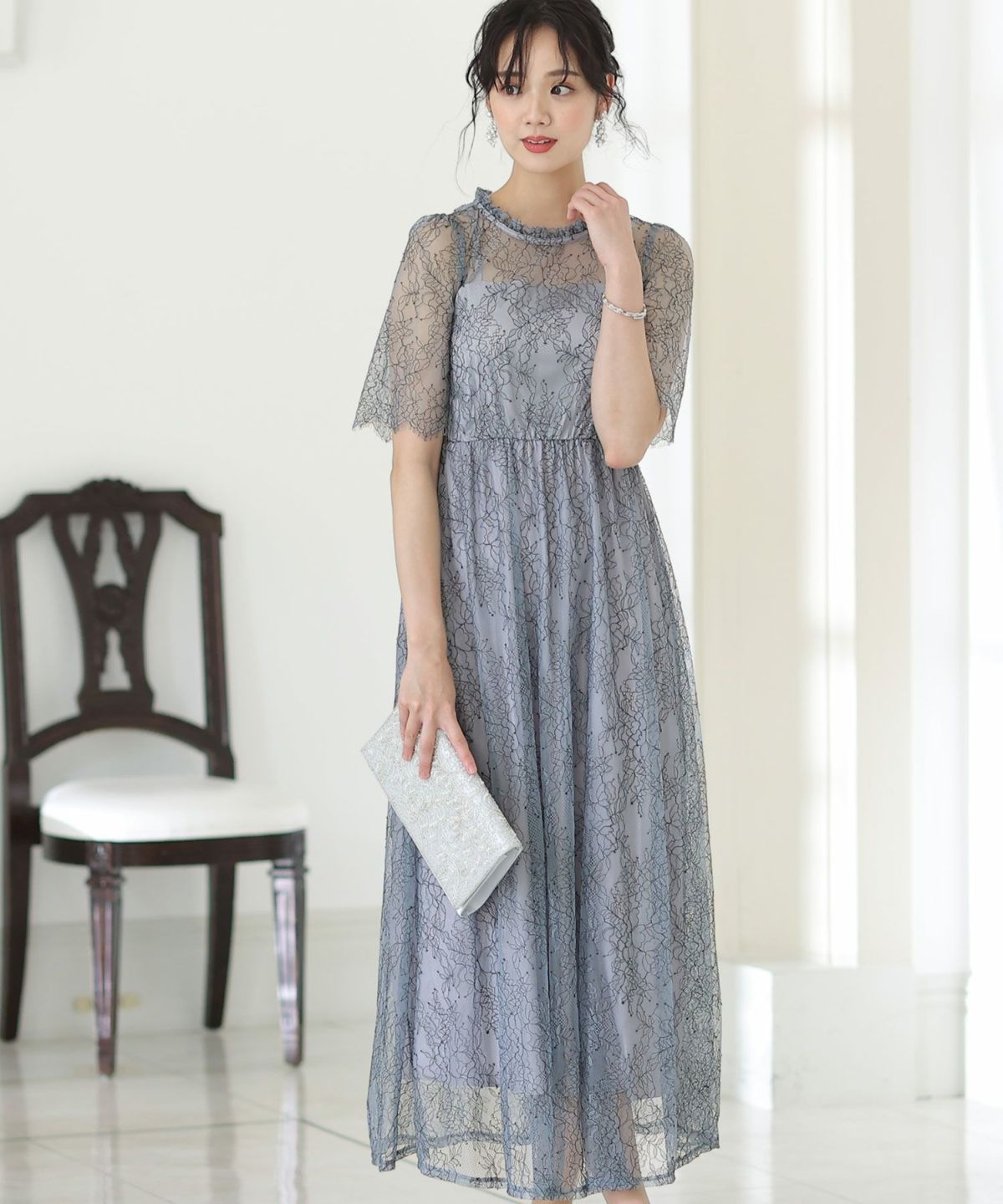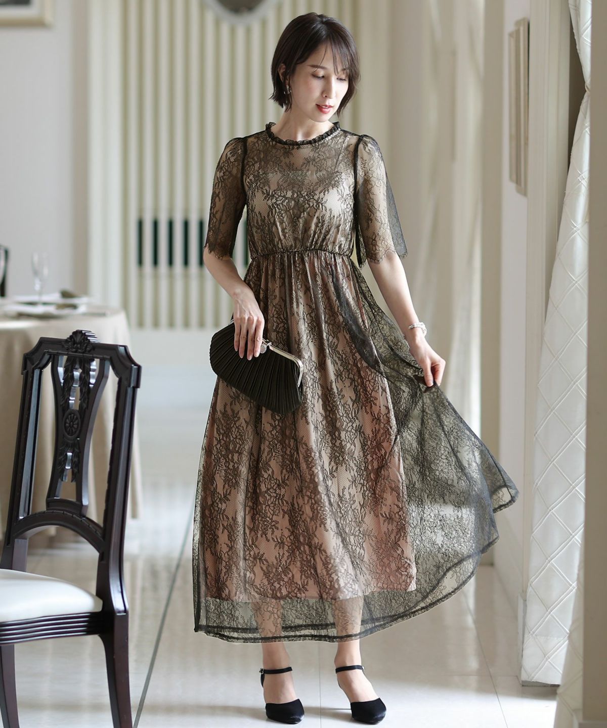 花柄の配色レースで豪華に仕上げたワンピースドレス。特別感漂うフェミニンなデザインはパーティーや結婚式などのオケージョンシーンで活躍♪