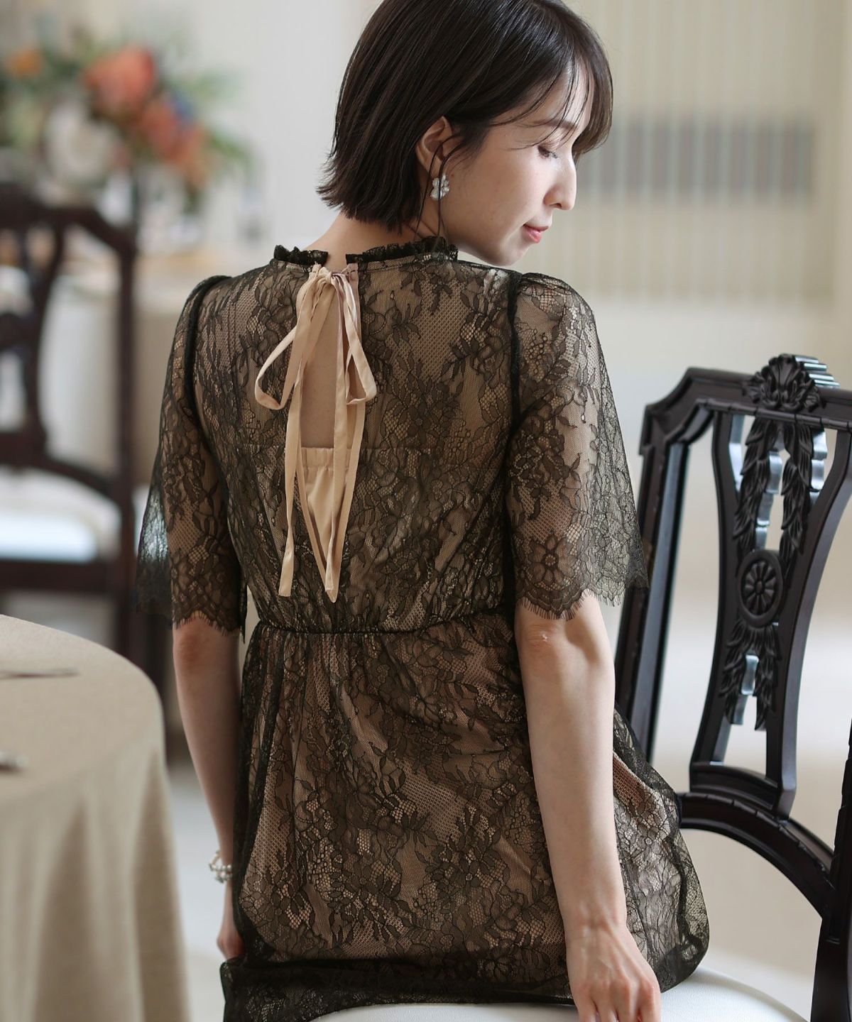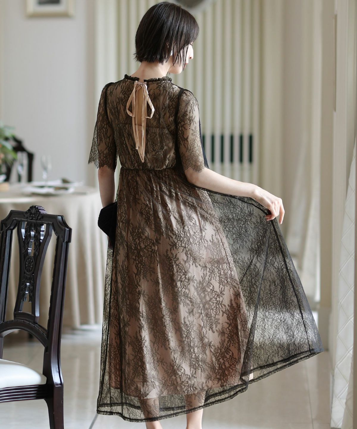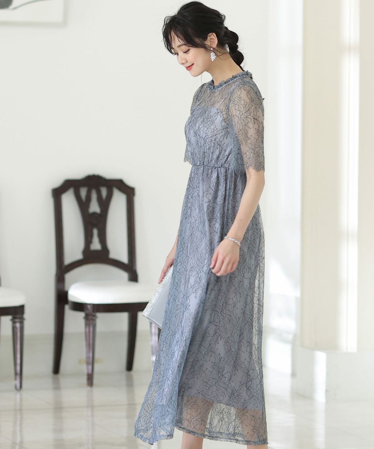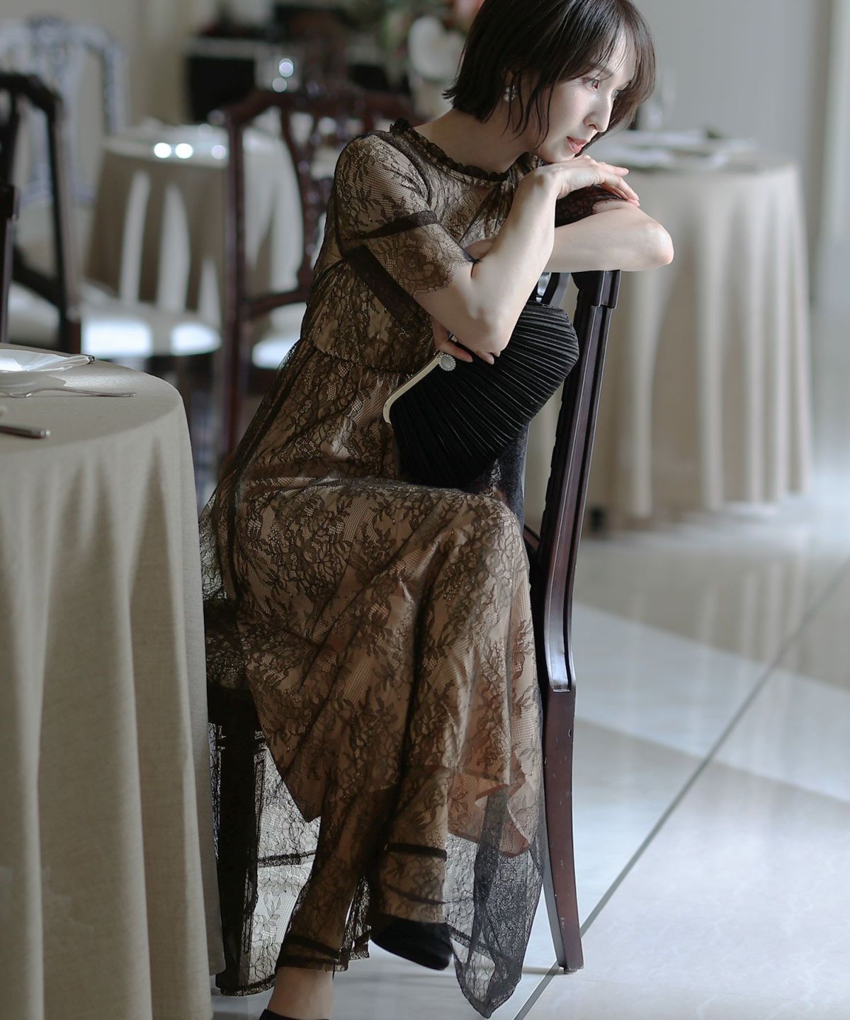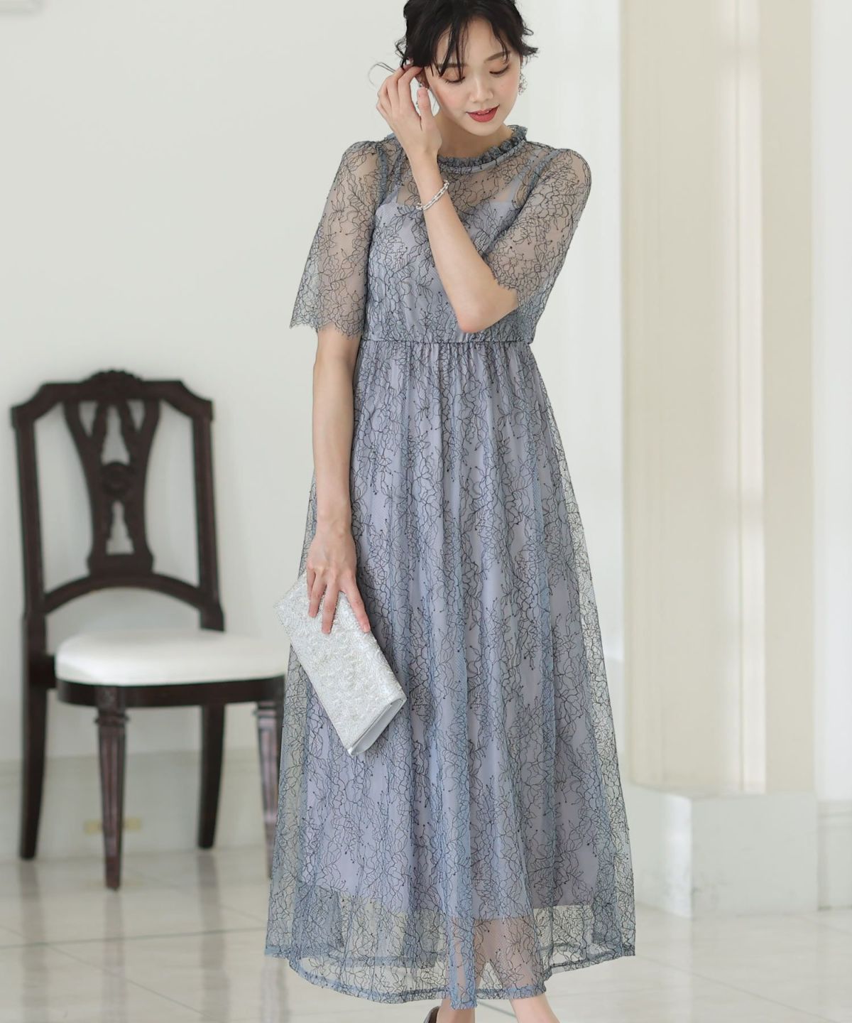 花柄の配色レースで豪華に仕上げたワンピースドレス。特別感漂うフェミニンなデザインはパーティーや結婚式などのオケージョンシーンで活躍♪