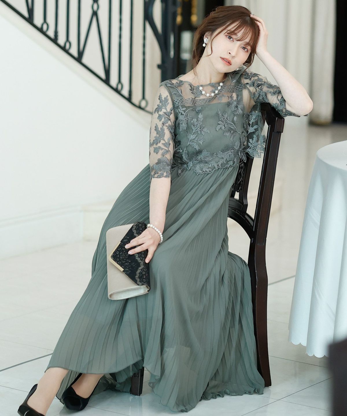 マットなジョーゼット生地で落ち着き持たせたキャミワンピース。オーガンジー使用のブラウスは高級感が溢れる刺繍の程よいツヤがより上品仕上がりに。