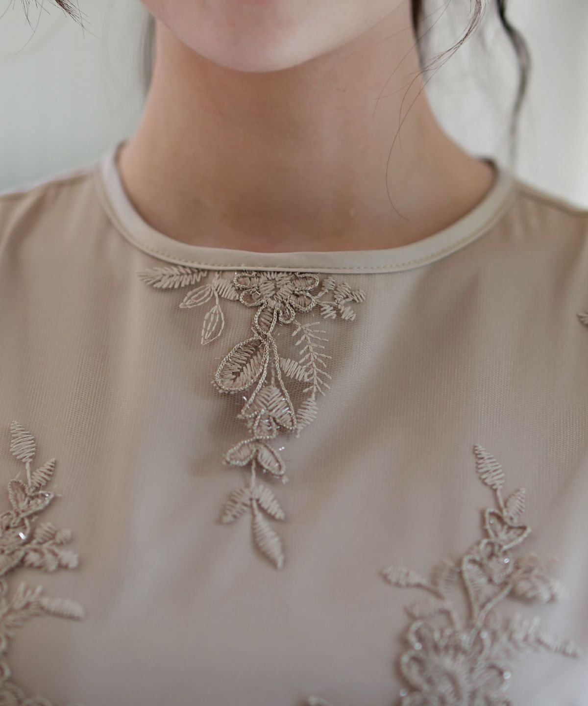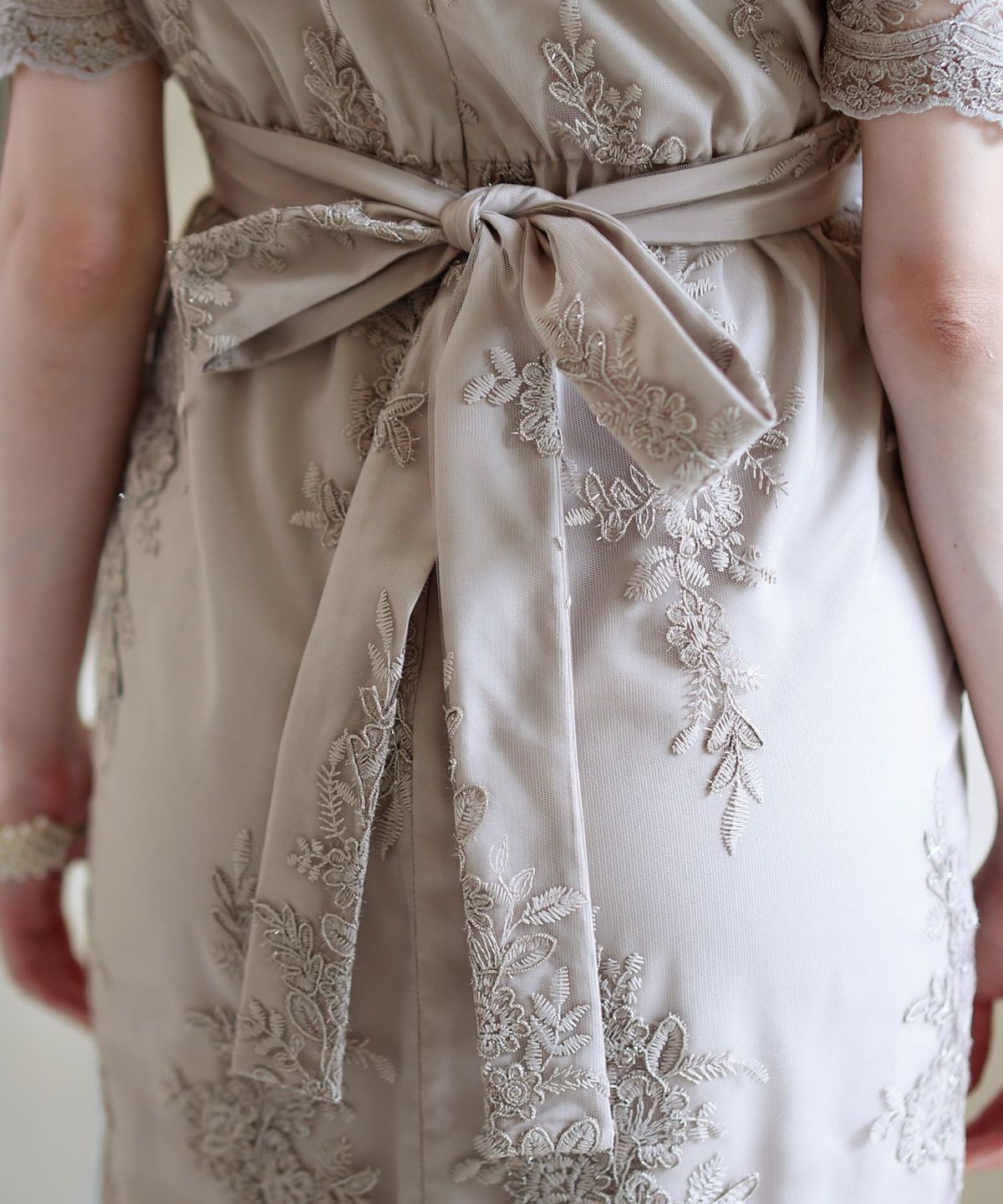 ■刺繍レース×モールが華やかなタイトドレス全身に施された刺繍レースとモールがキラキラとひかり華やか。透け感のあるビショップスリーブがかわいらしく、女性らしい印象を与えます。クールなタイトドレスに華やかなレースが加わることで、かわいらしくも着ていただける一着です。