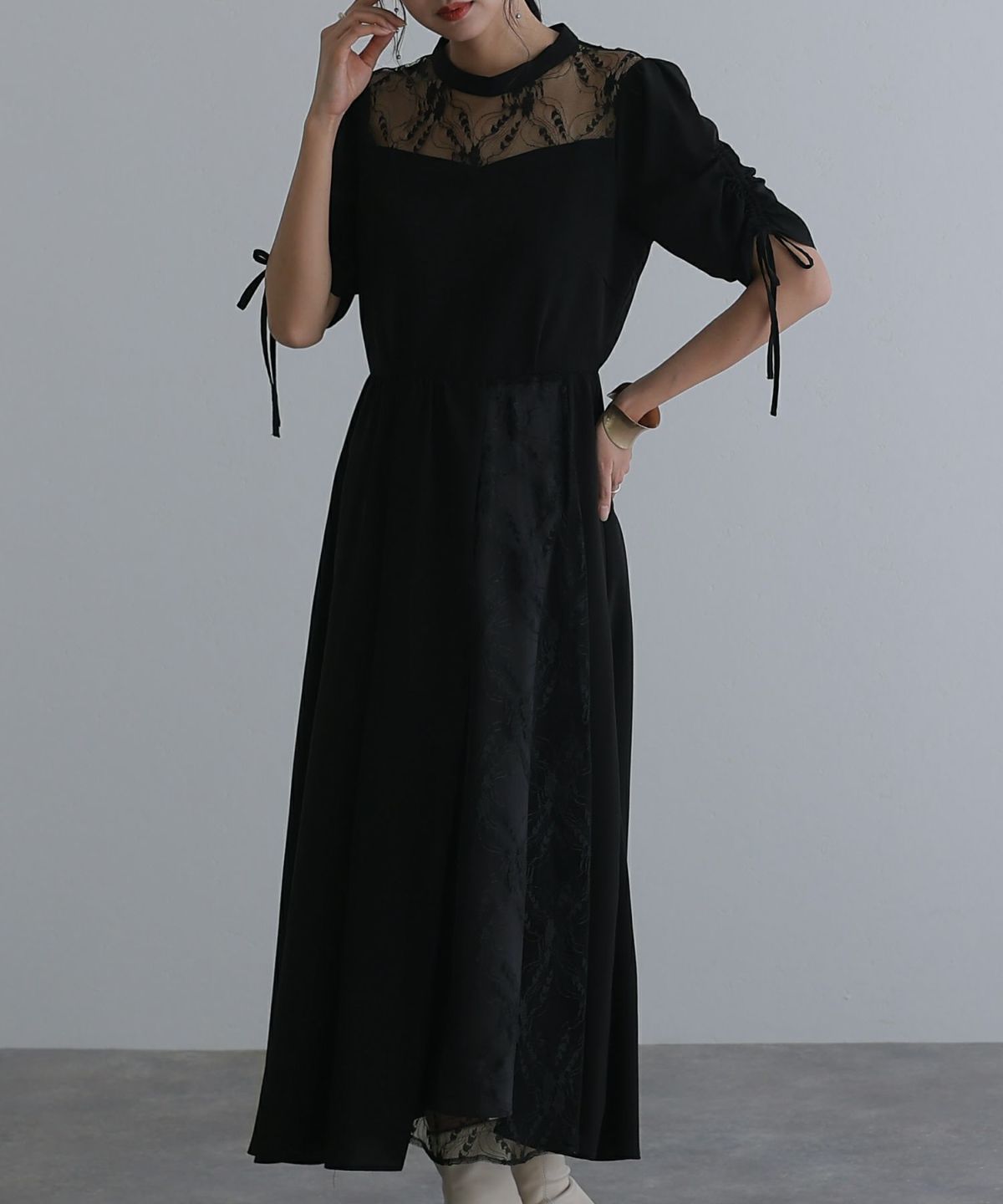 ■レース×ギャザースリーブギャザースリーブのリボンを結ぶと可愛らしい印象に。デコルテとスカートに施されたレースが上品なワンピースです。歩くとスカートがふわっと揺れて華やかさもアップします。背面ゴムで着脱も楽ちんです。