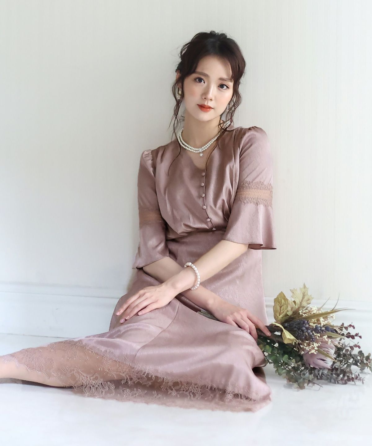■スカート裾の切替レースが華やかさをプラス艶やかな光沢感のあるサテン生地のワンピースです。着心地も軽くさらりと着て頂けます。