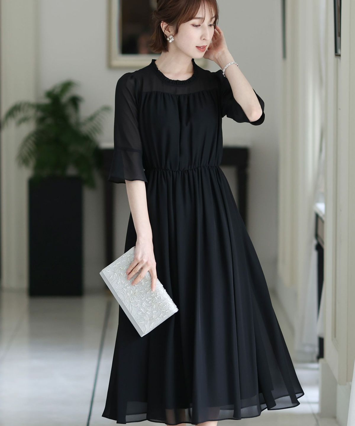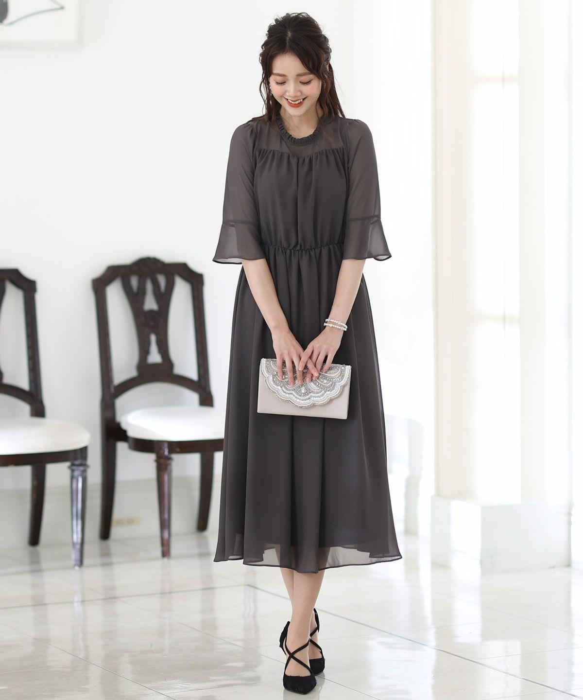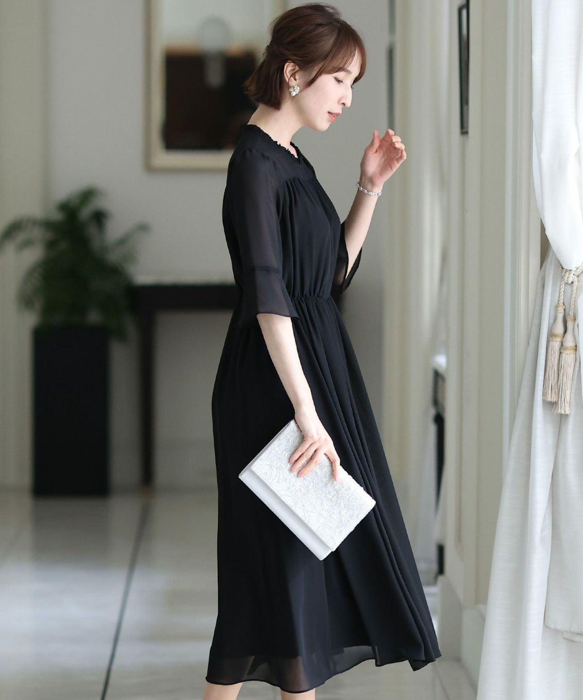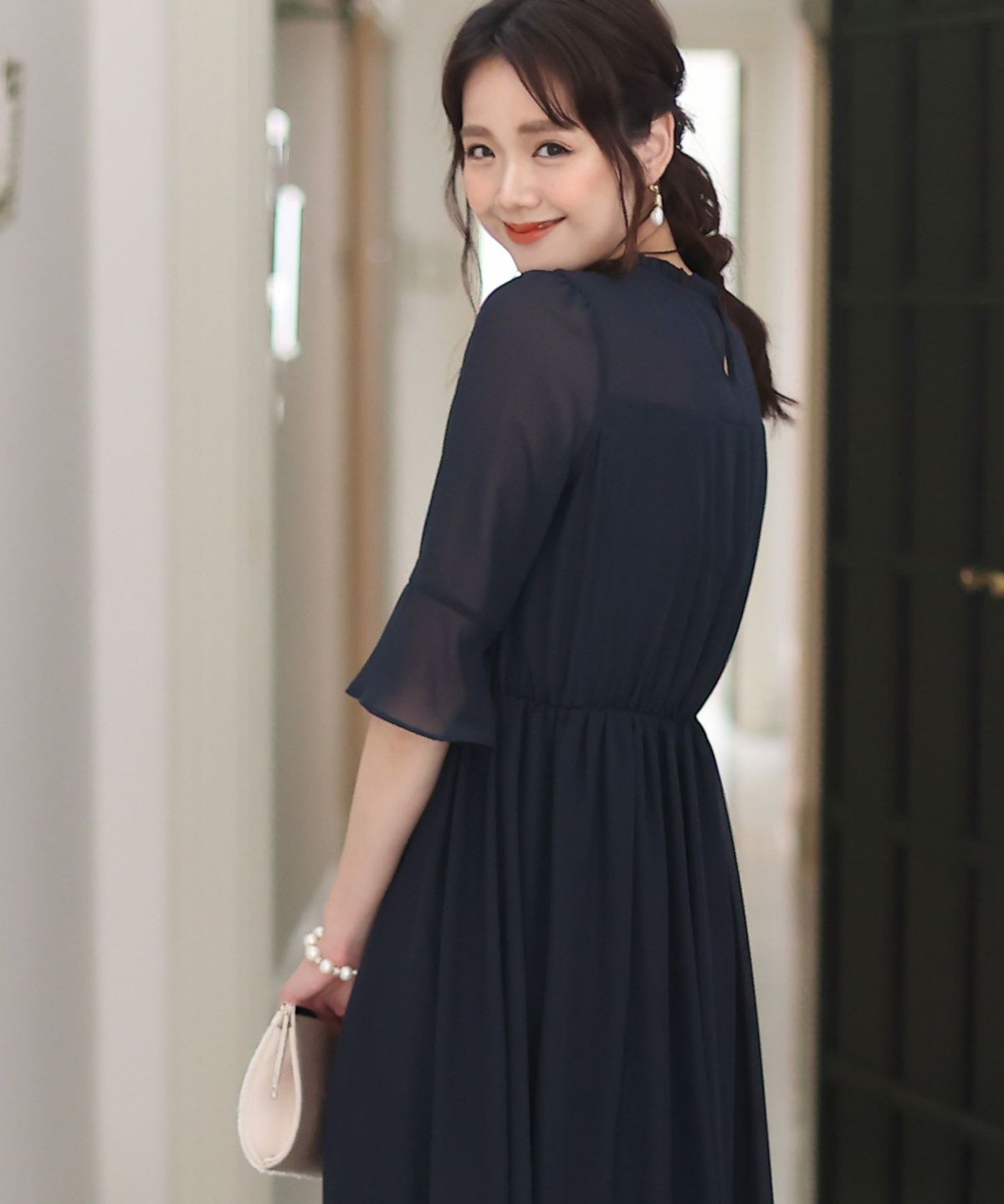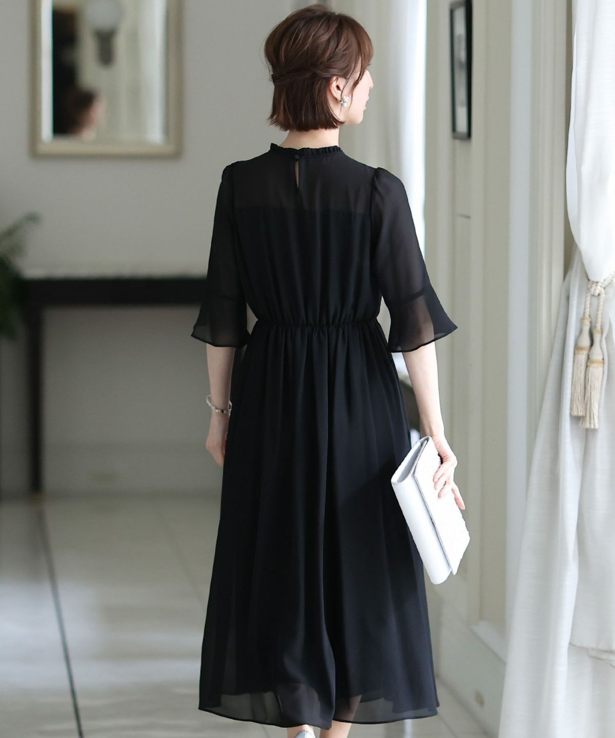 ■ベルスリーブ×シフォンのフェミニンなワンピース袖のベルスリーブスタイルがポイントになるワンピースです。フェミニンなデザインに透け感が加わることで大人な女性の着こなしになるアイテムです。アウターや小物アイテムを合わせてデイリーでも着てい頂けます。首元と袖のフリルがポイントになりシンプルな中にデザイン性のあるワンピースです。