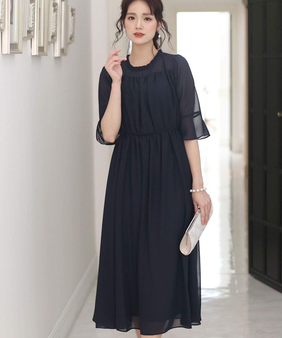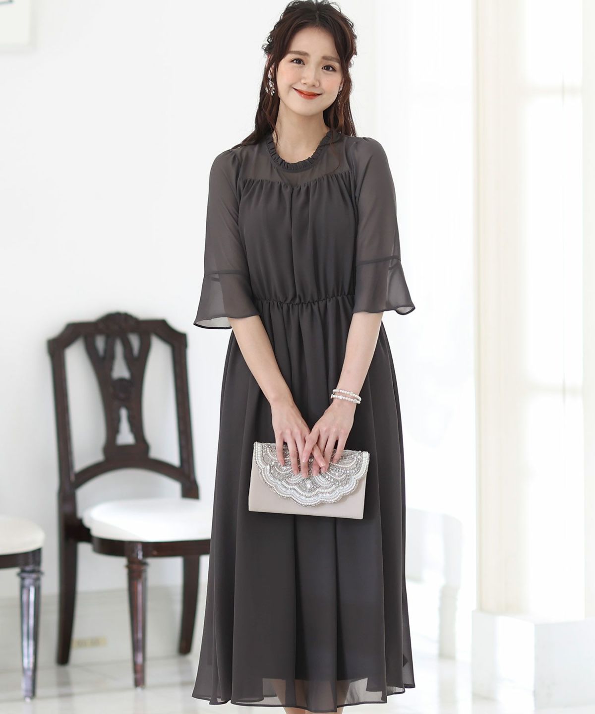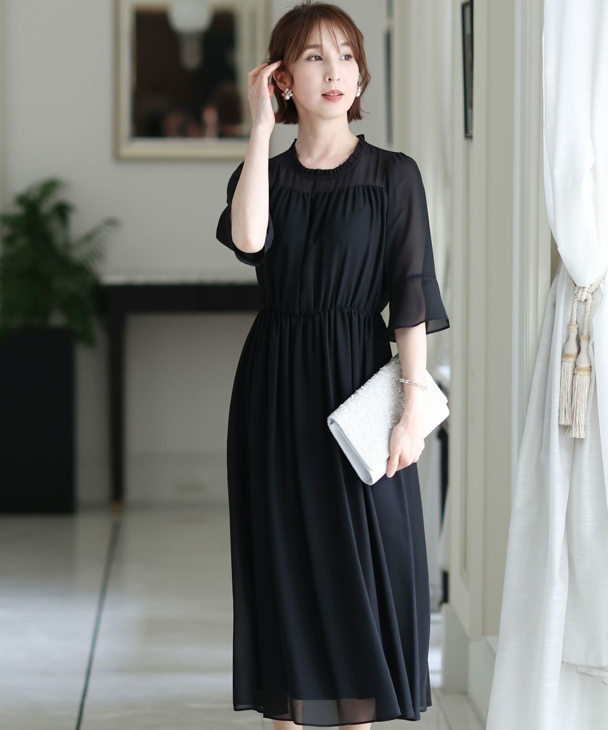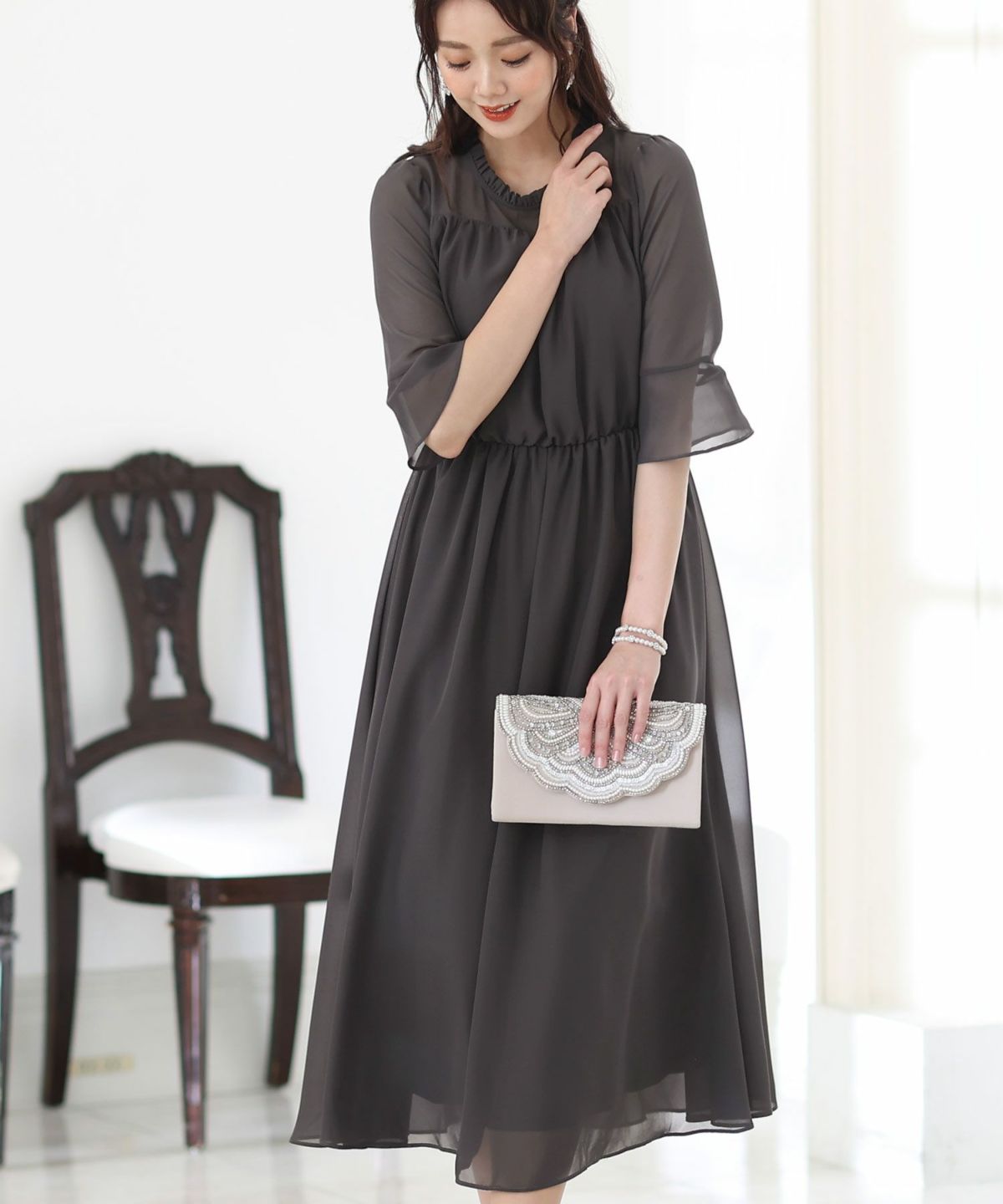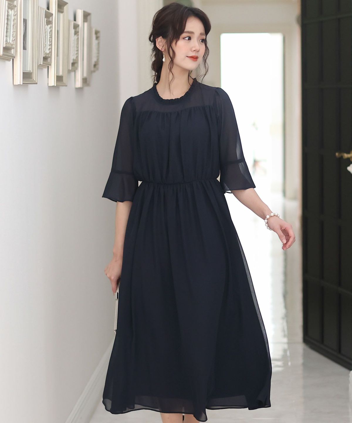 ■ベルスリーブ×シフォンのフェミニンなワンピース袖のベルスリーブスタイルがポイントになるワンピースです。フェミニンなデザインに透け感が加わることで大人な女性の着こなしになるアイテムです。アウターや小物アイテムを合わせてデイリーでも着てい頂けます。首元と袖のフリルがポイントになりシンプルな中にデザイン性のあるワンピースです。