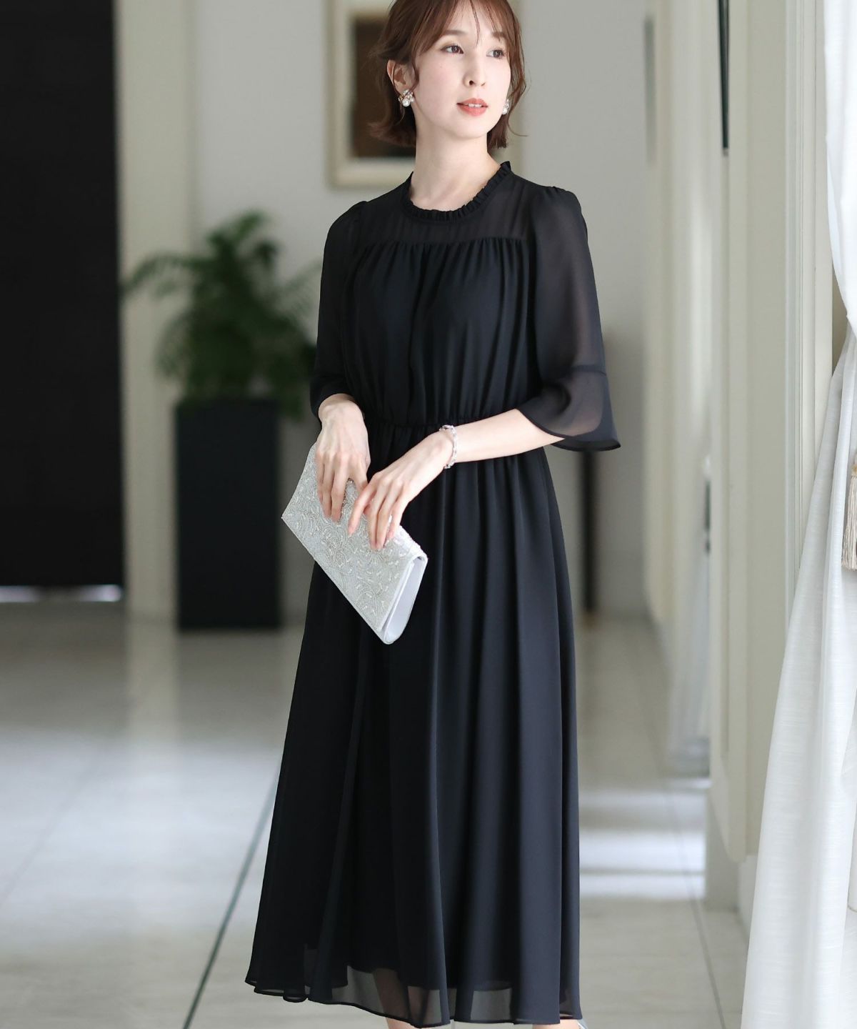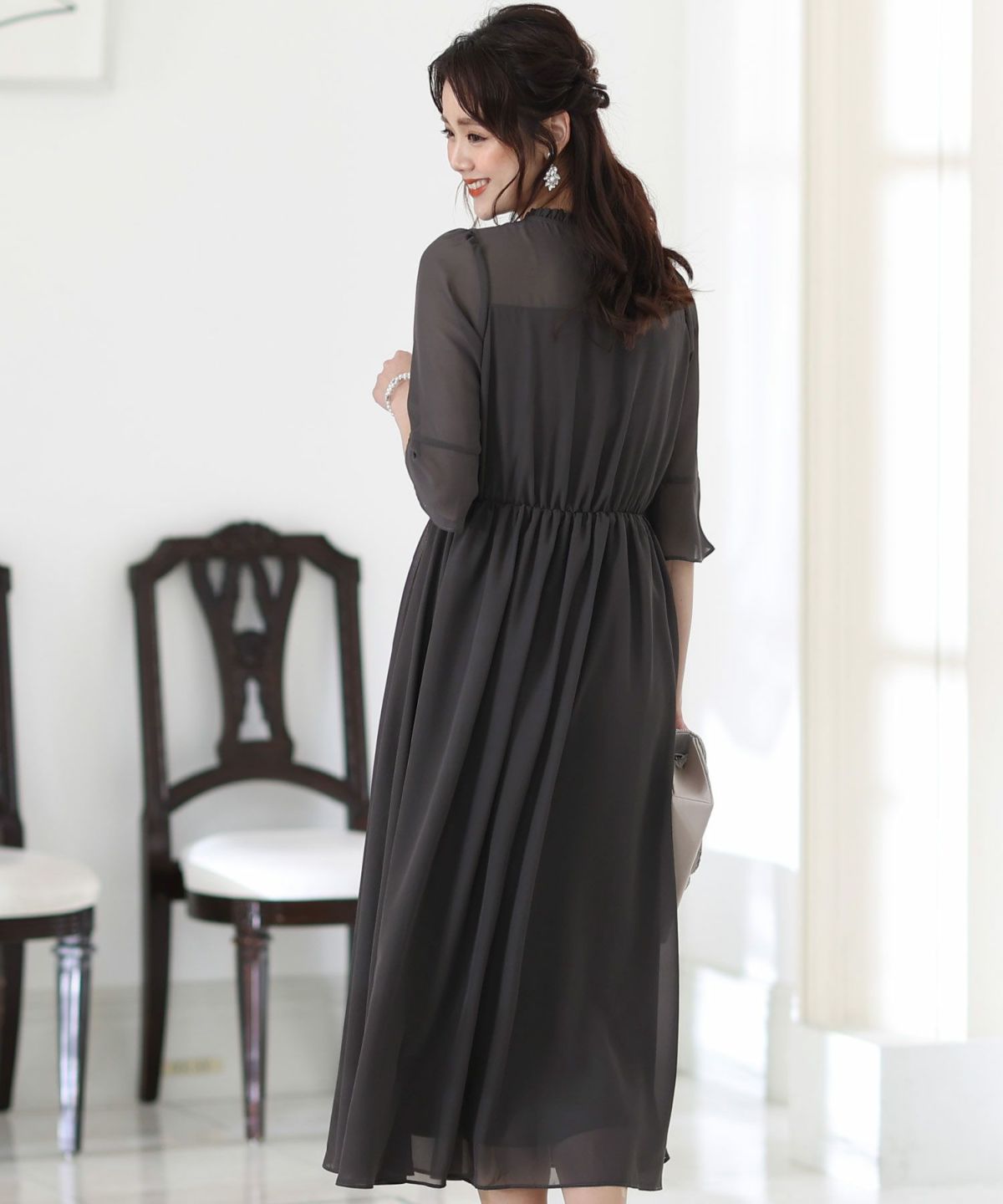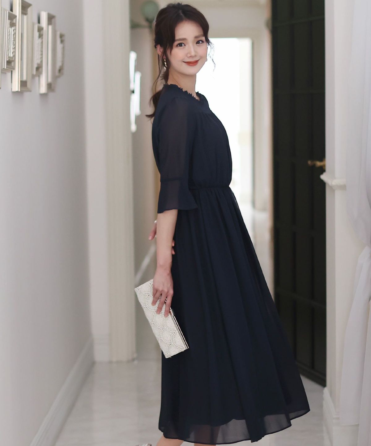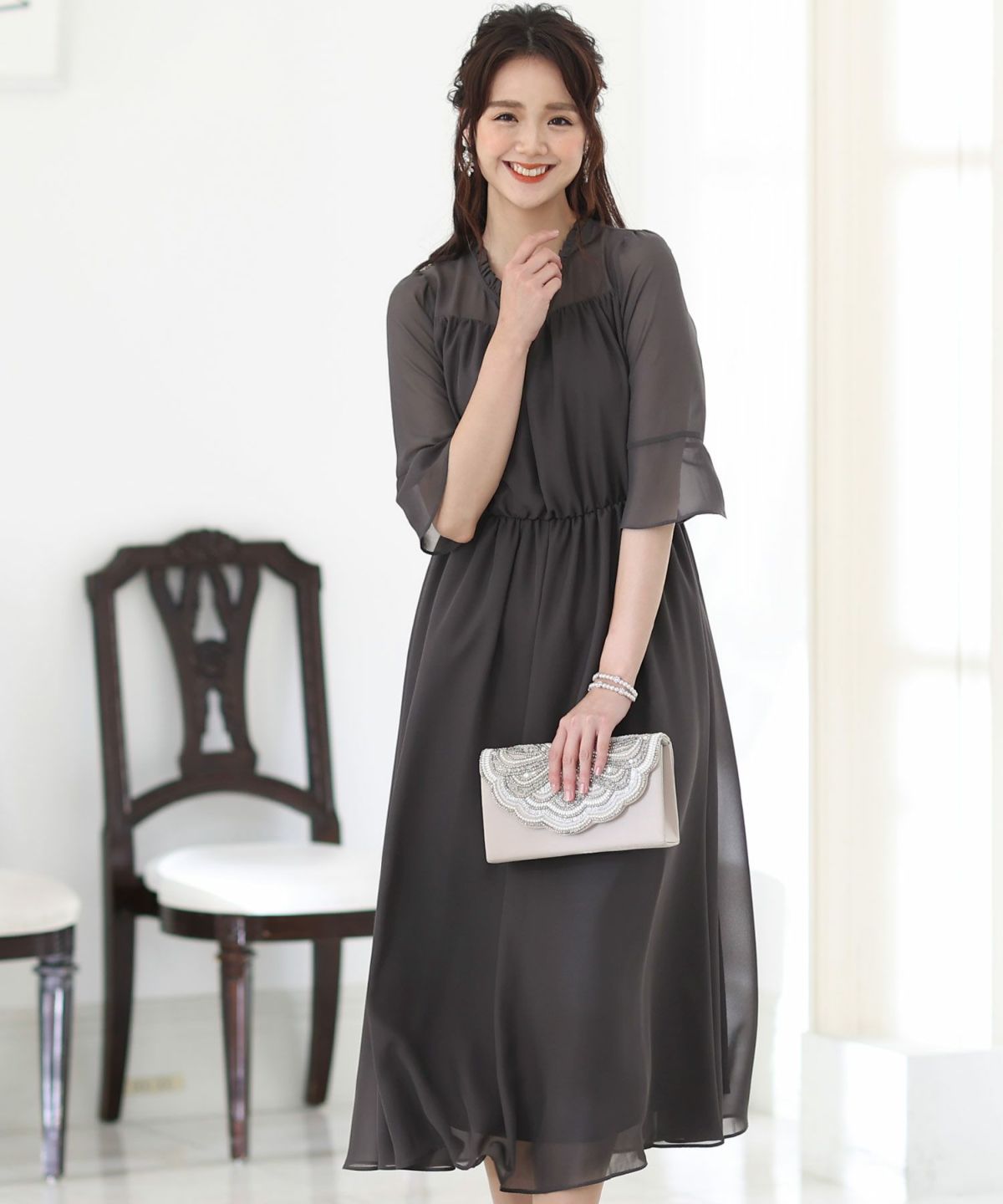 ■ベルスリーブ×シフォンのフェミニンなワンピース袖のベルスリーブスタイルがポイントになるワンピースです。フェミニンなデザインに透け感が加わることで大人な女性の着こなしになるアイテムです。アウターや小物アイテムを合わせてデイリーでも着てい頂けます。首元と袖のフリルがポイントになりシンプルな中にデザイン性のあるワンピースです。
