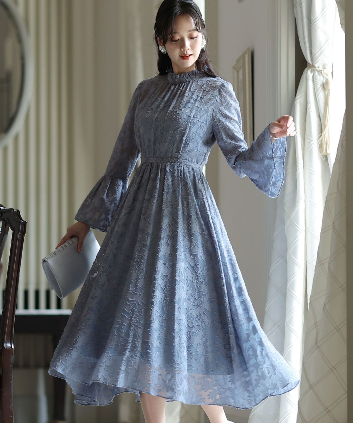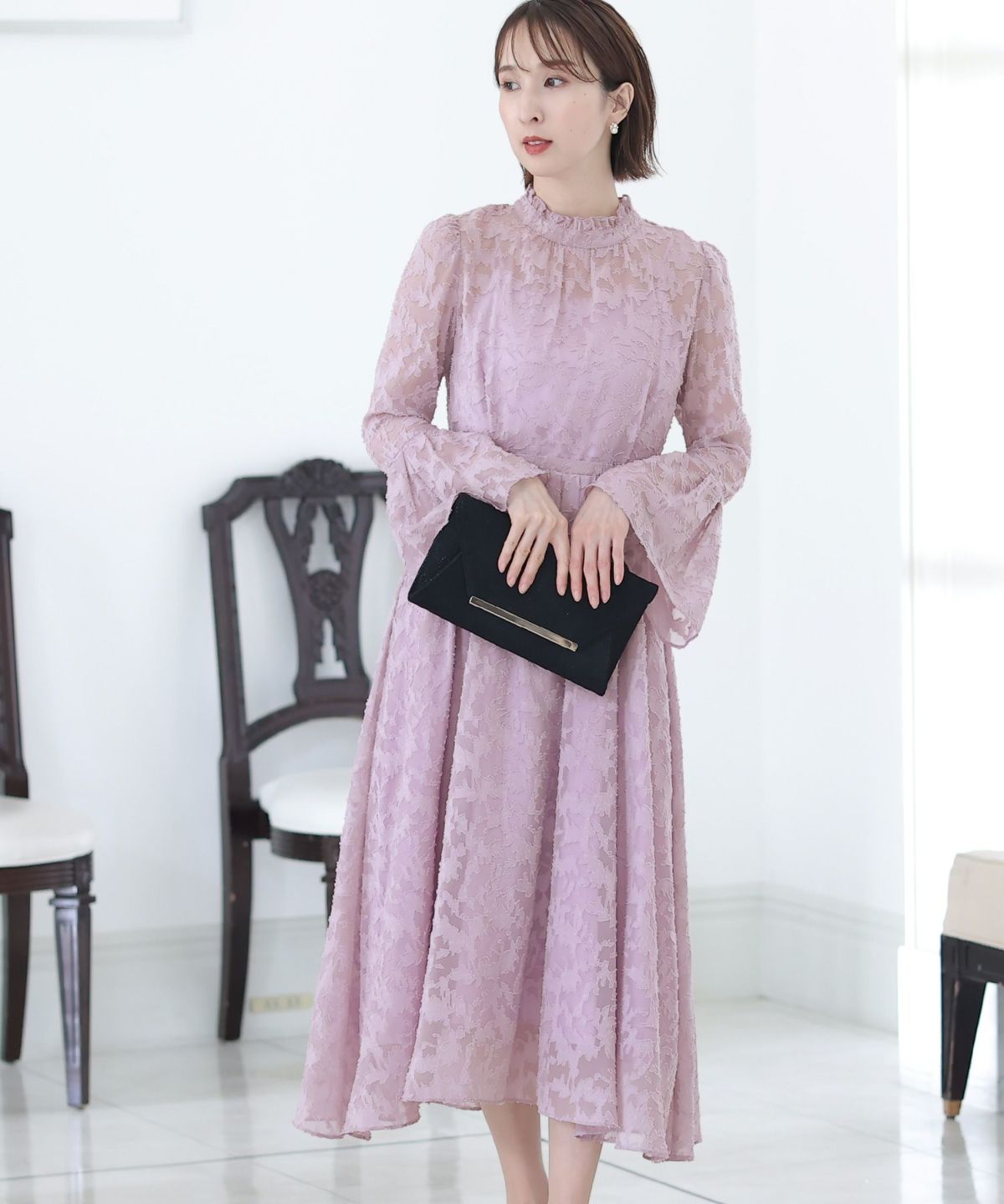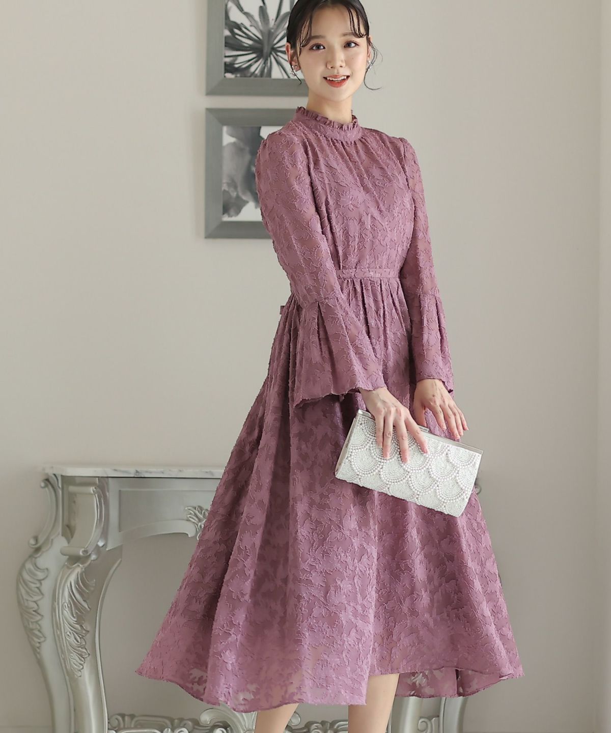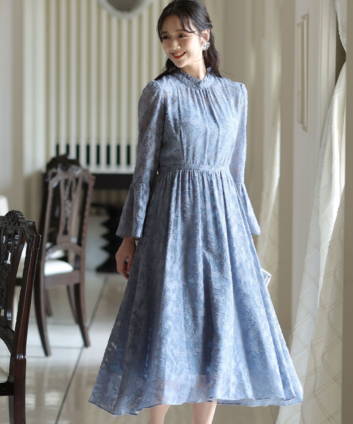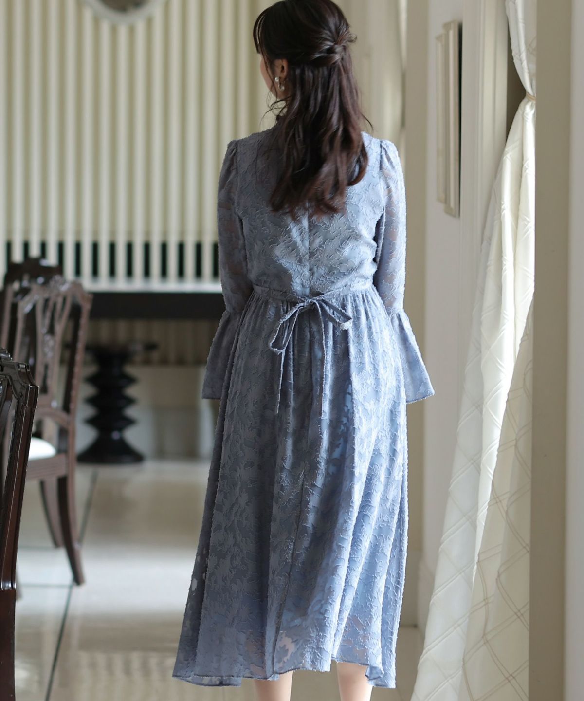 ■シアー×ジャガードレースシアー感がトレンドライクなジャガードレースのワンピース。ベルスリーブとハイネックで上品な雰囲気を演出します。後ろにはリボン付きでバックスタイルも可愛い印象に。軽く着心地が良いワンピースで、普段使いにもぴったりです。