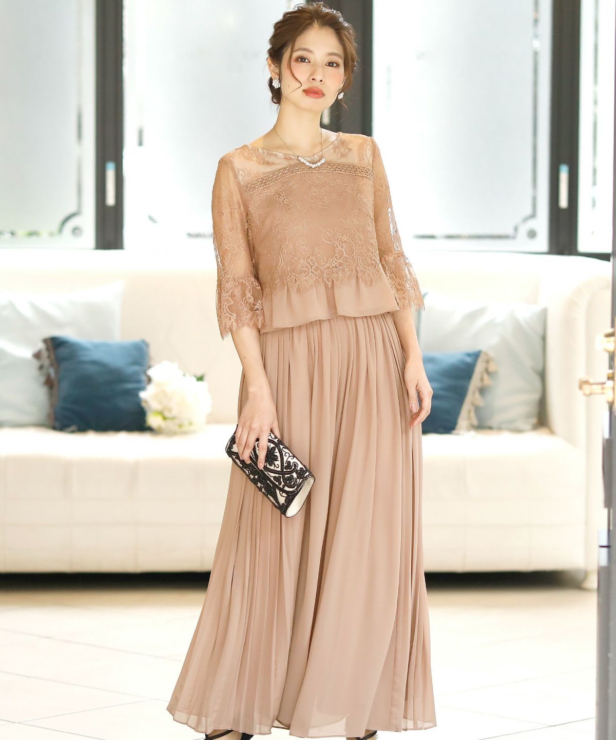 レース袖で気になる二の腕をカバー♪短めトップスとハイウエストパンツで脚長効果もある優秀ドレスです。