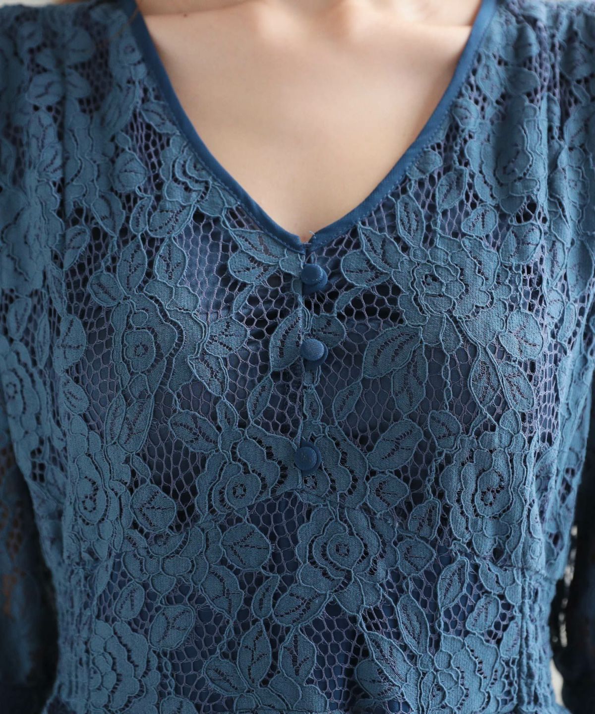 デコルテ部分はすっきりVネックデザインで胸元には可愛いくるみボタンが♪