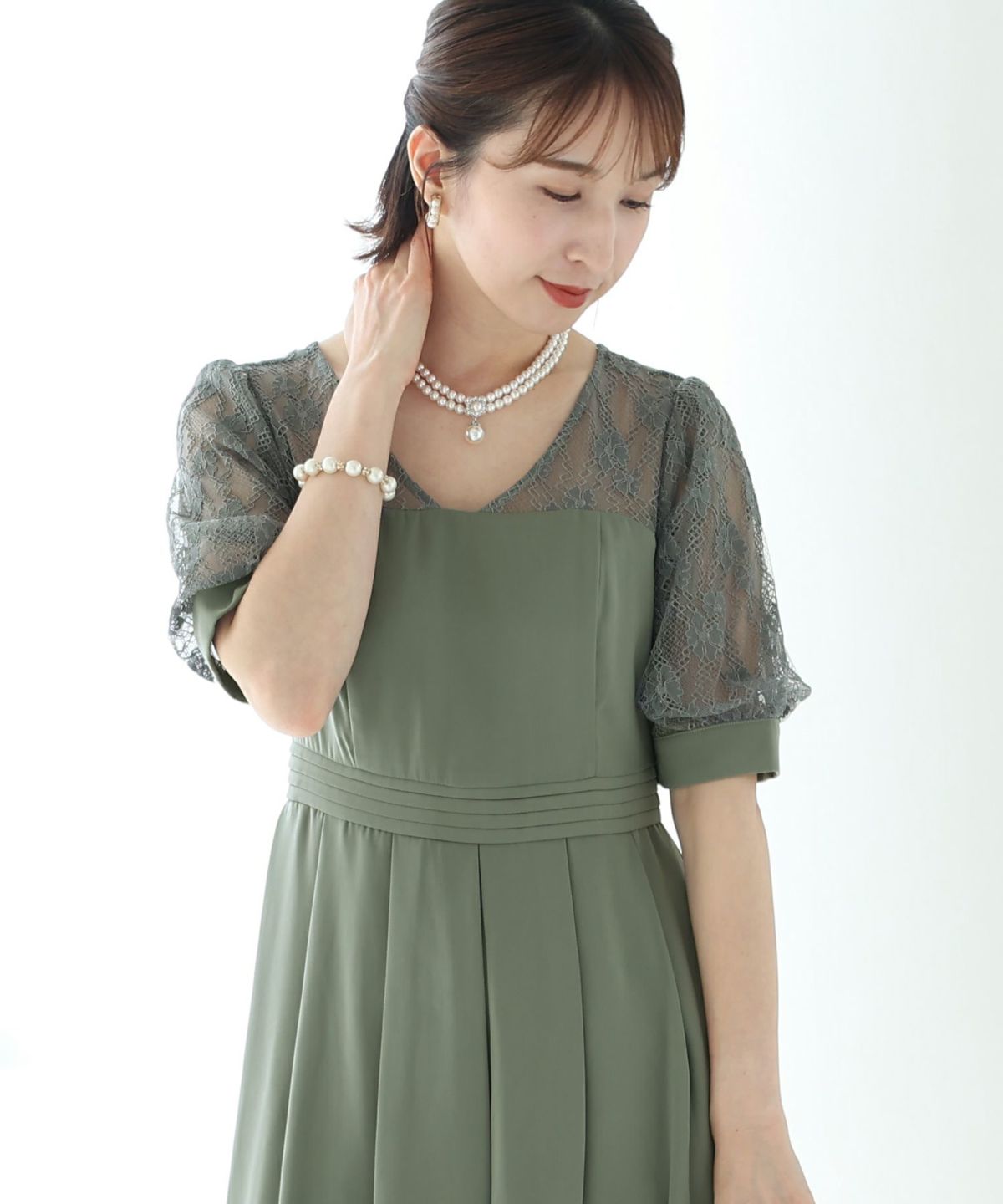 ■大胆に空いたレースのVネックがセンシュアル。体型カバーポイント:【二の腕】【脚】【ヒップ】カラーに合わせたレースがかわいらしく、程よい透け感が女性らしさの演出を手助け。控えめなボリューム袖で華奢見え効果も◎