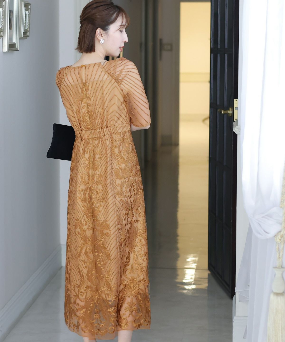 ■デコルテからスリーブにかけた透け感が上品高めのウエストラインで自然なスタイルアップが期待できます。