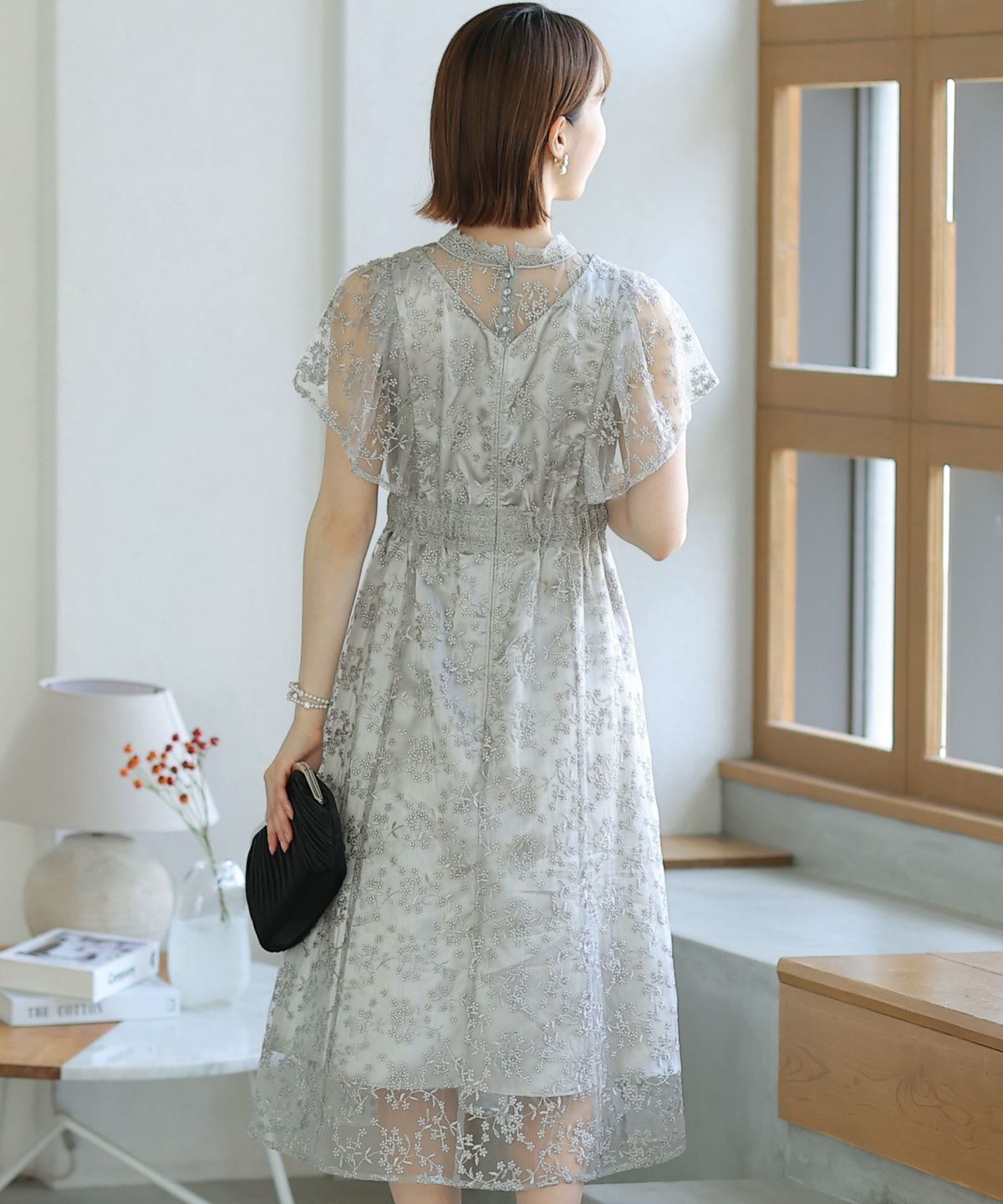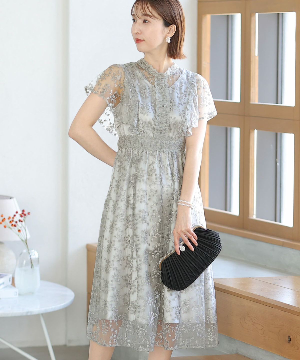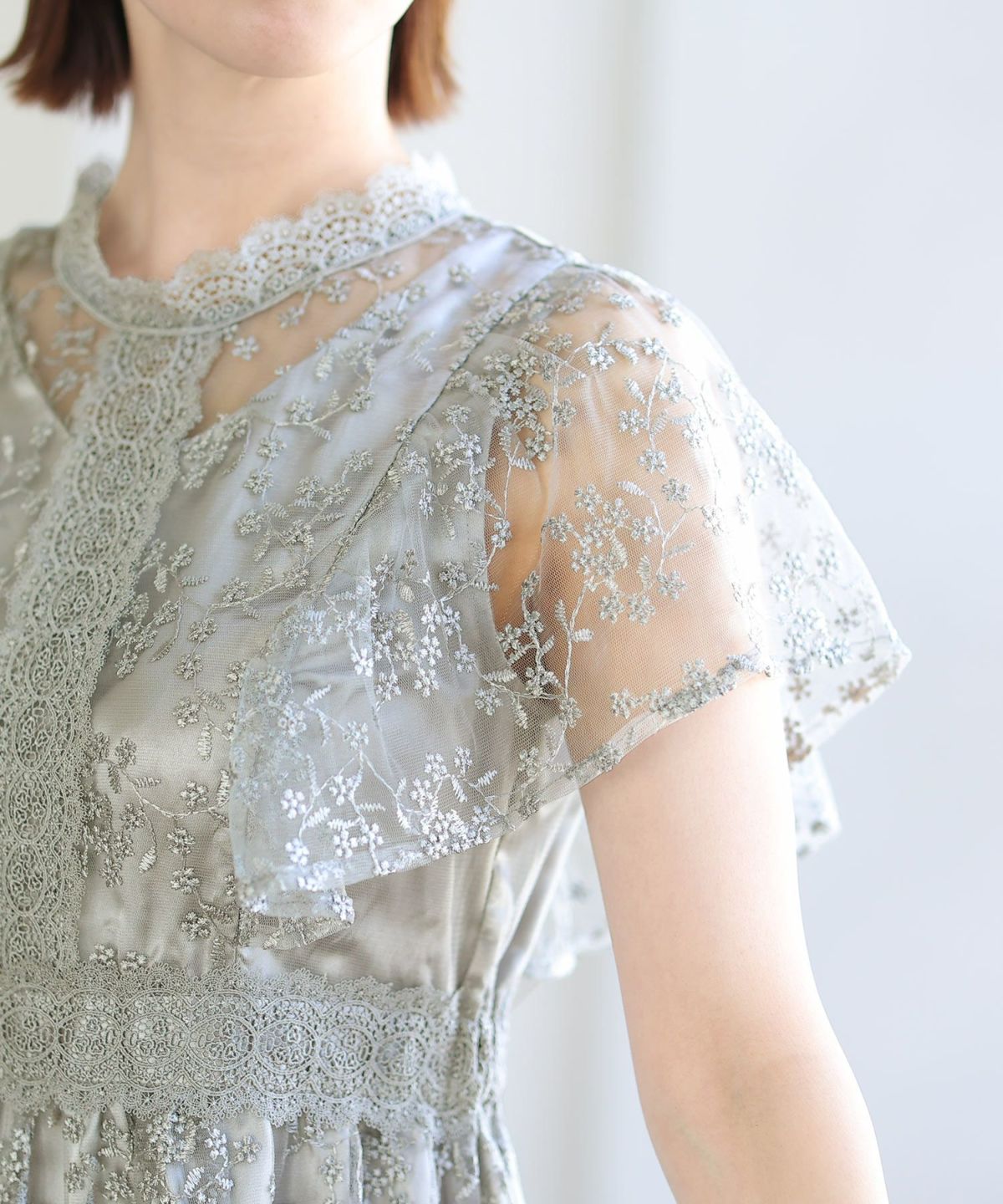光沢感のある刺繍が華やかな総レースワンピース ハシゴレース×刺繍レースワンピース