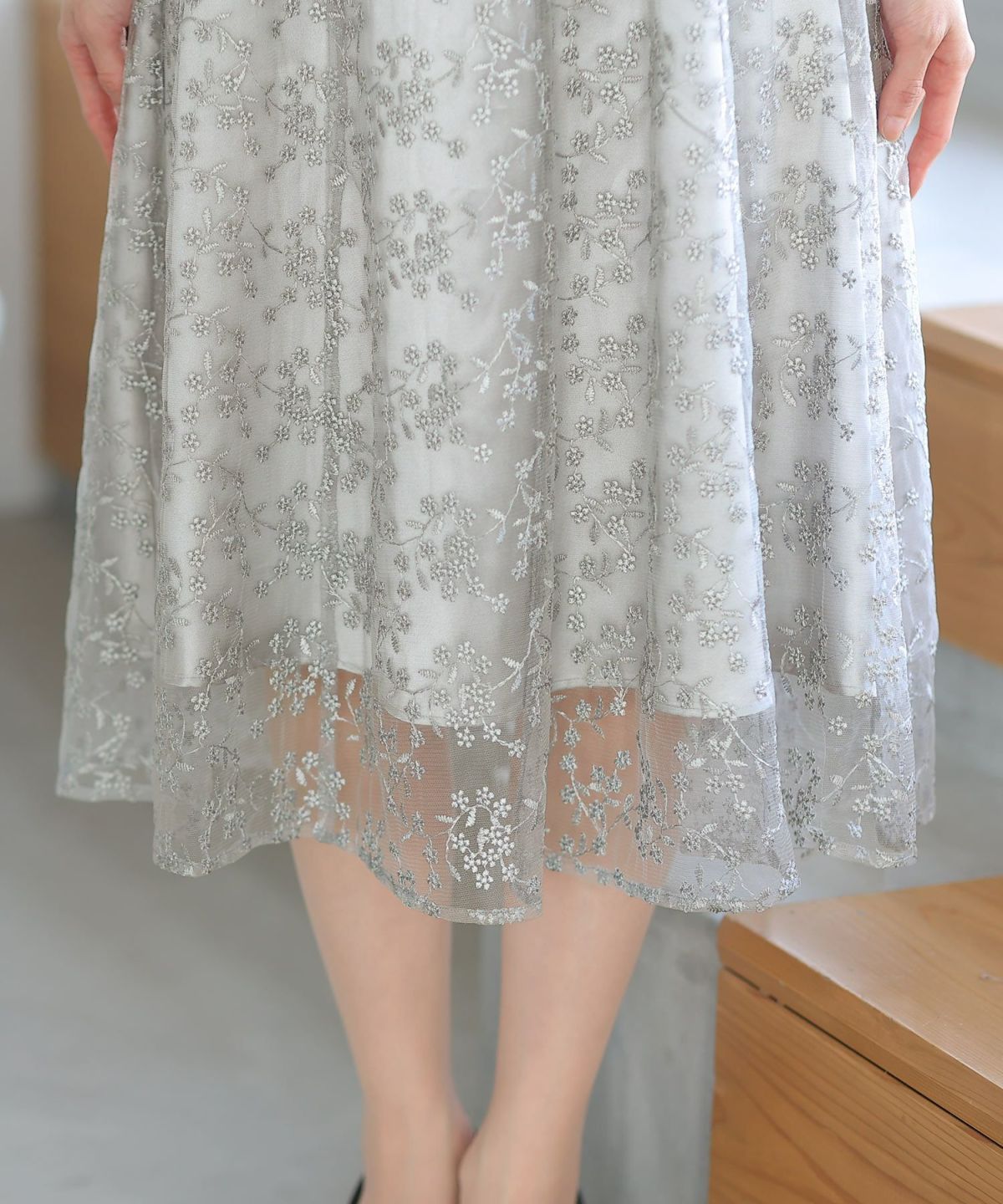■デコルテや裾の透け感が女性らしい体型カバーポイント:【二の腕】【脚】【ウエスト】【ヒップ】フレアスカートが気になる下半身をカバーしてくれます。幅広なレースのウエストマークで細見え効果も。