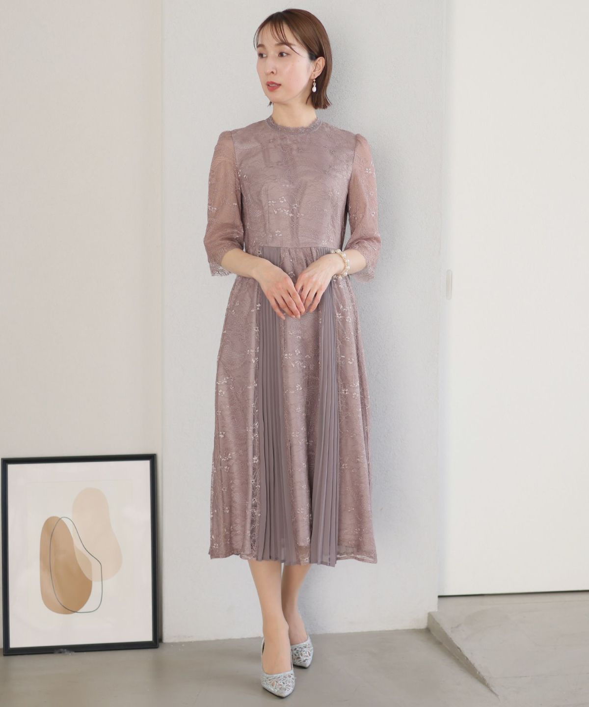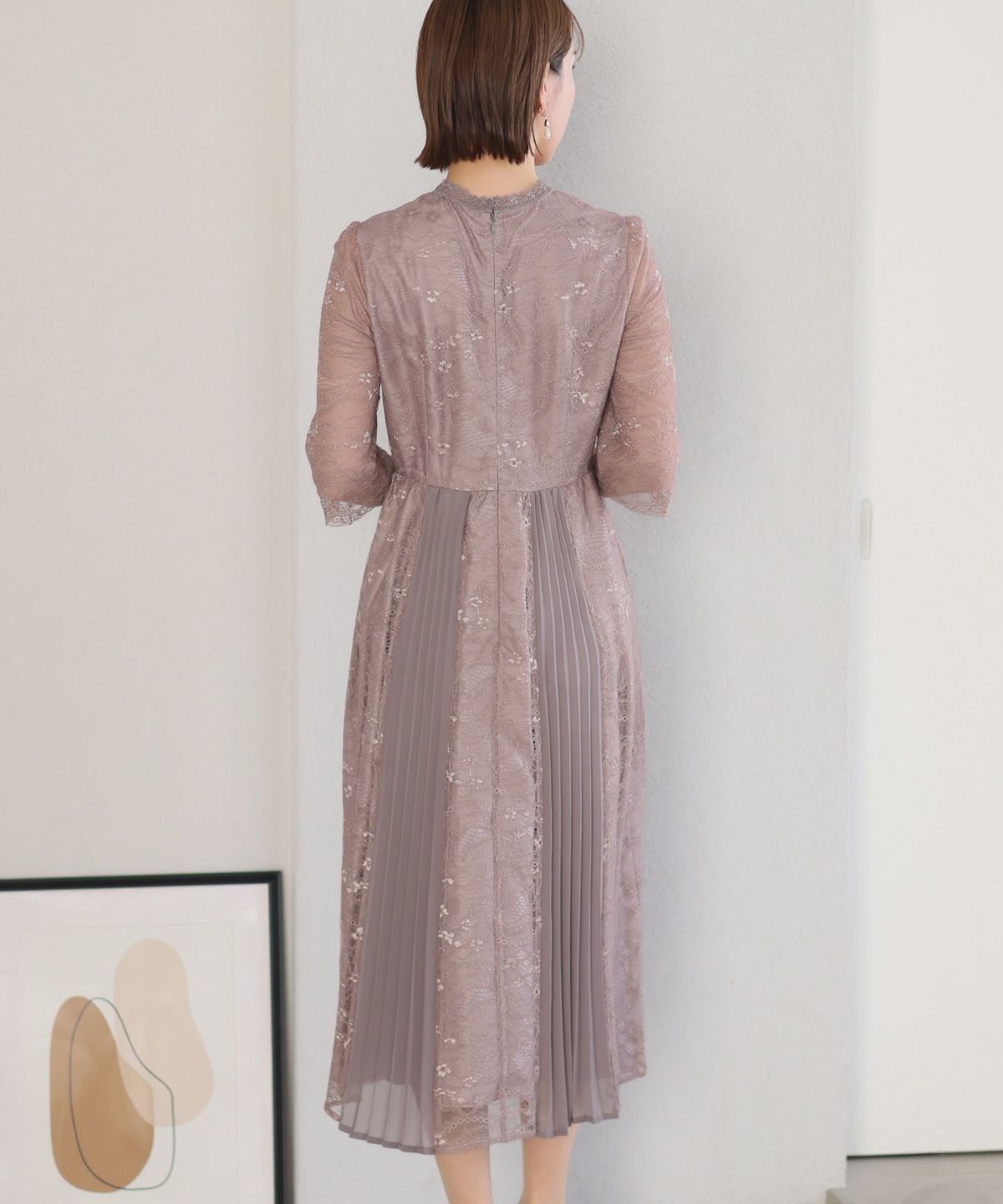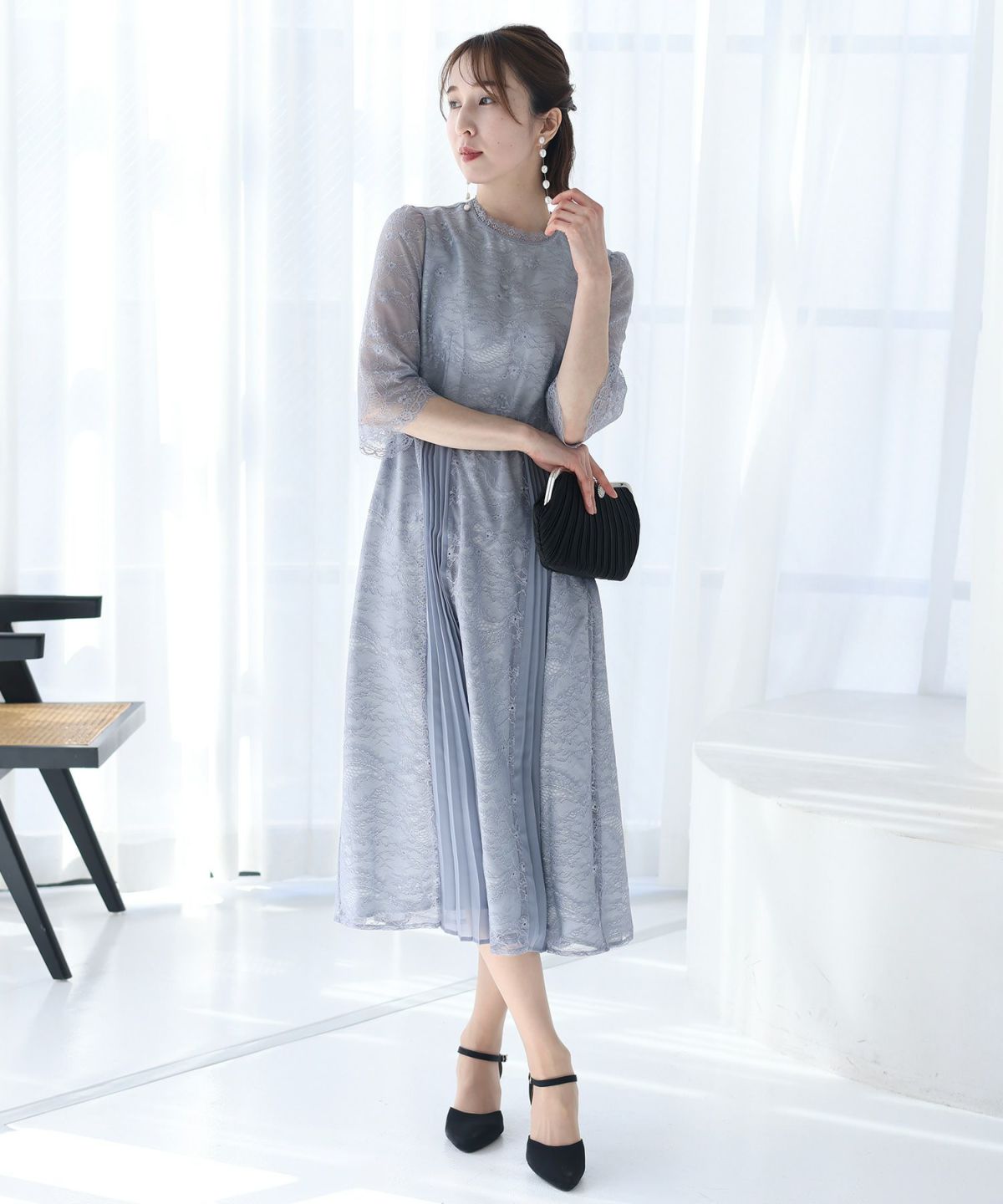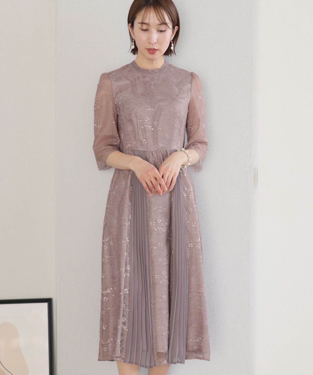 ■花柄レース×シフォンプリーツ花柄レースとシフォンプリーツの切り替えが女性らしく可愛いワンピースです。甘めのデザインですが落ち着いたカラーで大人女性にぴったり。首元には細かい刺繍がほどこされていておしゃれ。オケージョンシーンや特別なお食事会などにもおすすめです。