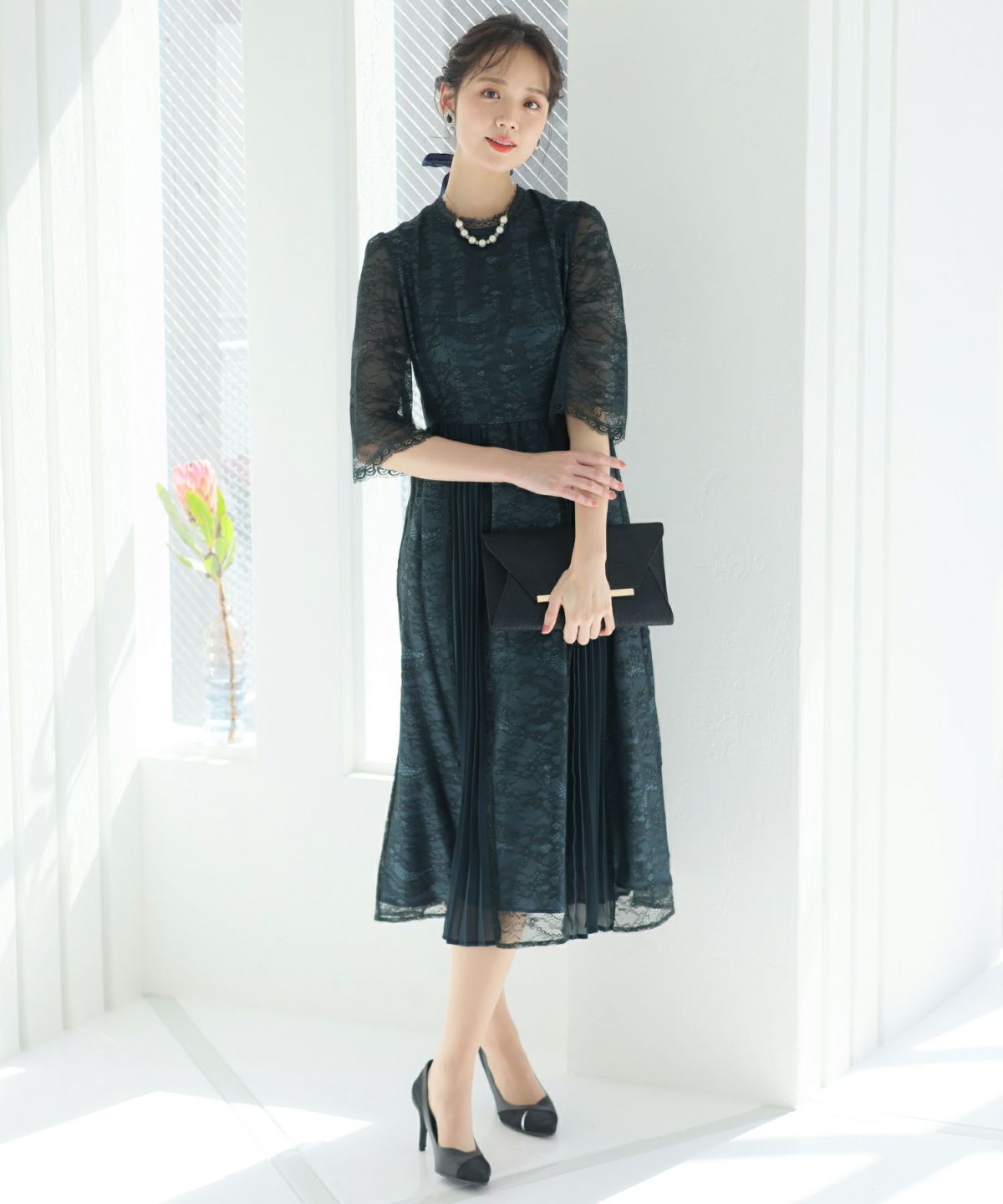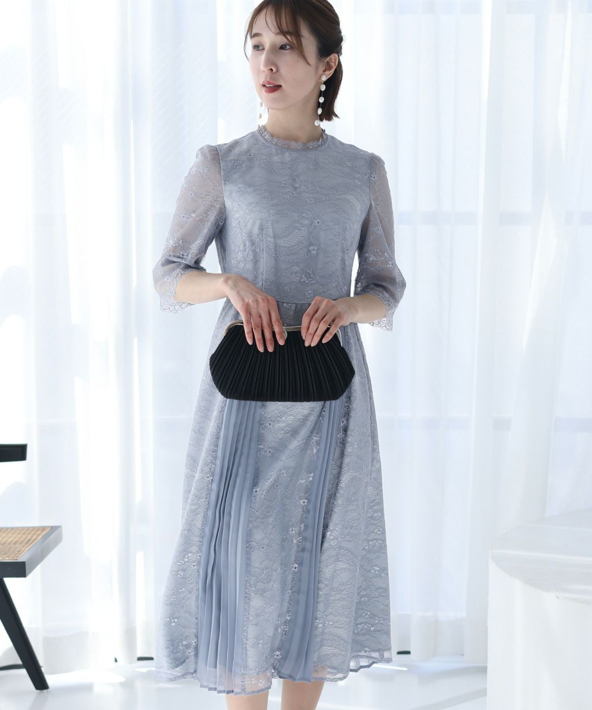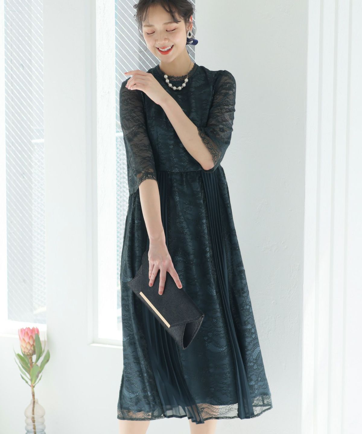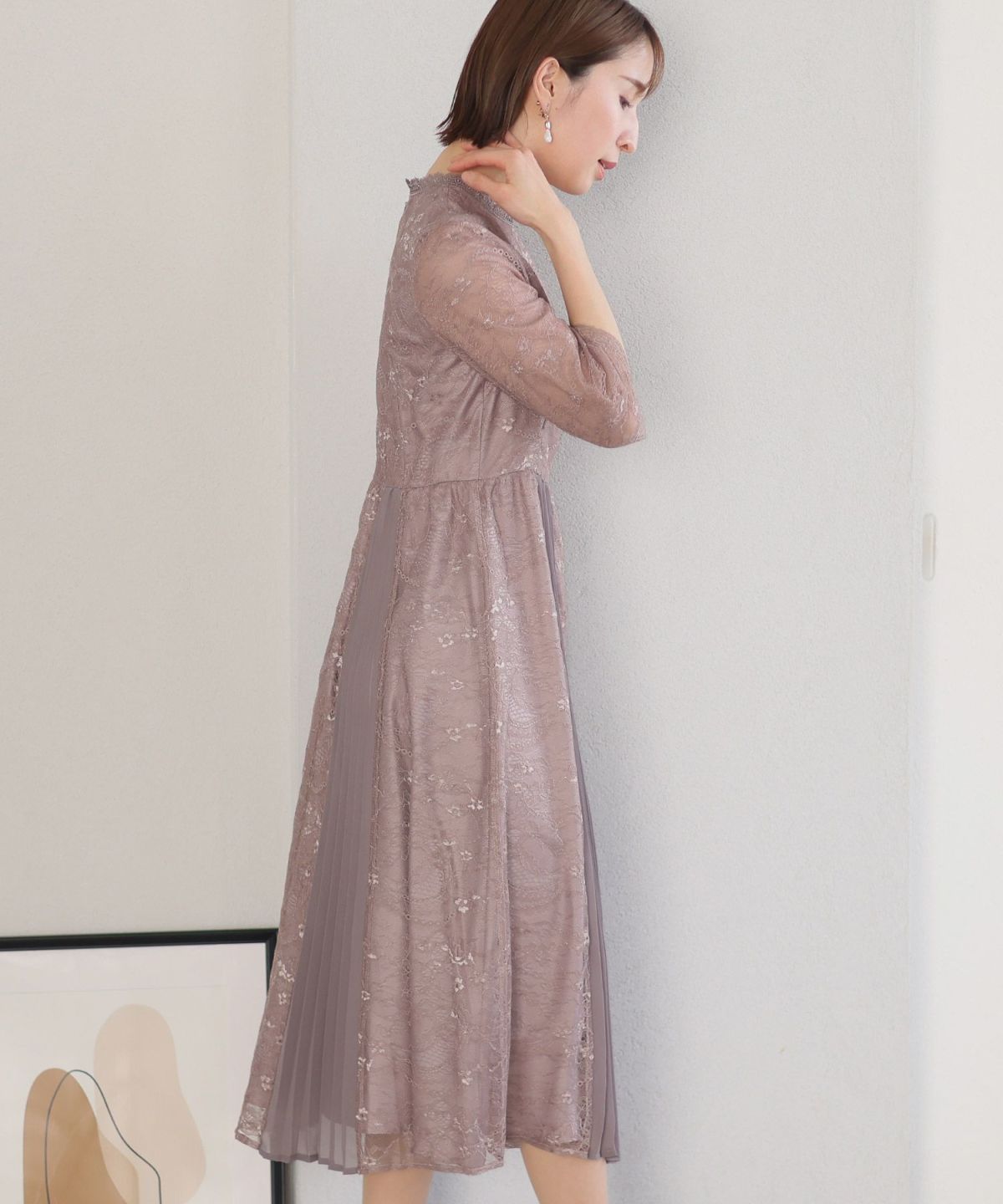 ■花柄レース×シフォンプリーツ花柄レースとシフォンプリーツの切り替えが女性らしく可愛いワンピースです。甘めのデザインですが落ち着いたカラーで大人女性にぴったり。首元には細かい刺繍がほどこされていておしゃれ。オケージョンシーンや特別なお食事会などにもおすすめです。