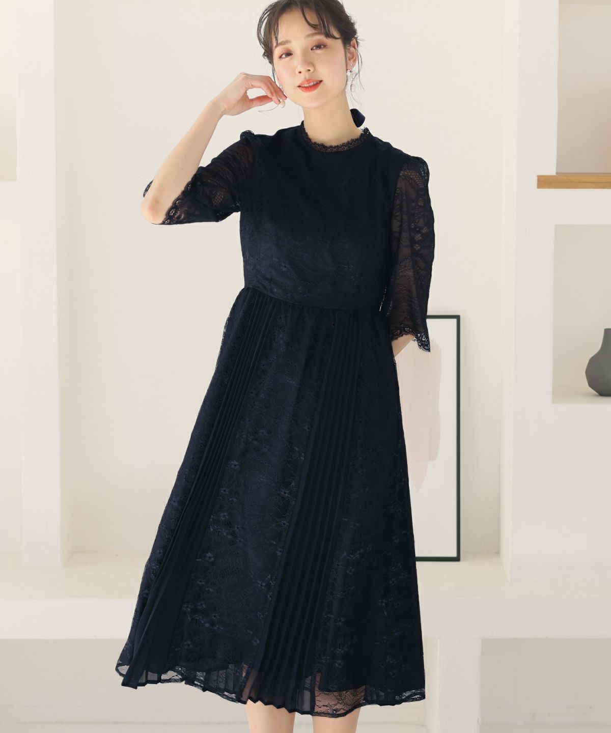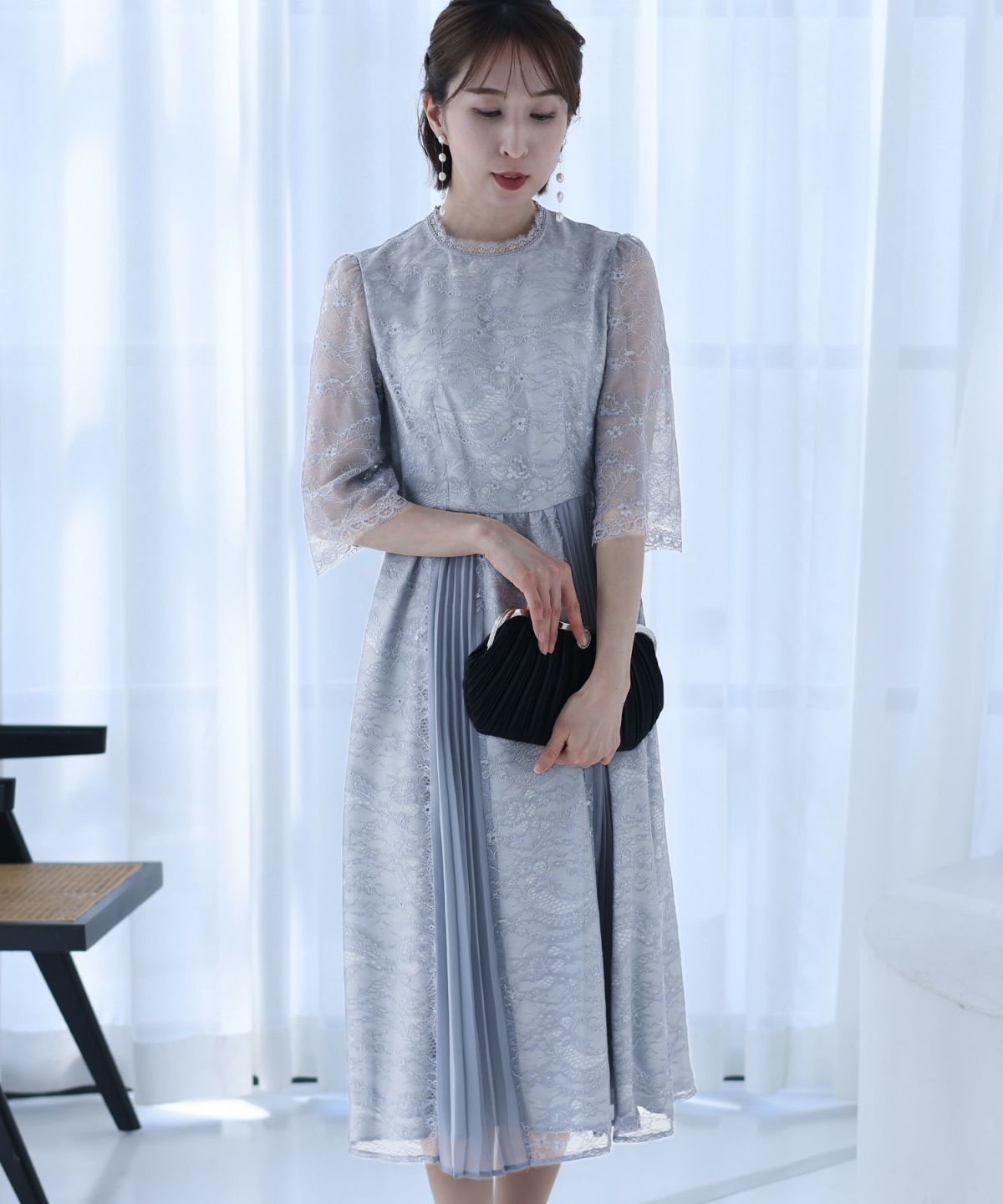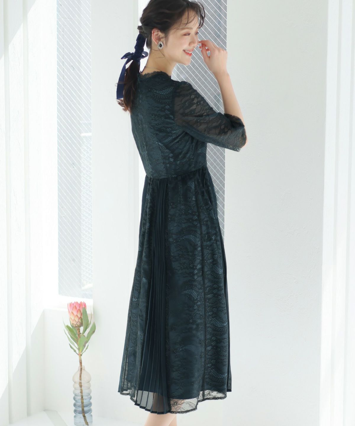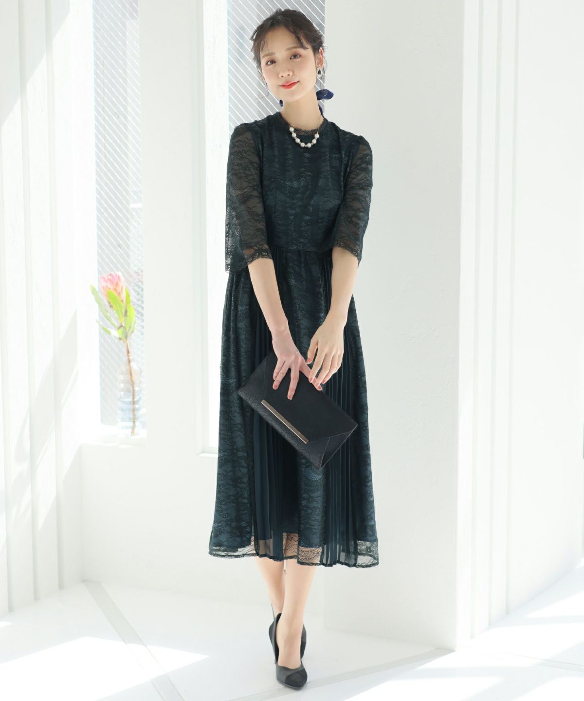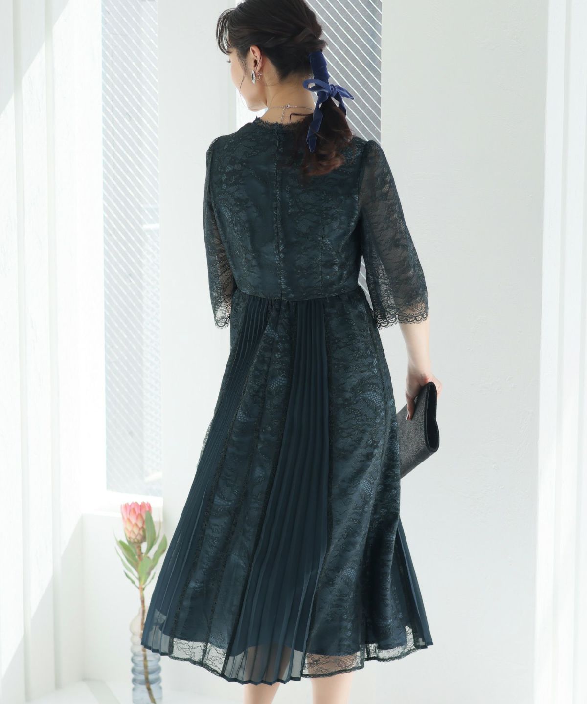■花柄レース×シフォンプリーツ花柄レースとシフォンプリーツの切り替えが女性らしく可愛いワンピースです。甘めのデザインですが落ち着いたカラーで大人女性にぴったり。首元には細かい刺繍がほどこされていておしゃれ。オケージョンシーンや特別なお食事会などにもおすすめです。