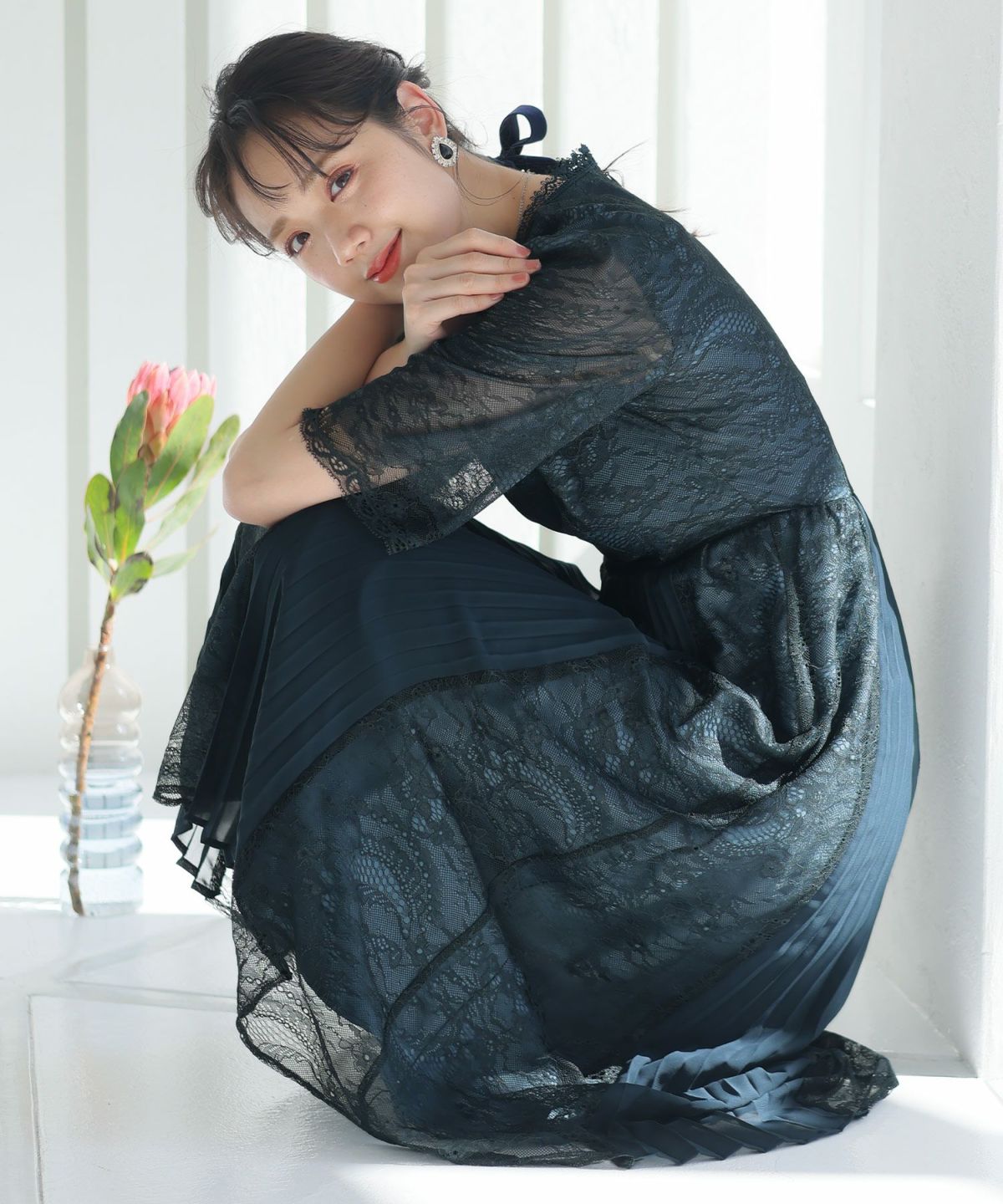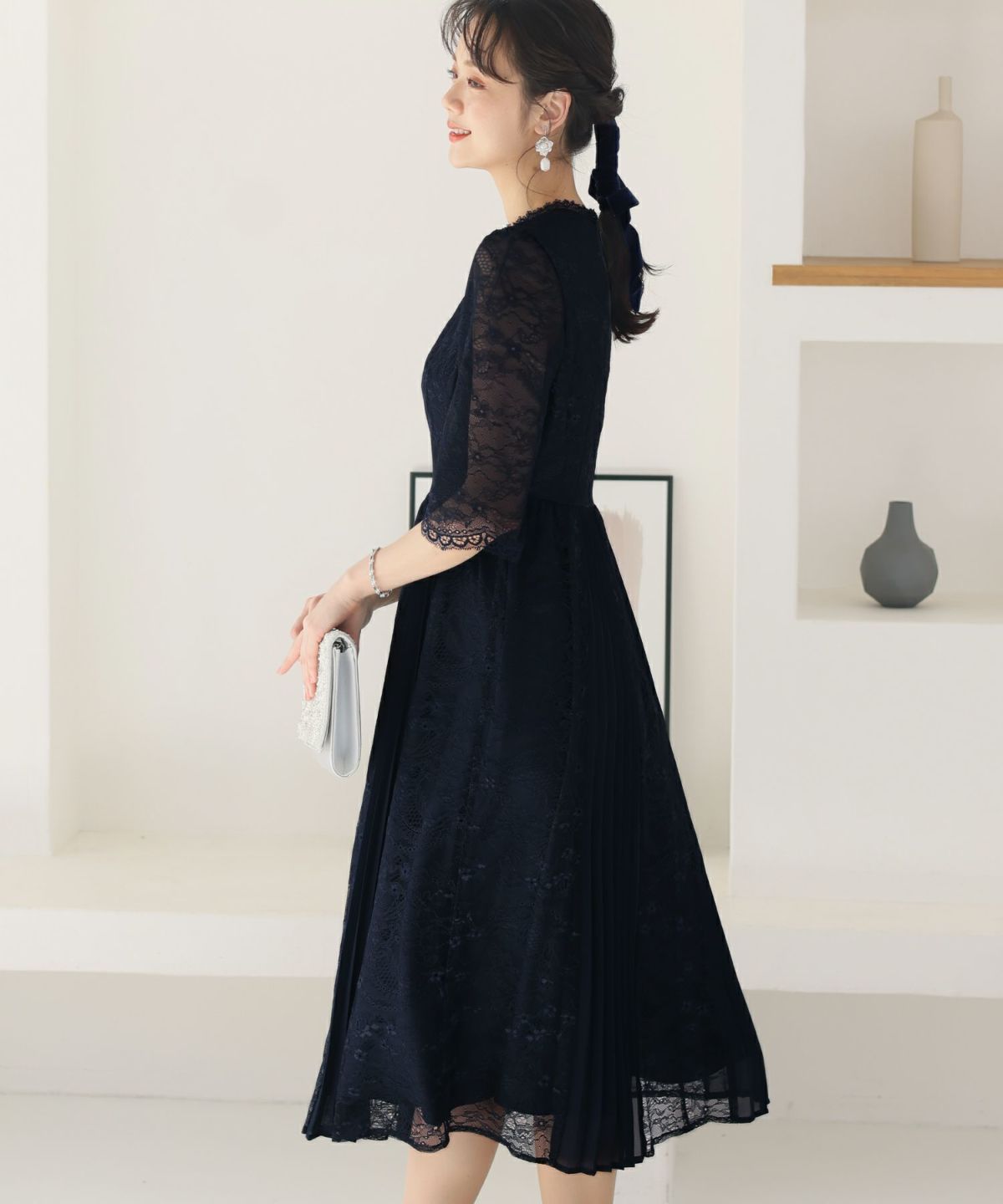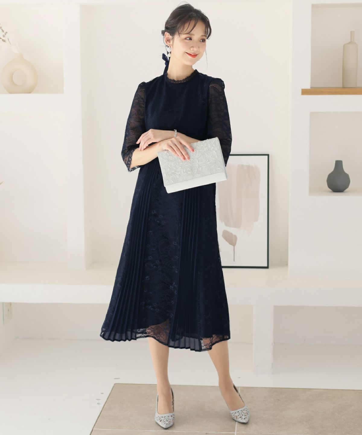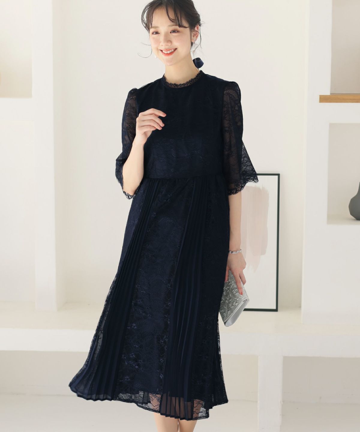 ■花柄レース×シフォンプリーツ花柄レースとシフォンプリーツの切り替えが女性らしく可愛いワンピースです。甘めのデザインですが落ち着いたカラーで大人女性にぴったり。首元には細かい刺繍がほどこされていておしゃれ。オケージョンシーンや特別なお食事会などにもおすすめです。