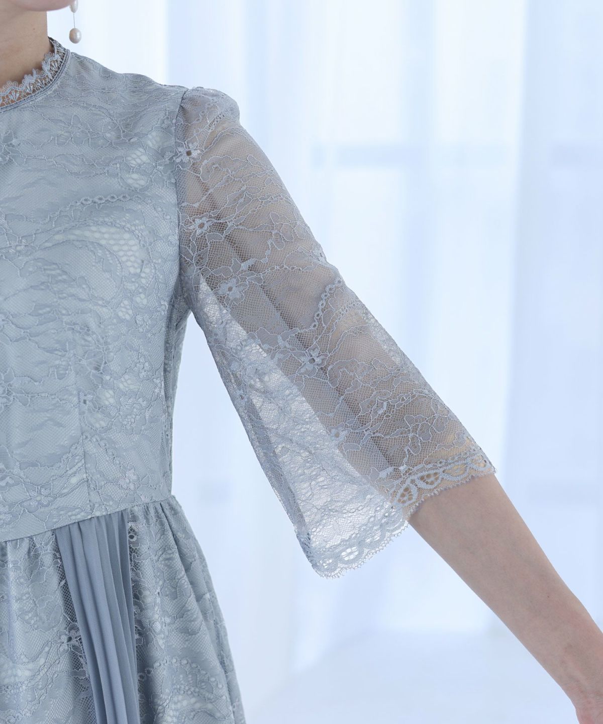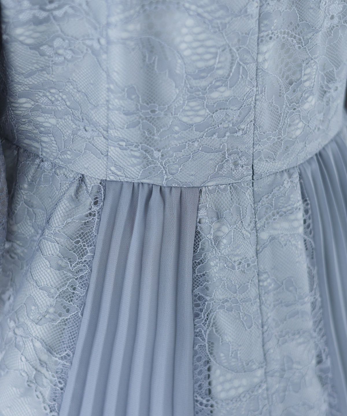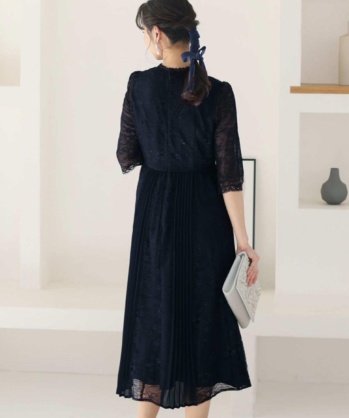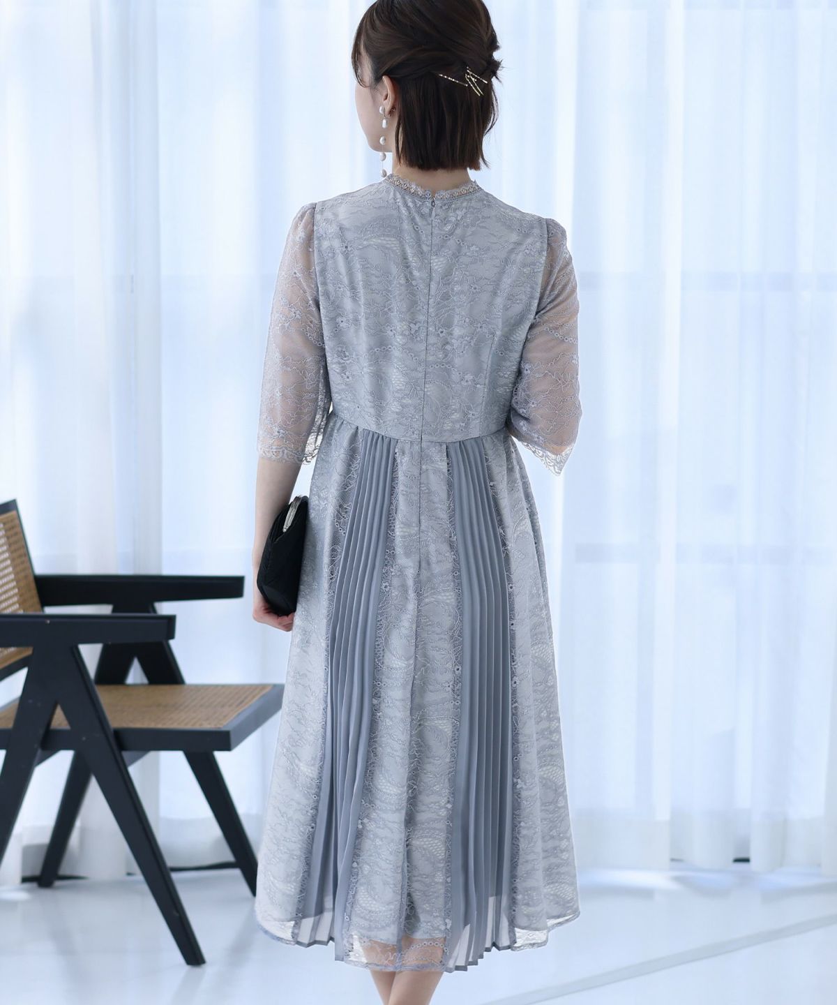 ■花柄レース×シフォンプリーツ花柄レースとシフォンプリーツの切り替えが女性らしく可愛いワンピースです。甘めのデザインですが落ち着いたカラーで大人女性にぴったり。首元には細かい刺繍がほどこされていておしゃれ。オケージョンシーンや特別なお食事会などにもおすすめです。